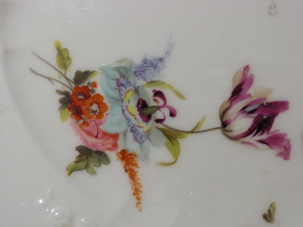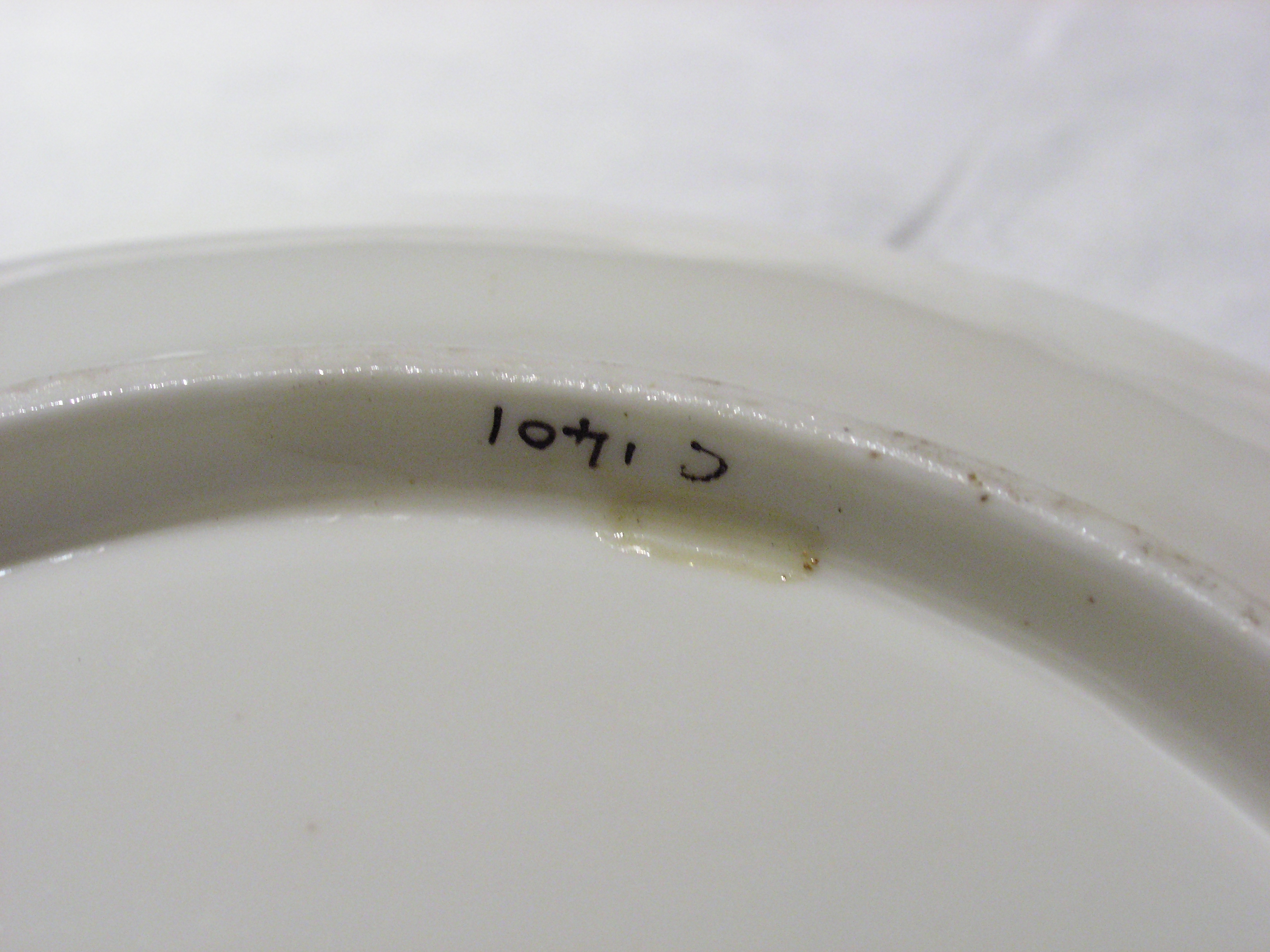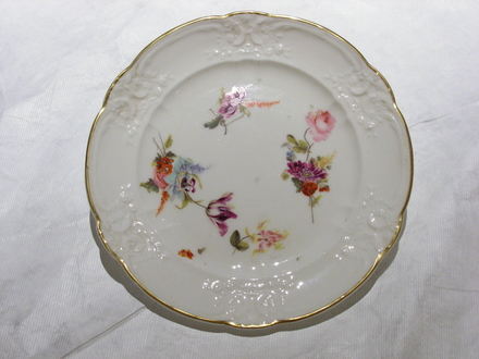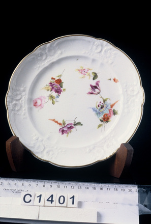 plate, porcelain, white ground, moulded design around rim, pattern of flowers in centre