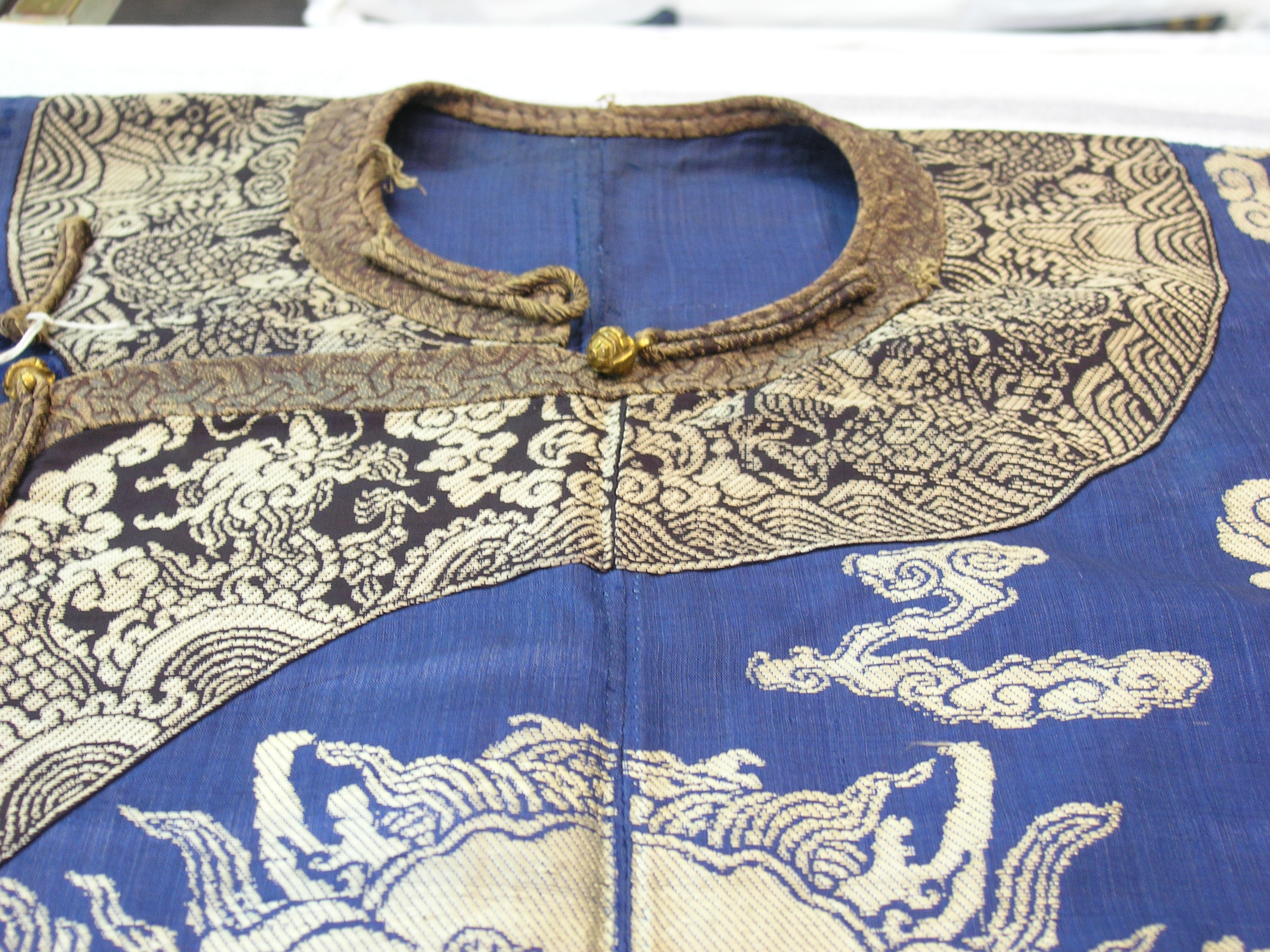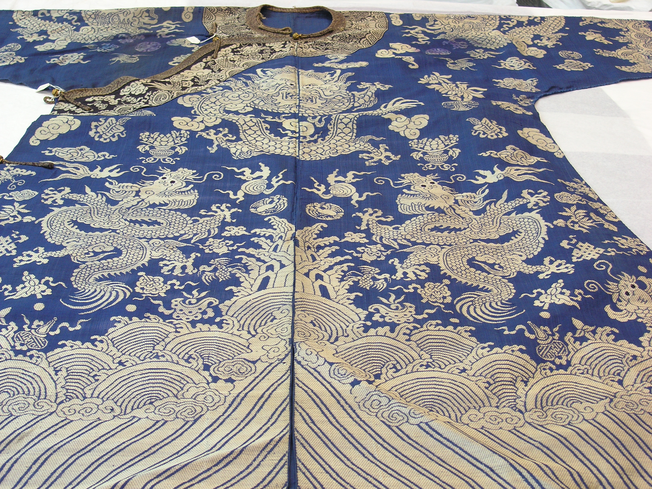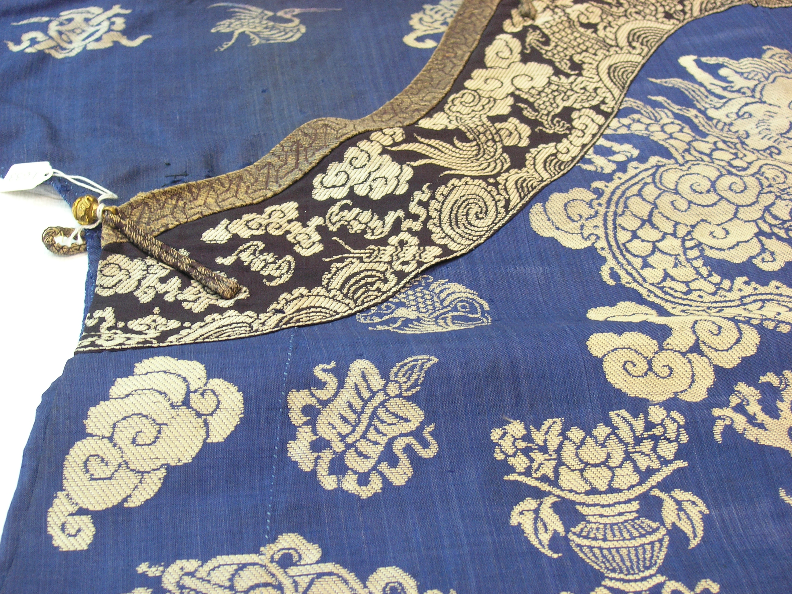 dragon robe, cotton and silk woven damask. Large dark blue robe. Fine silk weave with complete replica of dragon pattern in grey silk damask weave. [Manchu] Cuffs, facing at neck etc in damask weave. Striped arm bands, hoof cuffs.