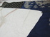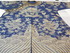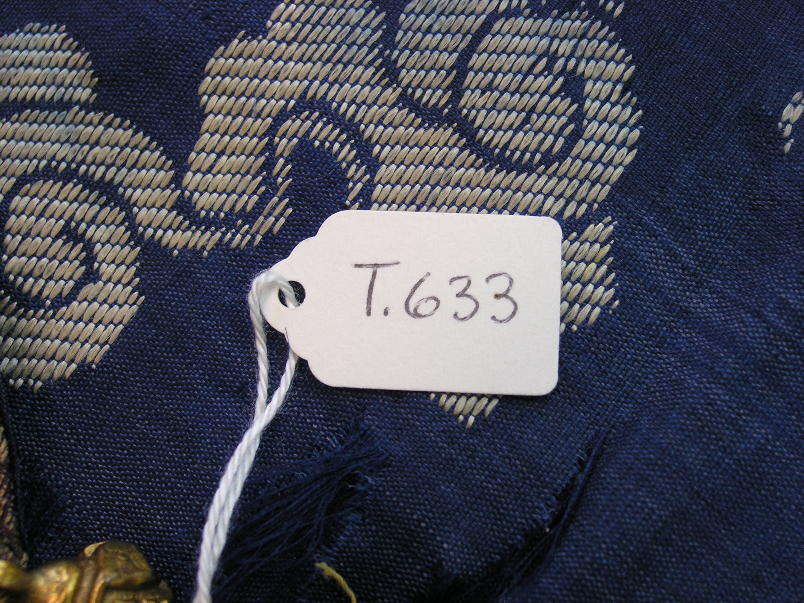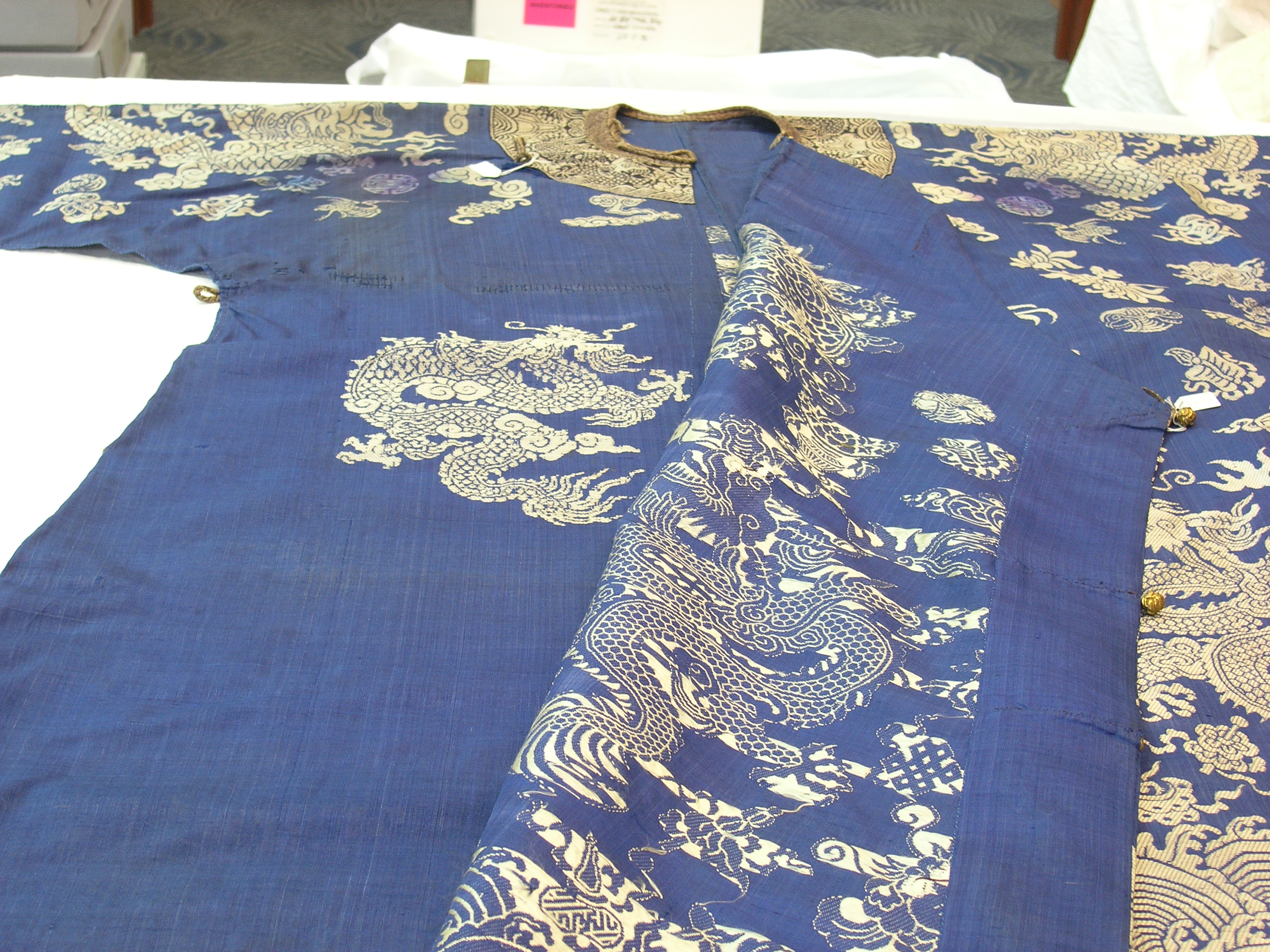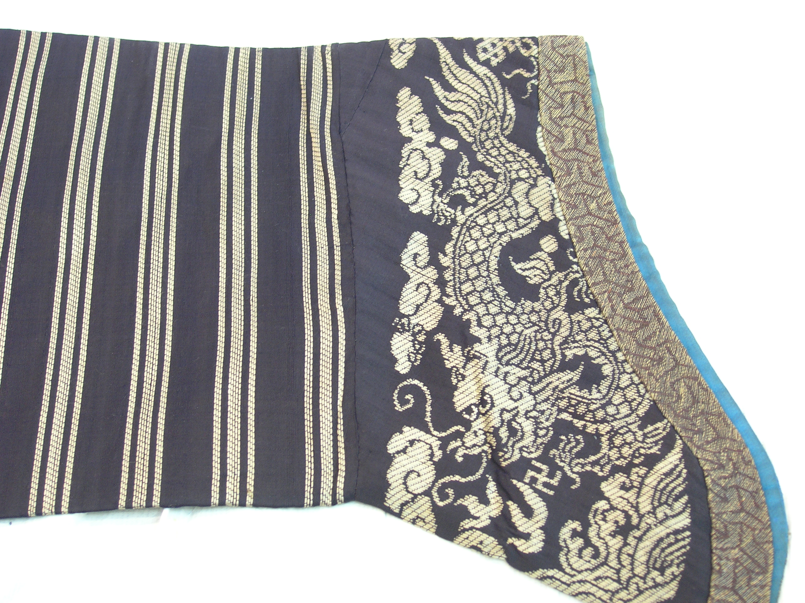 dragon robe, cotton and silk woven damask. Large dark blue robe. Fine silk weave with complete replica of dragon pattern in grey silk damask weave. [Manchu] Cuffs, facing at neck etc in damask weave. Striped arm bands, hoof cuffs.