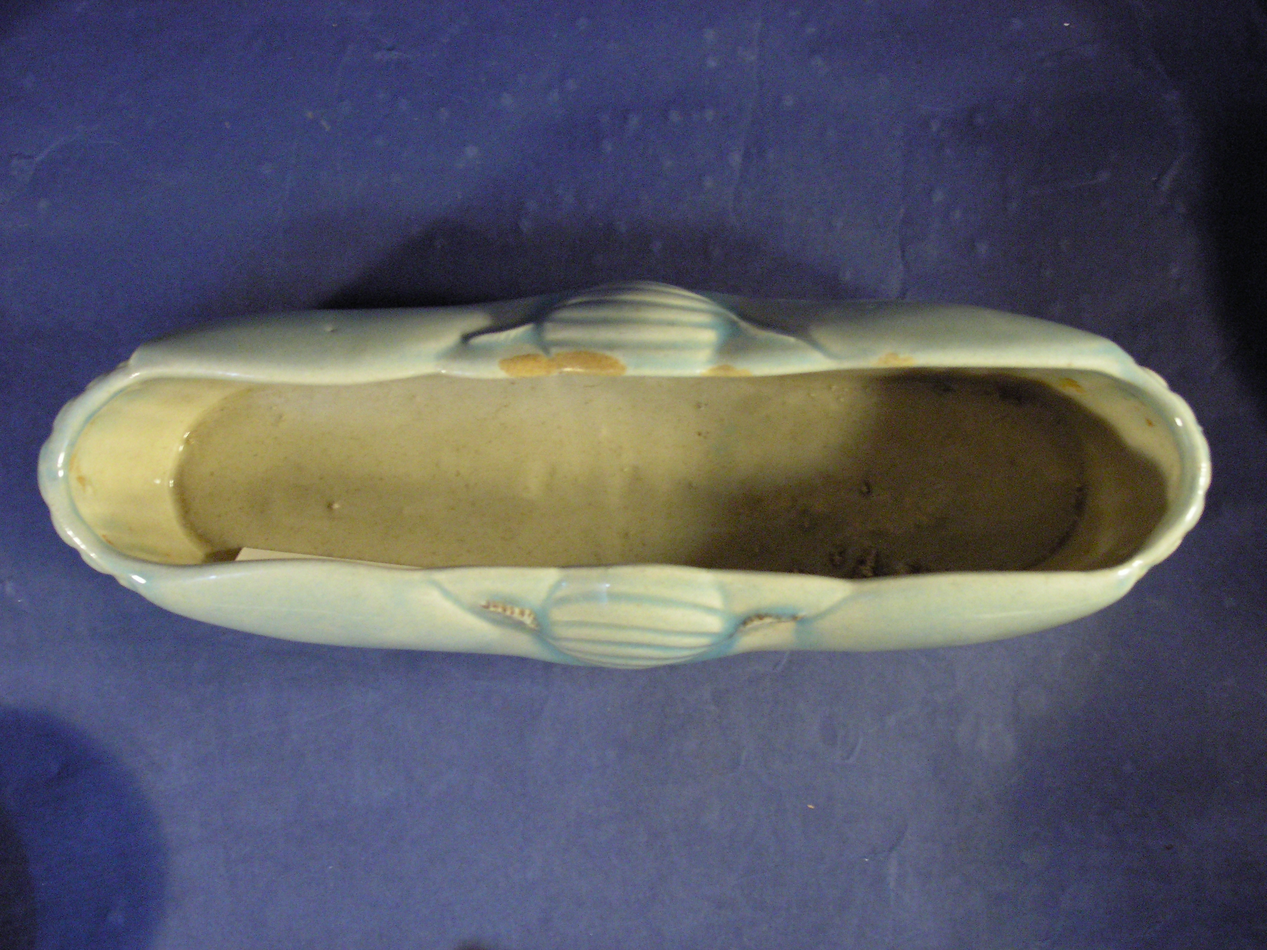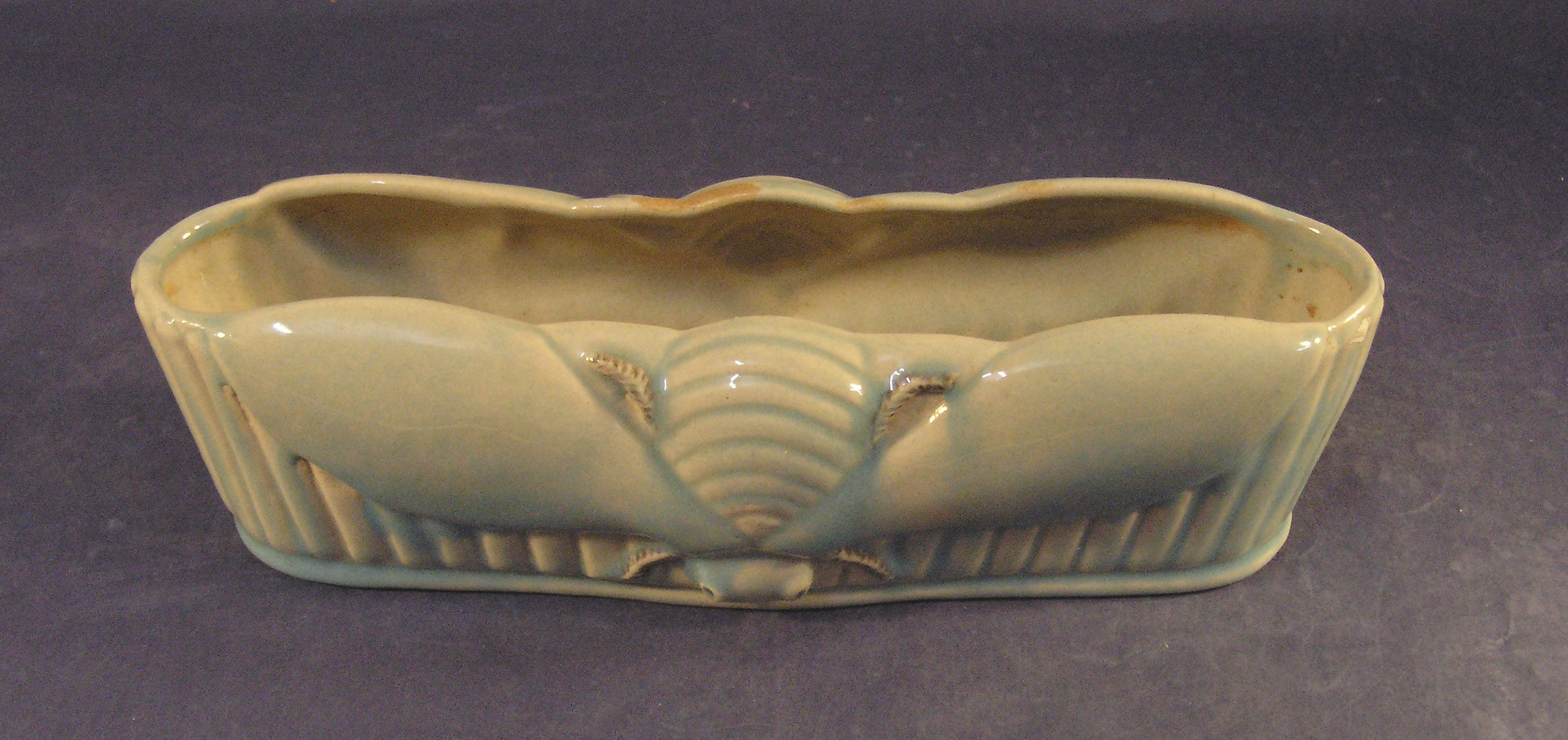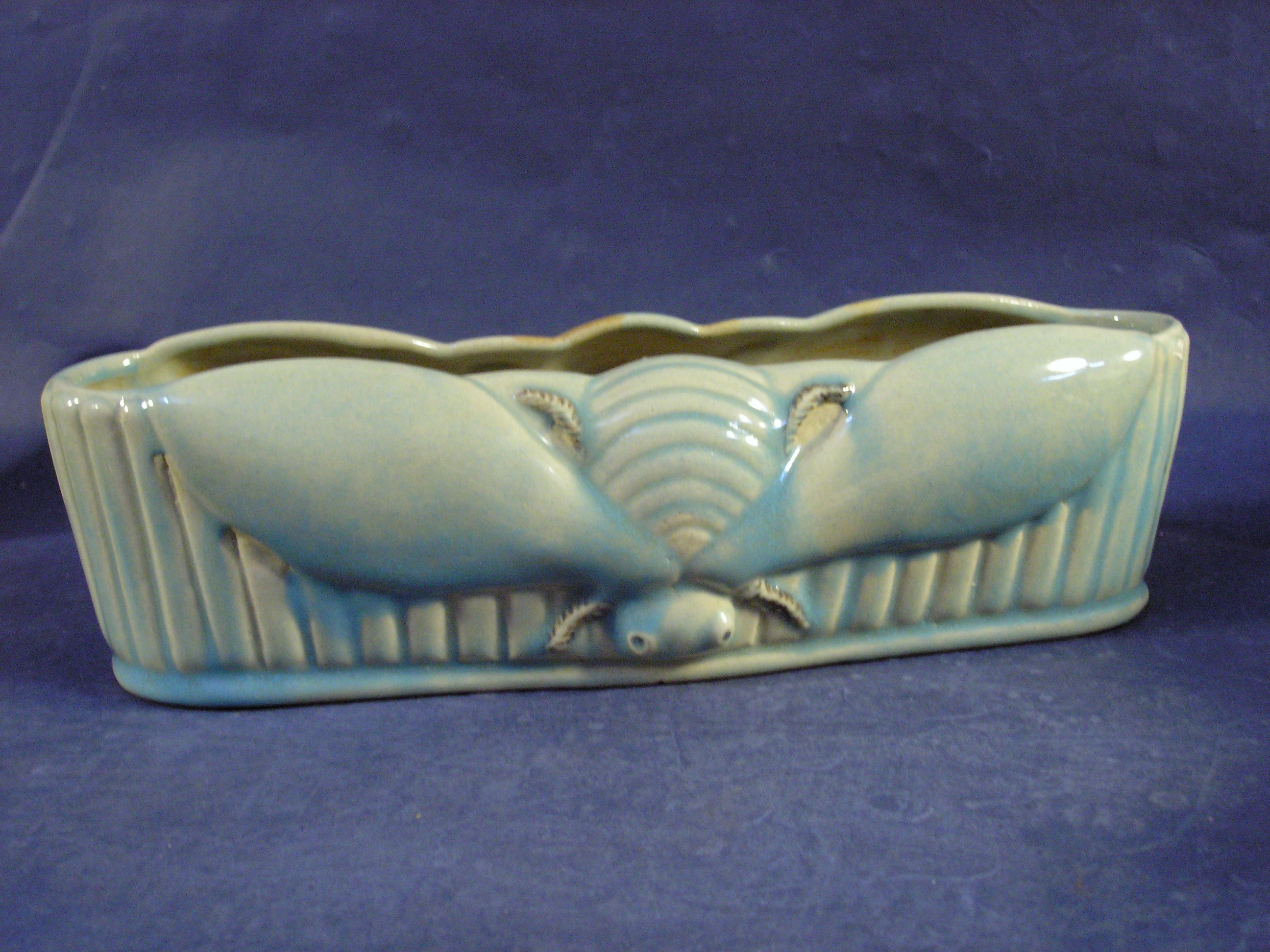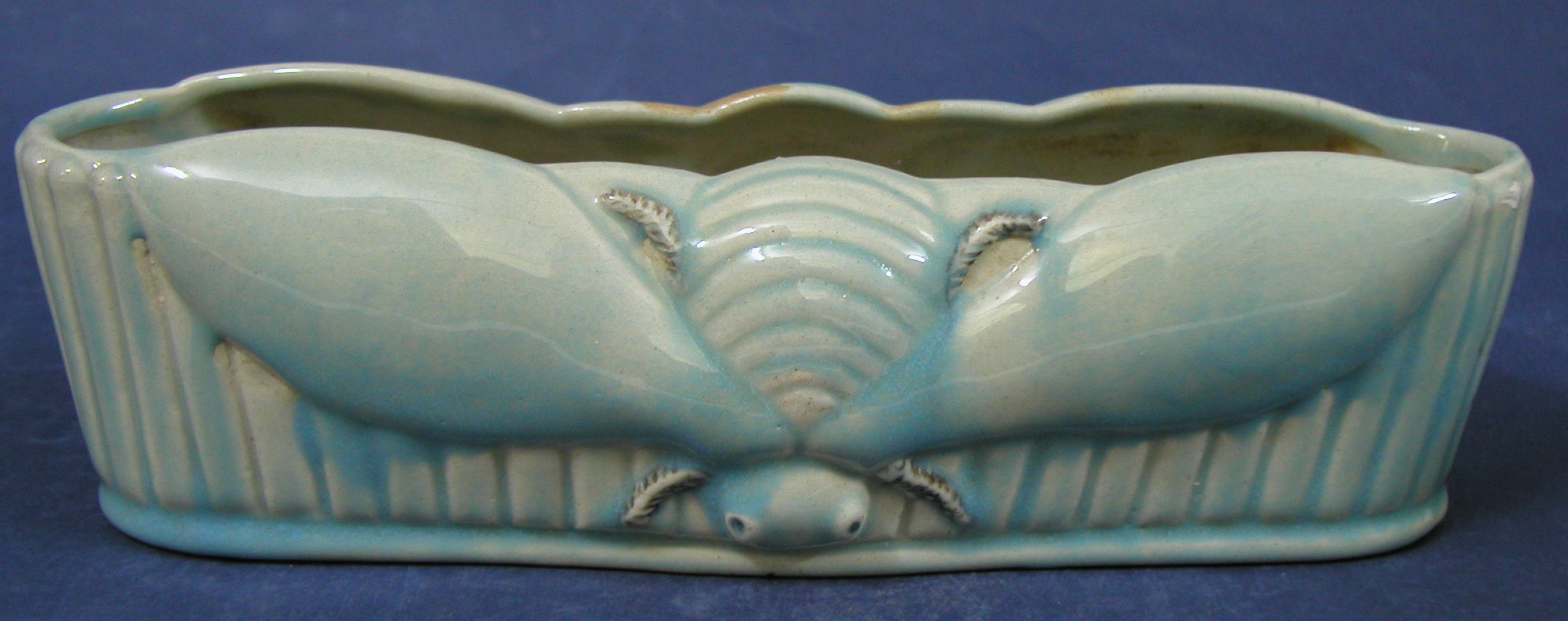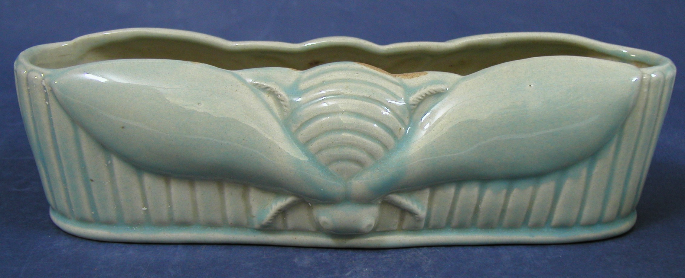 log shaped vase, blue glaze with bee [moth] motif