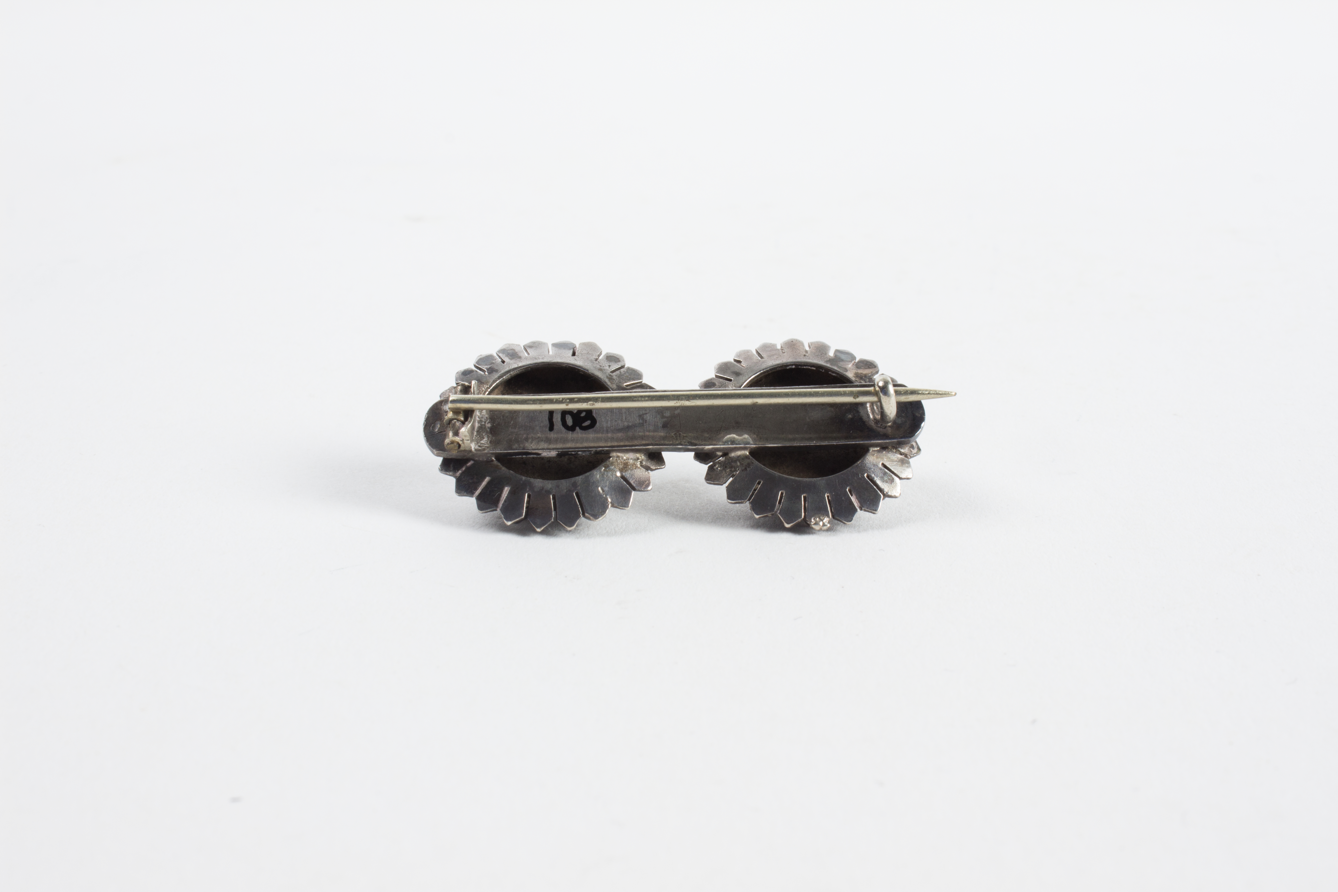 Brooch in the shape of two flowers joined by a bar at the back; part of collection of articles brought to N.Z. by Mr & Mrs Francis Tapp who arrived in Auckland by the troopship 'Oriental Queen' on September 17th 1849.