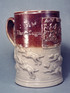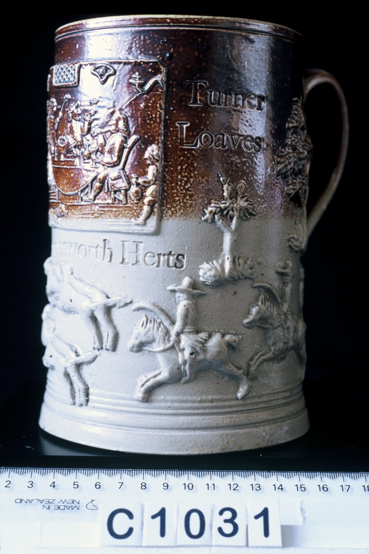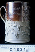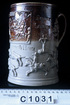 Apart from the Dwight pottery there were other potteries making brown glaze saltware in London. The relief moulded mug shows William Hogarth’s (1697-1764) ‘Midnight Modern Conversation’, a very popular subject found on mugs and jugs of this type. It has a stamped inscription for ‘Richard Turner’ of the ‘Three Sugar Loaves’ in Rickmansworth.