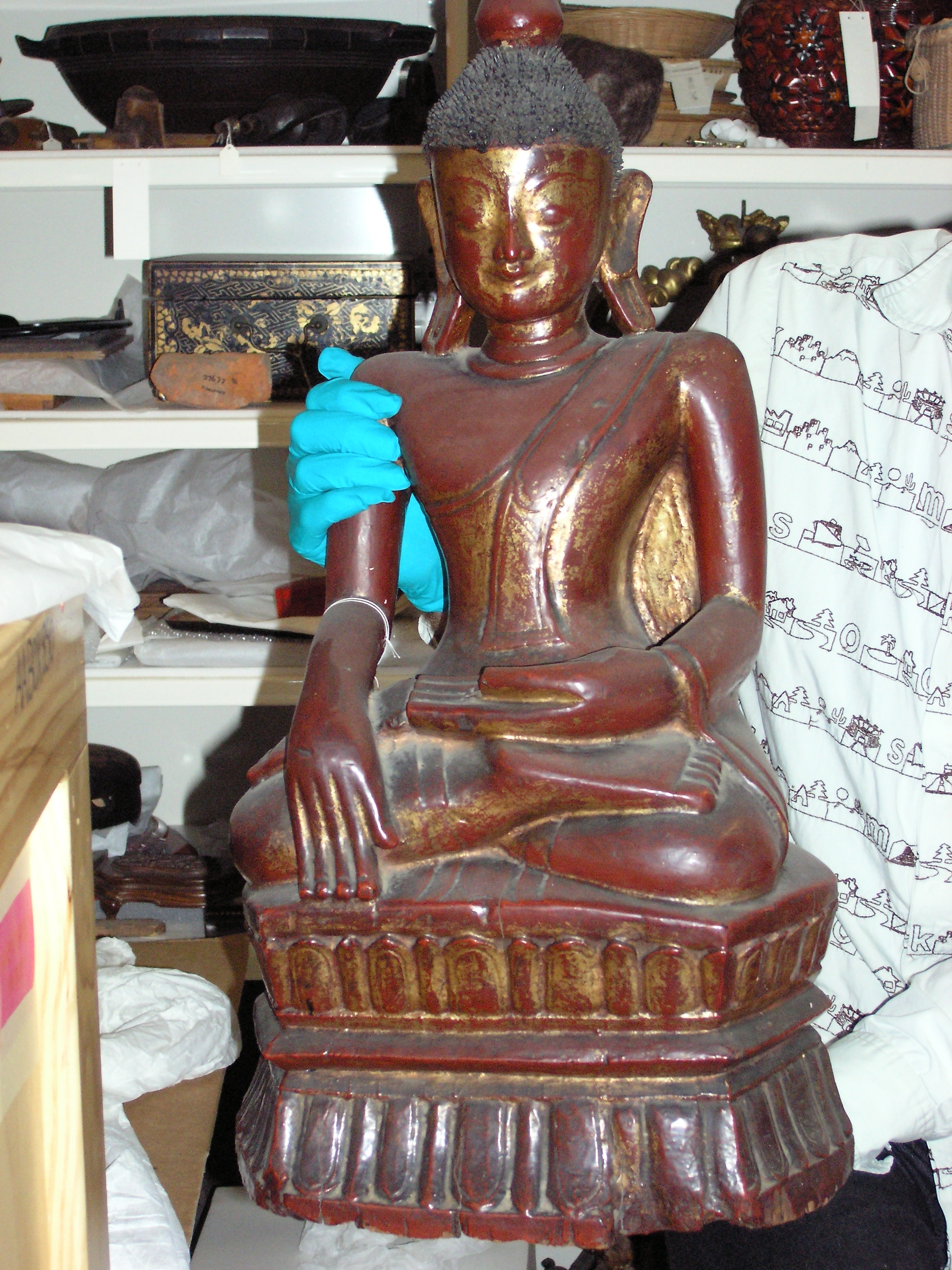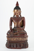 buddha figure sitting in lotus with one hand open on lap and the other facing down over knee, red lacquer on wood with remnants of gilding