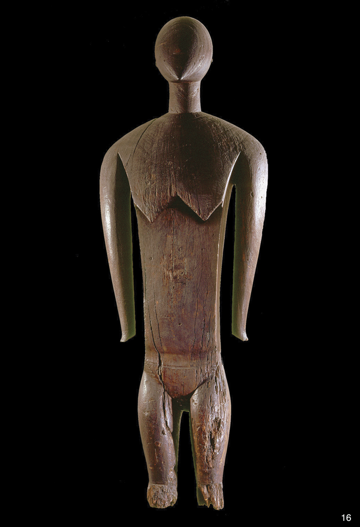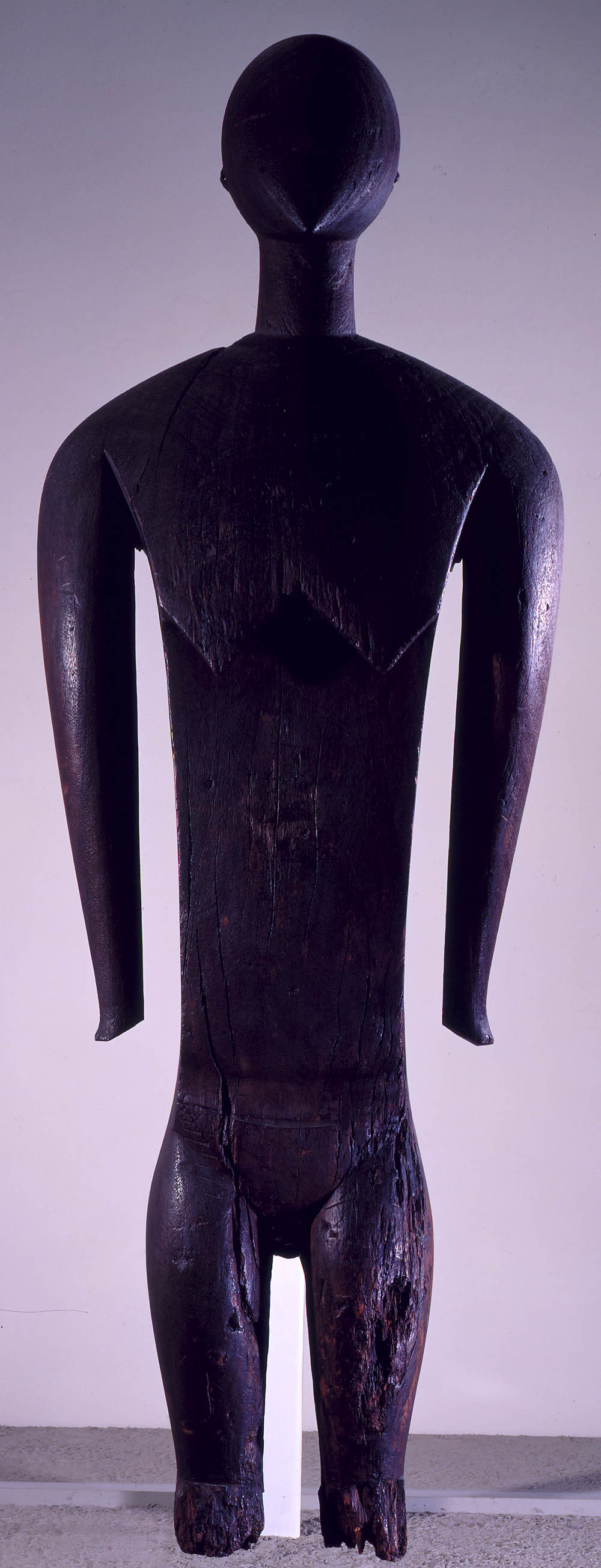Wooden image named Kawe de Hine Aligi, a god image from Nukuoro, a Polynesian outlier atoll in the Caroline Islands. The surrounding peoples are basically matrilineal and this influence could be apparent in this, the largest figure from the group. About a dozen other figures are known, ranging in size from five feet to fifteen inches. Most are small.