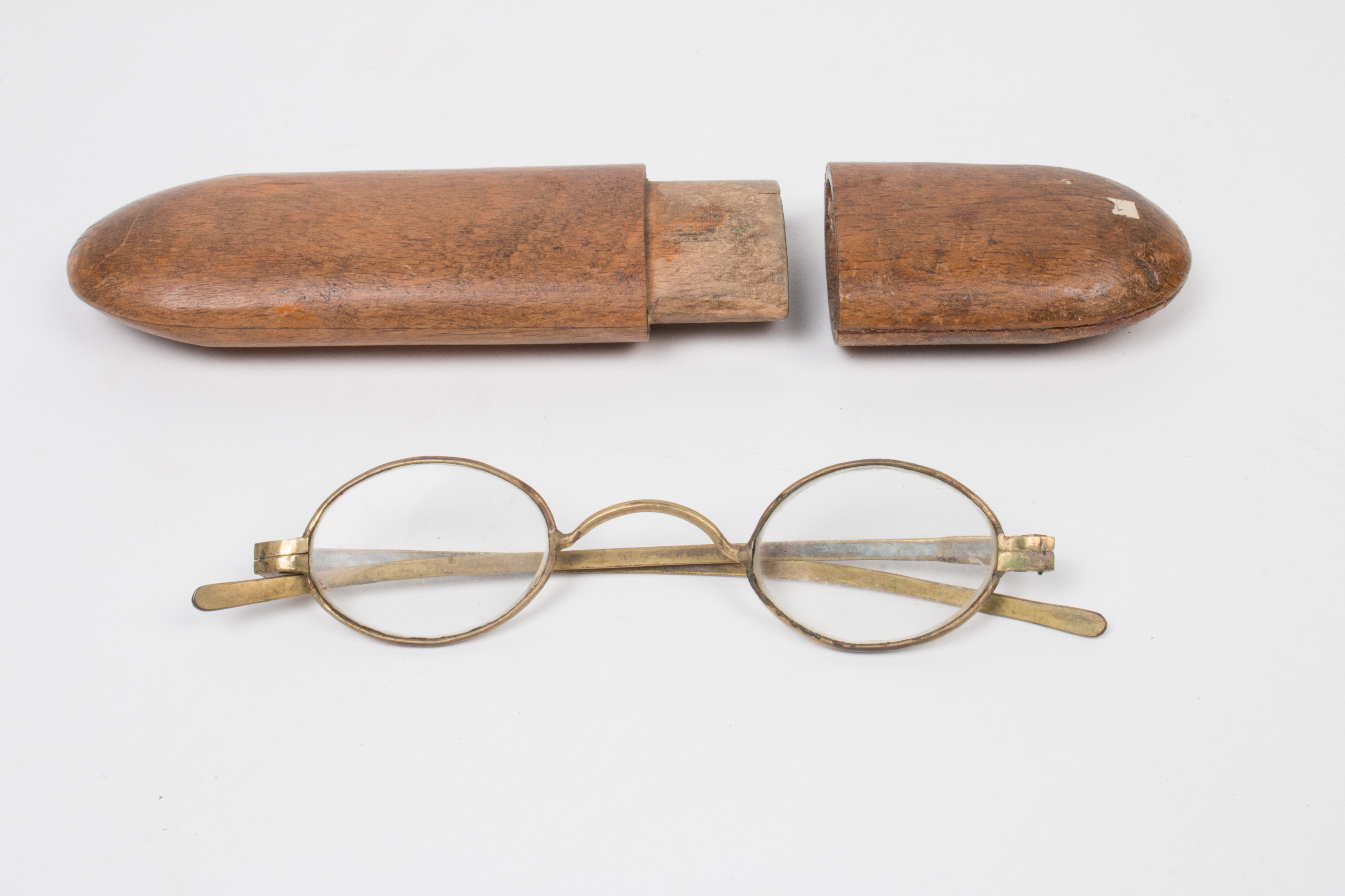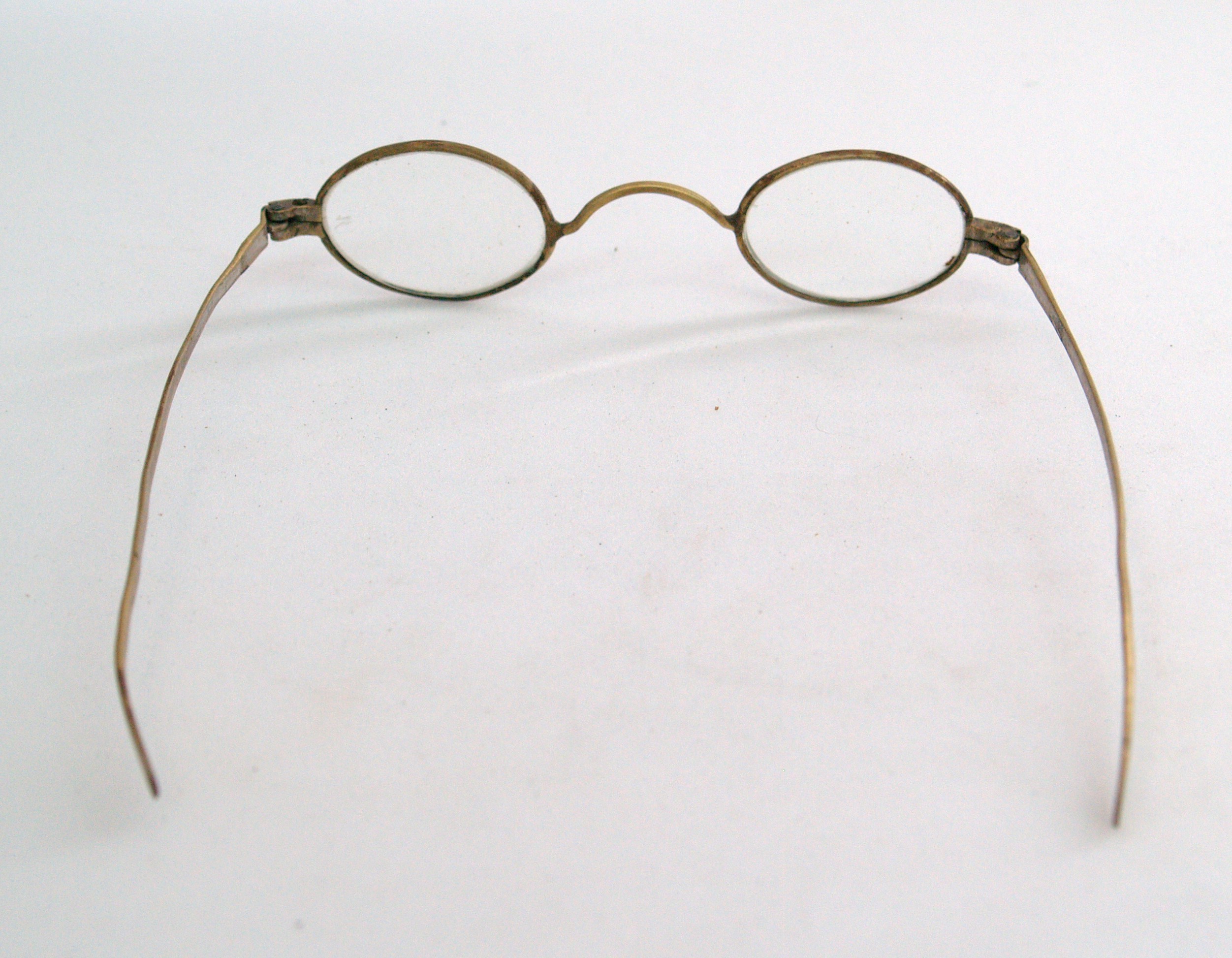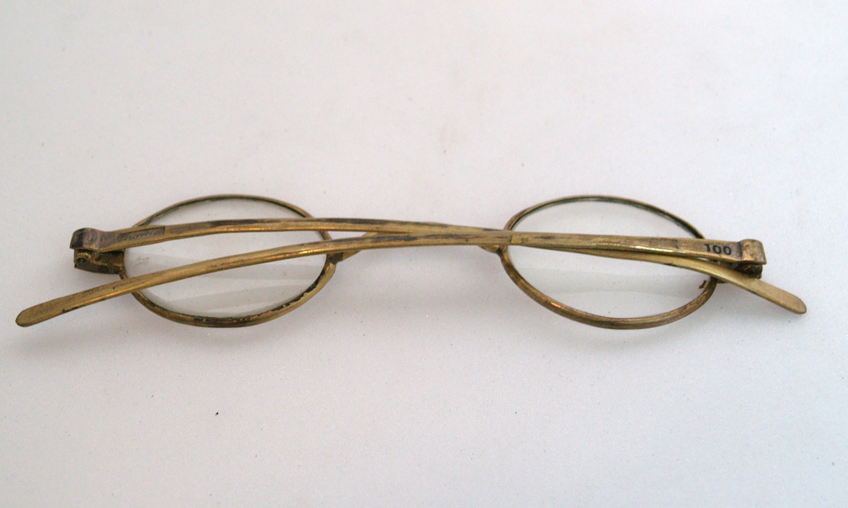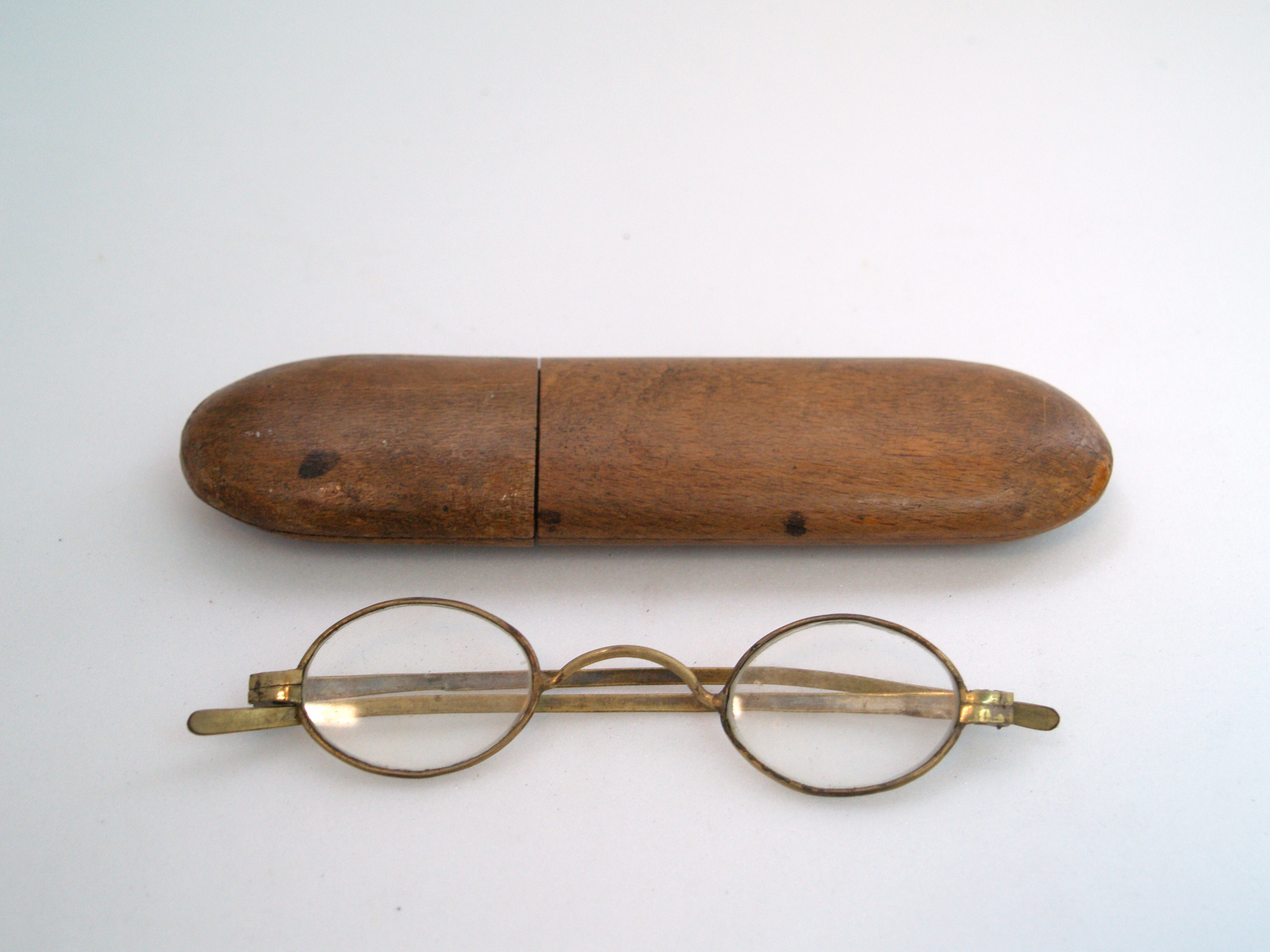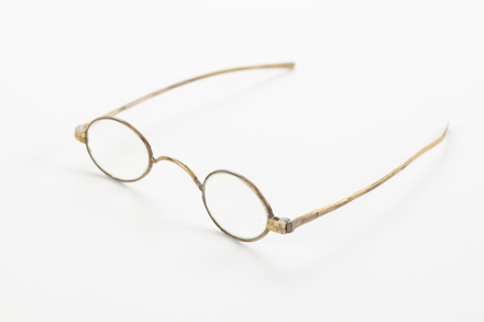 steel-rimmed gilt glasses, with round lenses; gilt is worn in some places; glasses are housed in a oblong wooden case with detachable lid; glasses and case part of a collection brought to New Zealand by Mr & Mrs Francis Tapp who arrived in Auckland by the troopship 'Oriental Queen' on September 17th 1849.