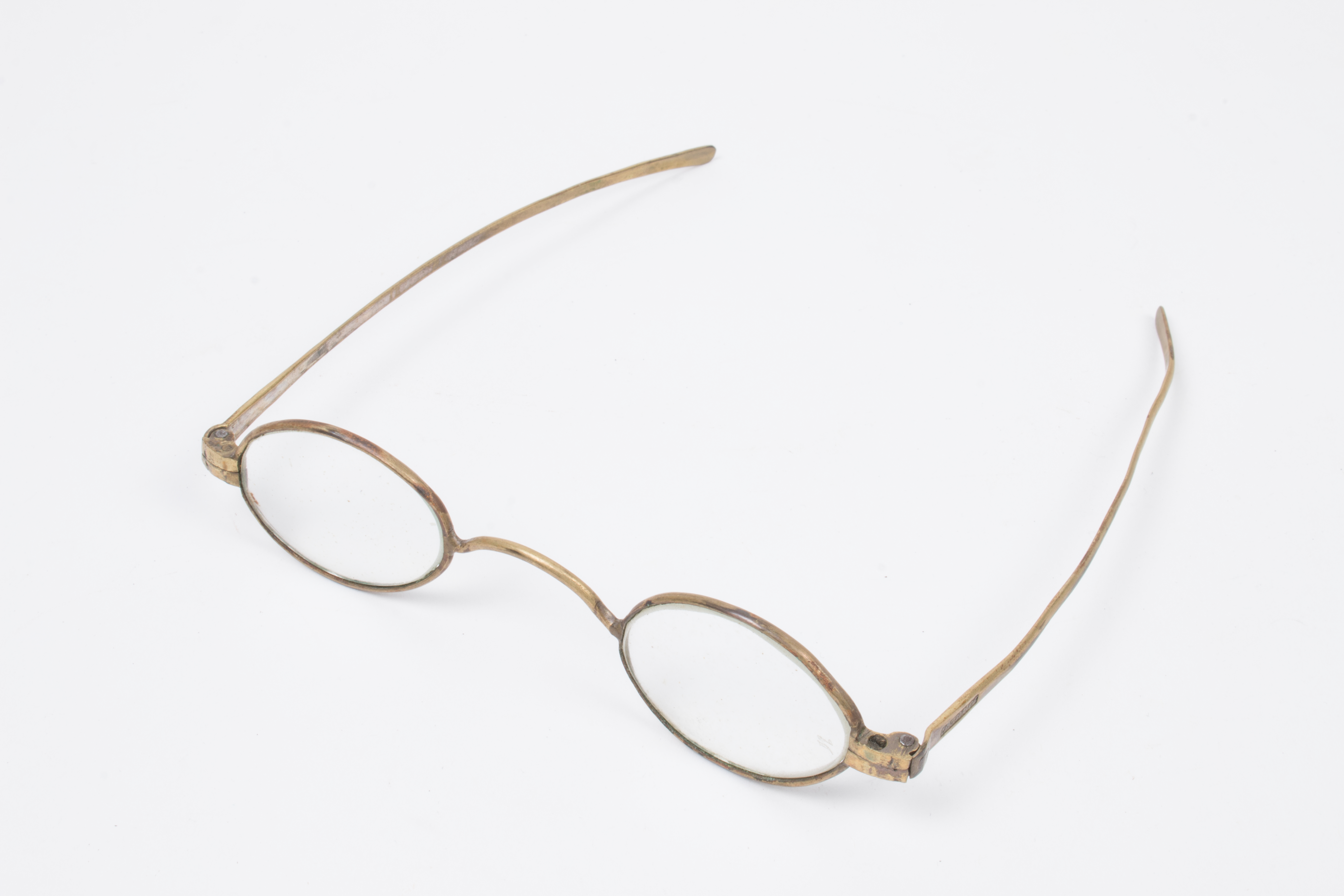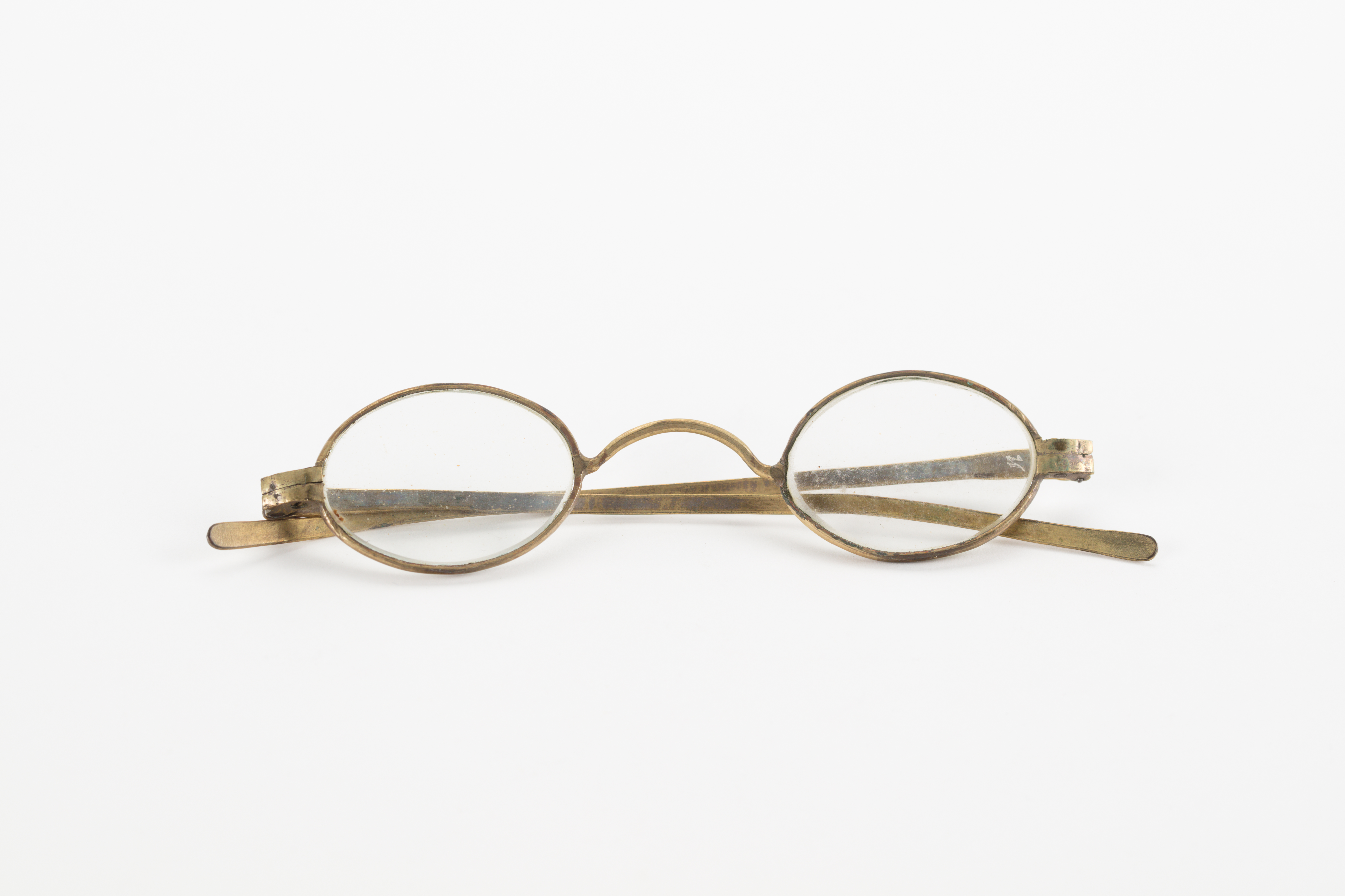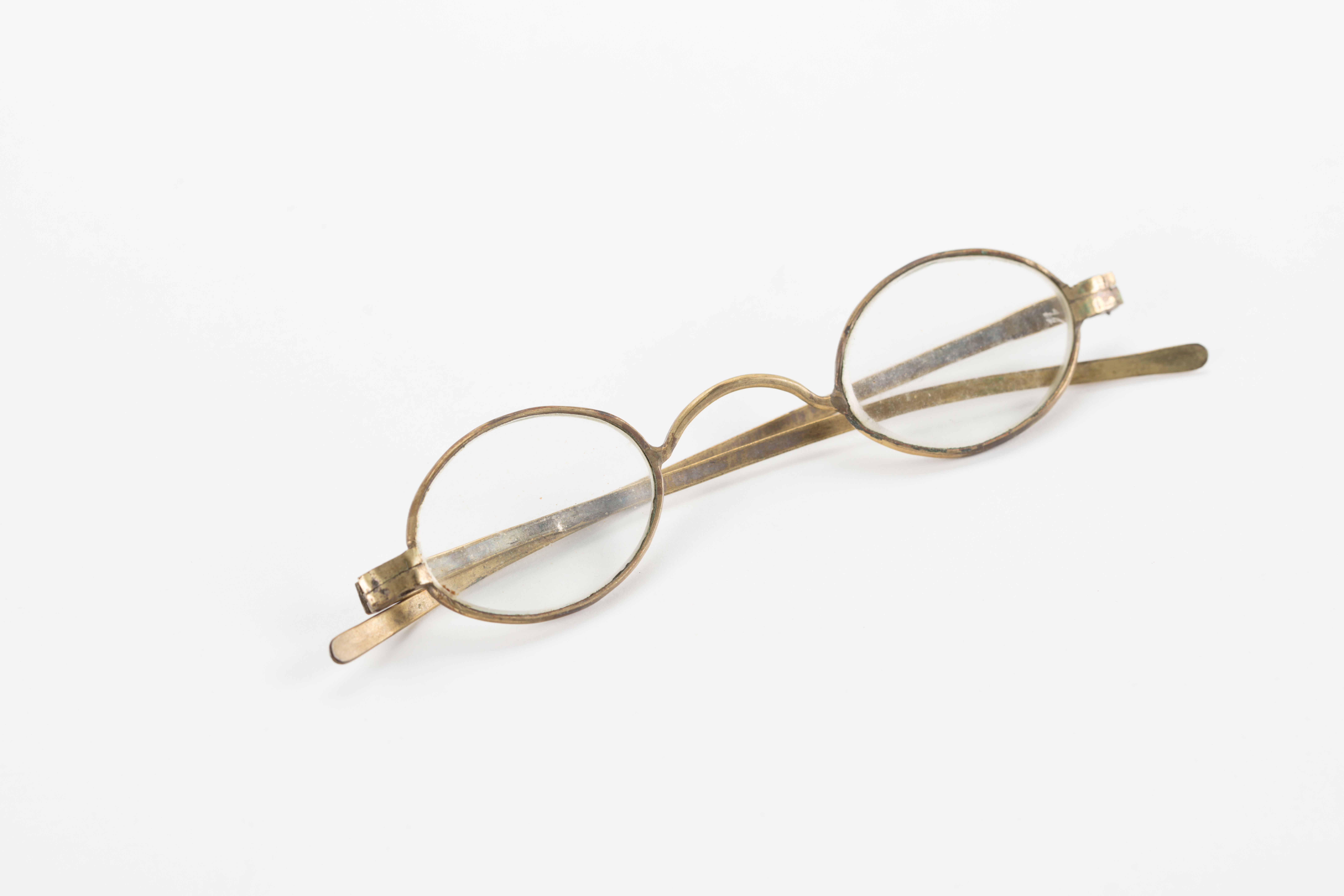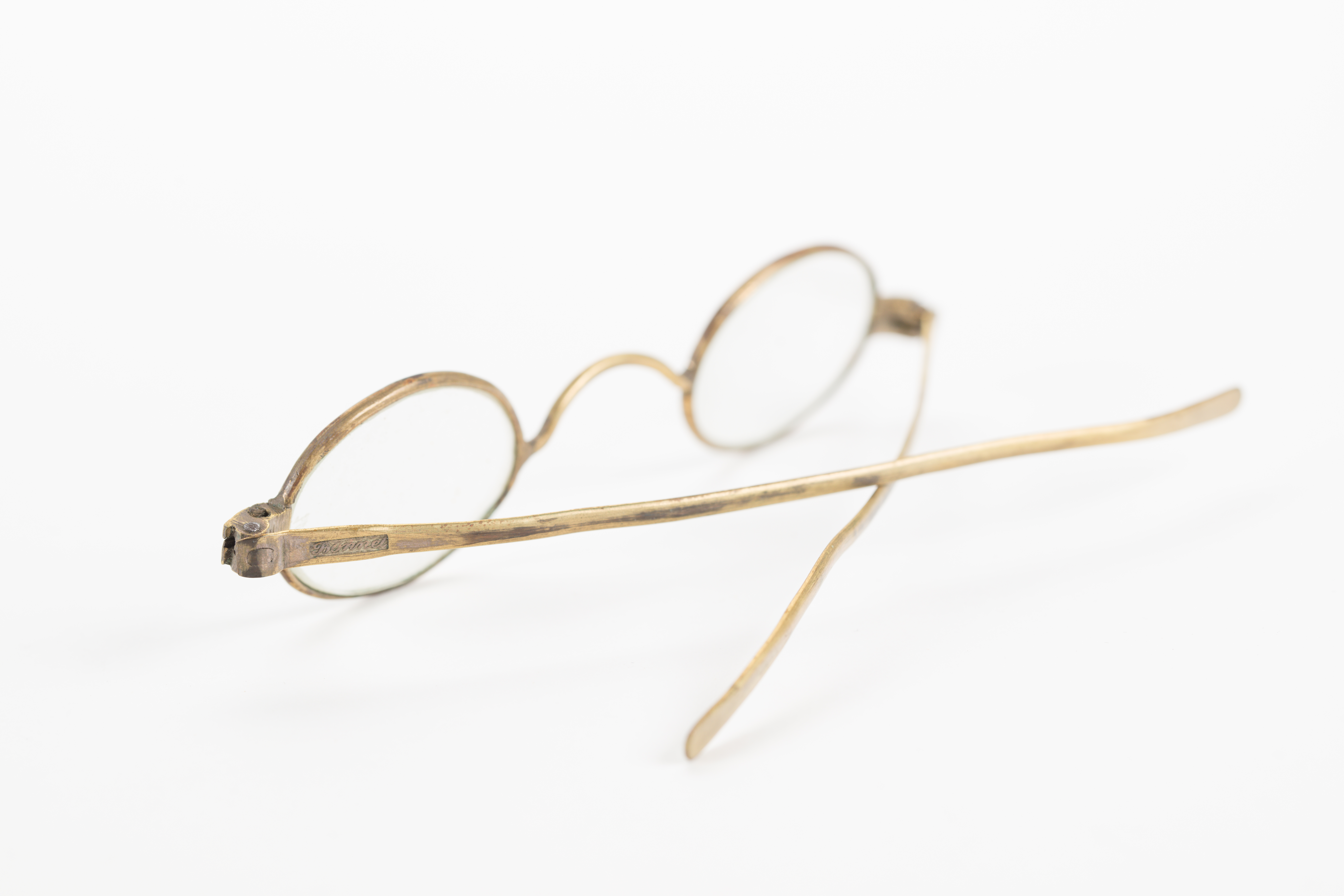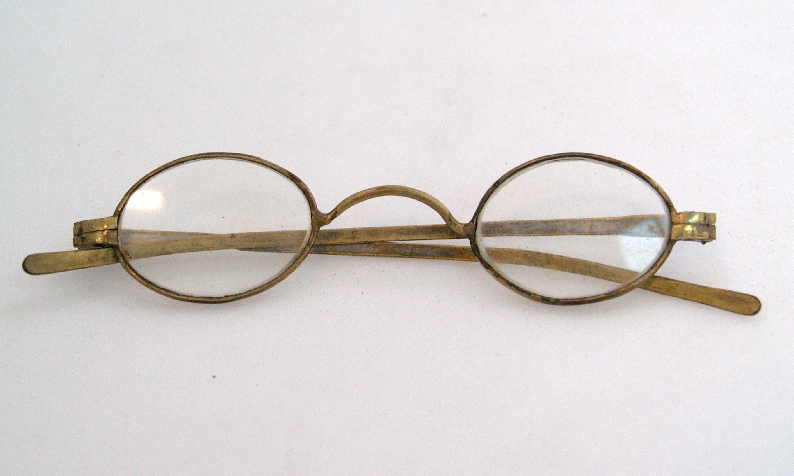 steel-rimmed gilt glasses, with round lenses; gilt is worn in some places; glasses are housed in a oblong wooden case with detachable lid; glasses and case part of a collection brought to New Zealand by Mr & Mrs Francis Tapp who arrived in Auckland by the troopship 'Oriental Queen' on September 17th 1849.