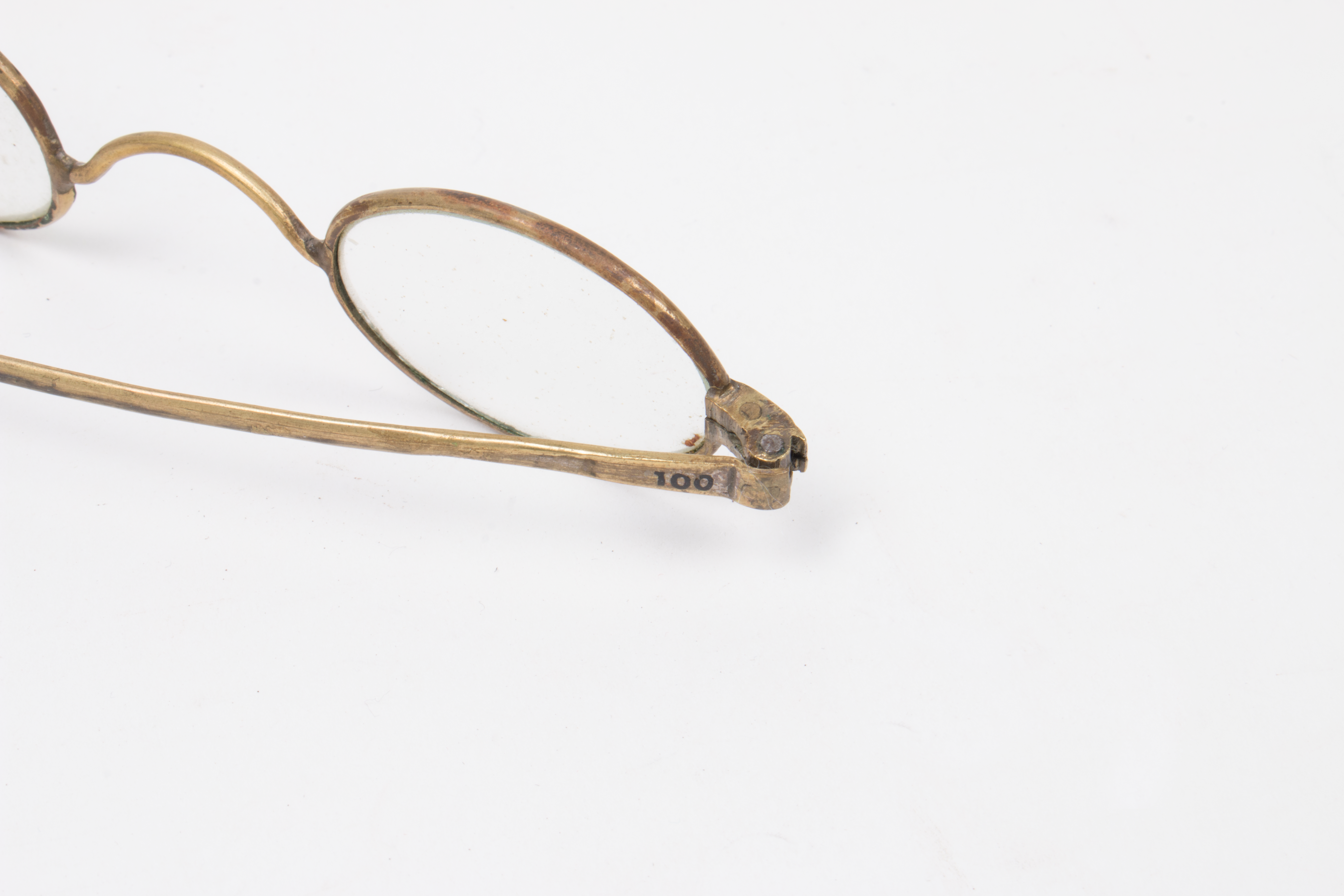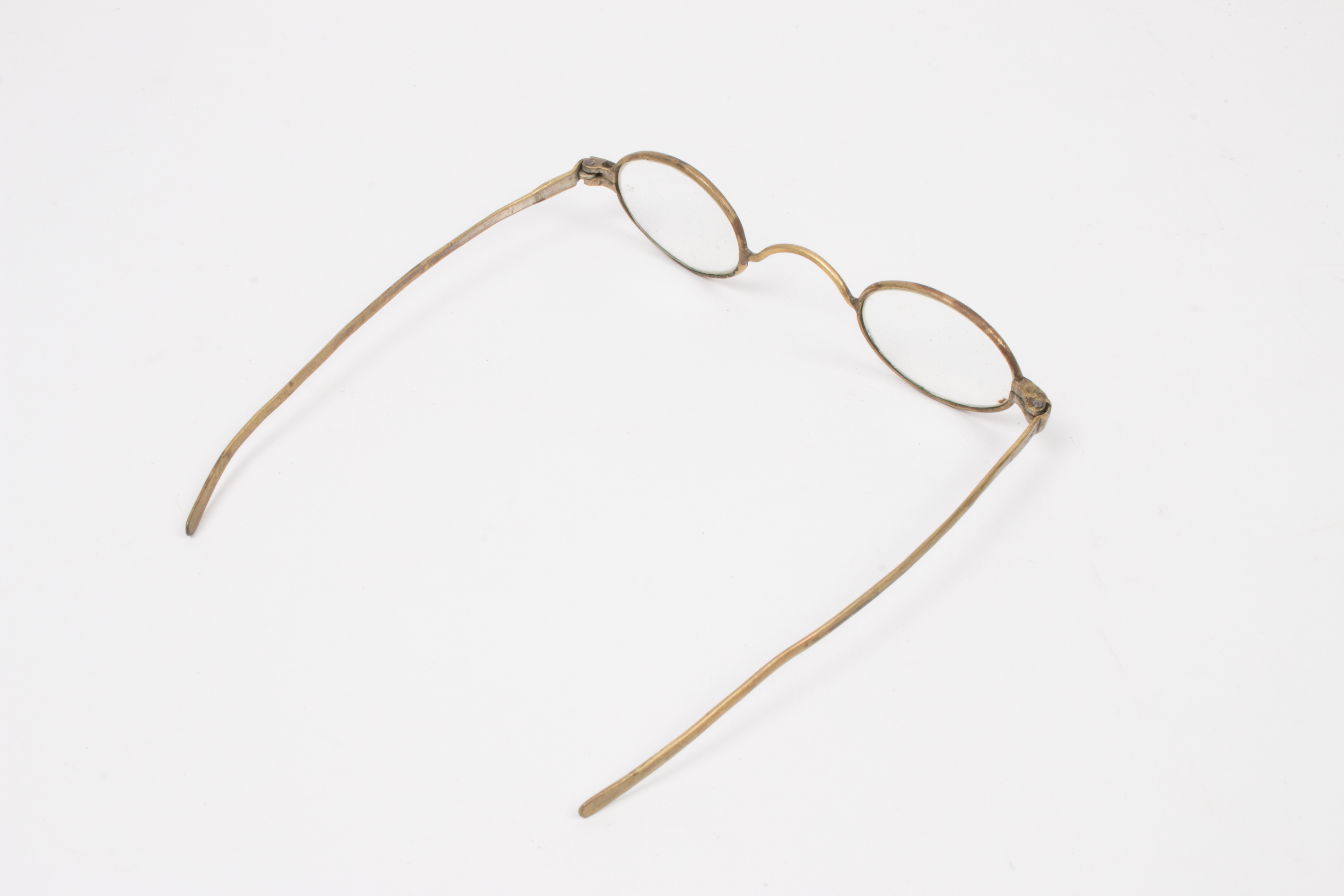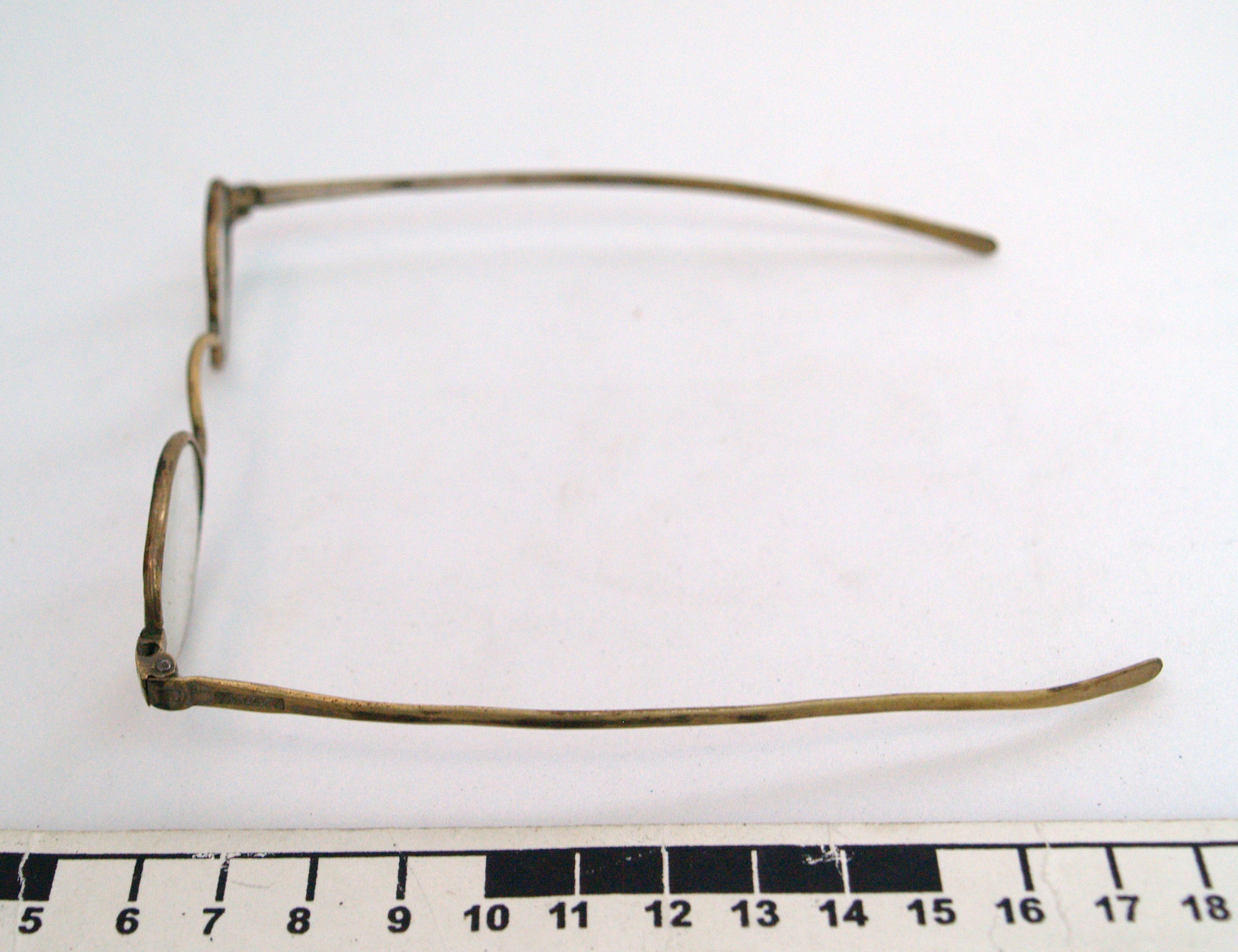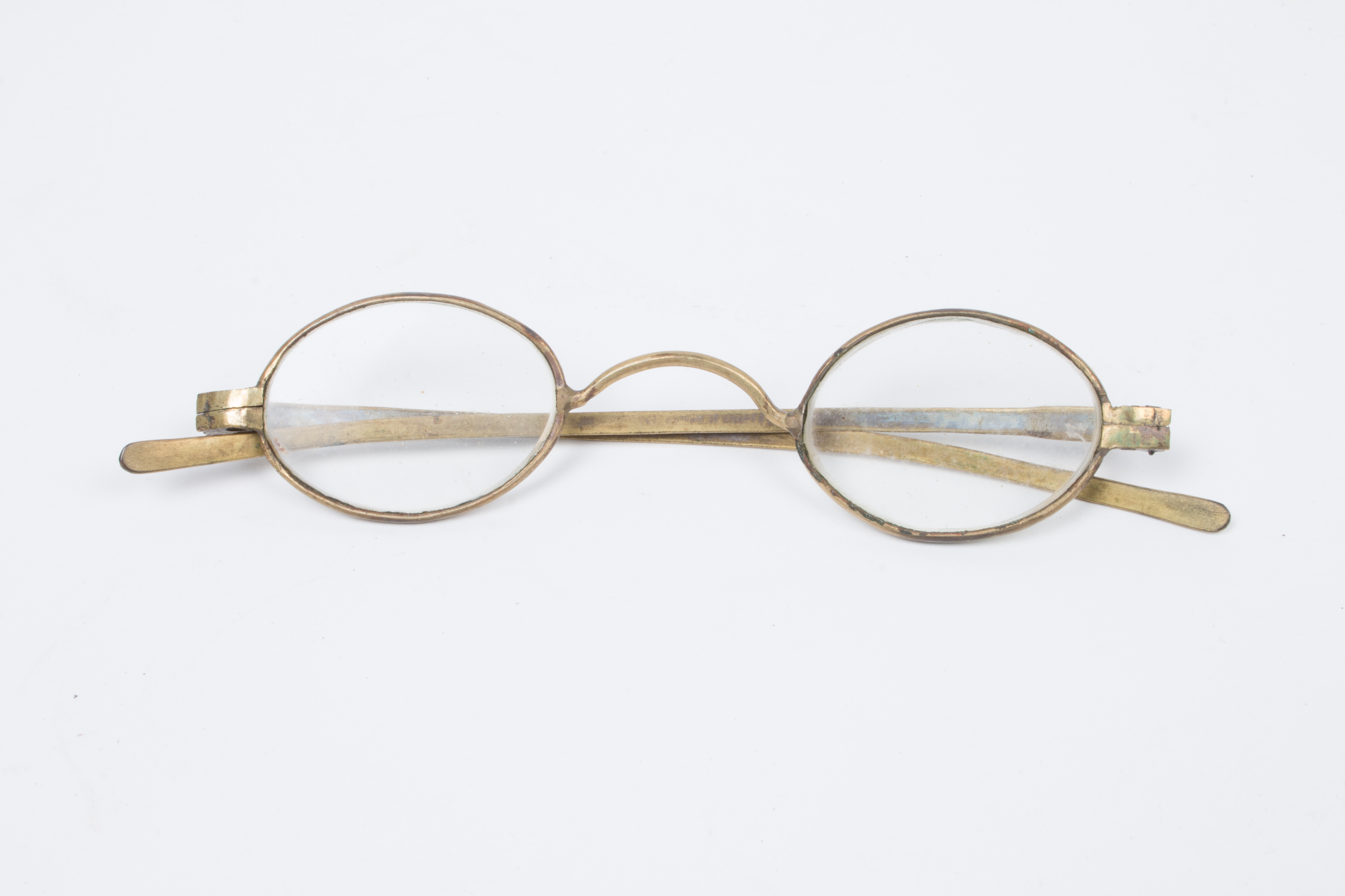 steel-rimmed gilt glasses, with round lenses; gilt is worn in some places; glasses are housed in a oblong wooden case with detachable lid; glasses and case part of a collection brought to New Zealand by Mr & Mrs Francis Tapp who arrived in Auckland by the troopship 'Oriental Queen' on September 17th 1849.
