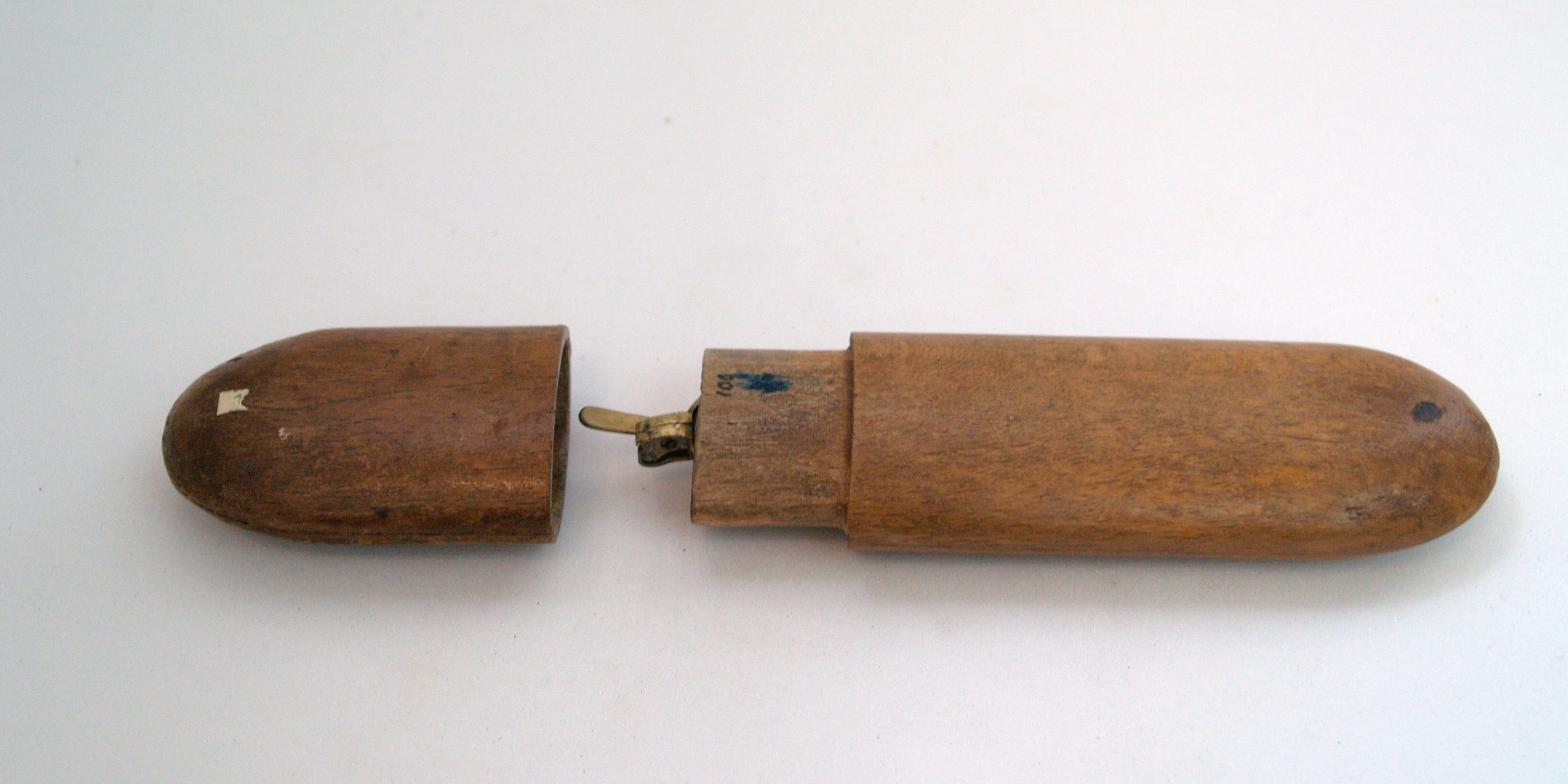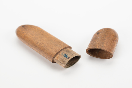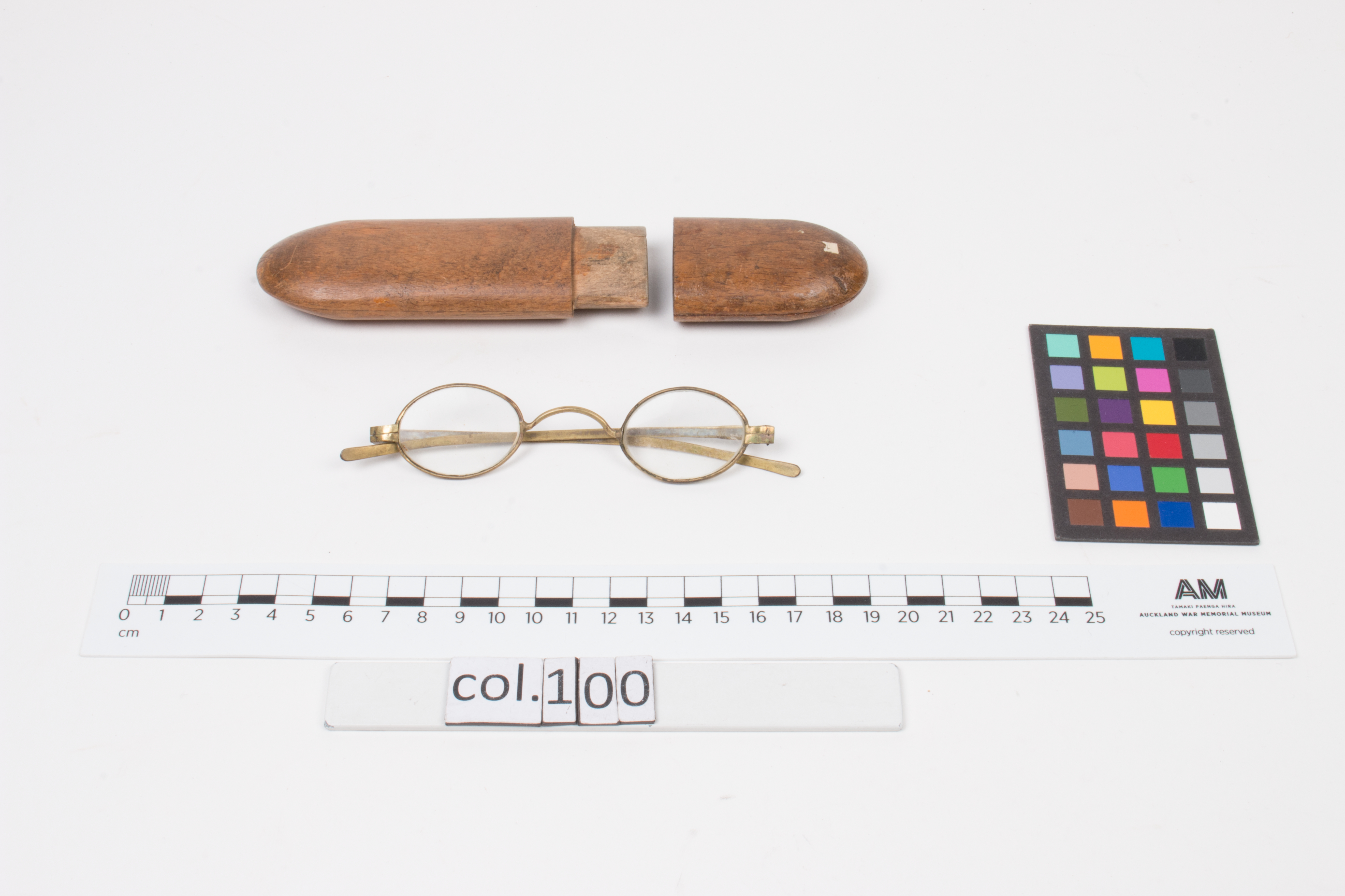 "One pair of steel-rimmed glasses in wooden case part of collection of articles brought to N.Z. by Mr & Mrs Francis Tapp who arrived in Auckland by the troopship 'Oriental Queen' on September 17th 1849 " [ocm]