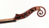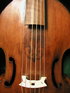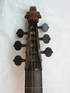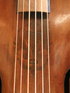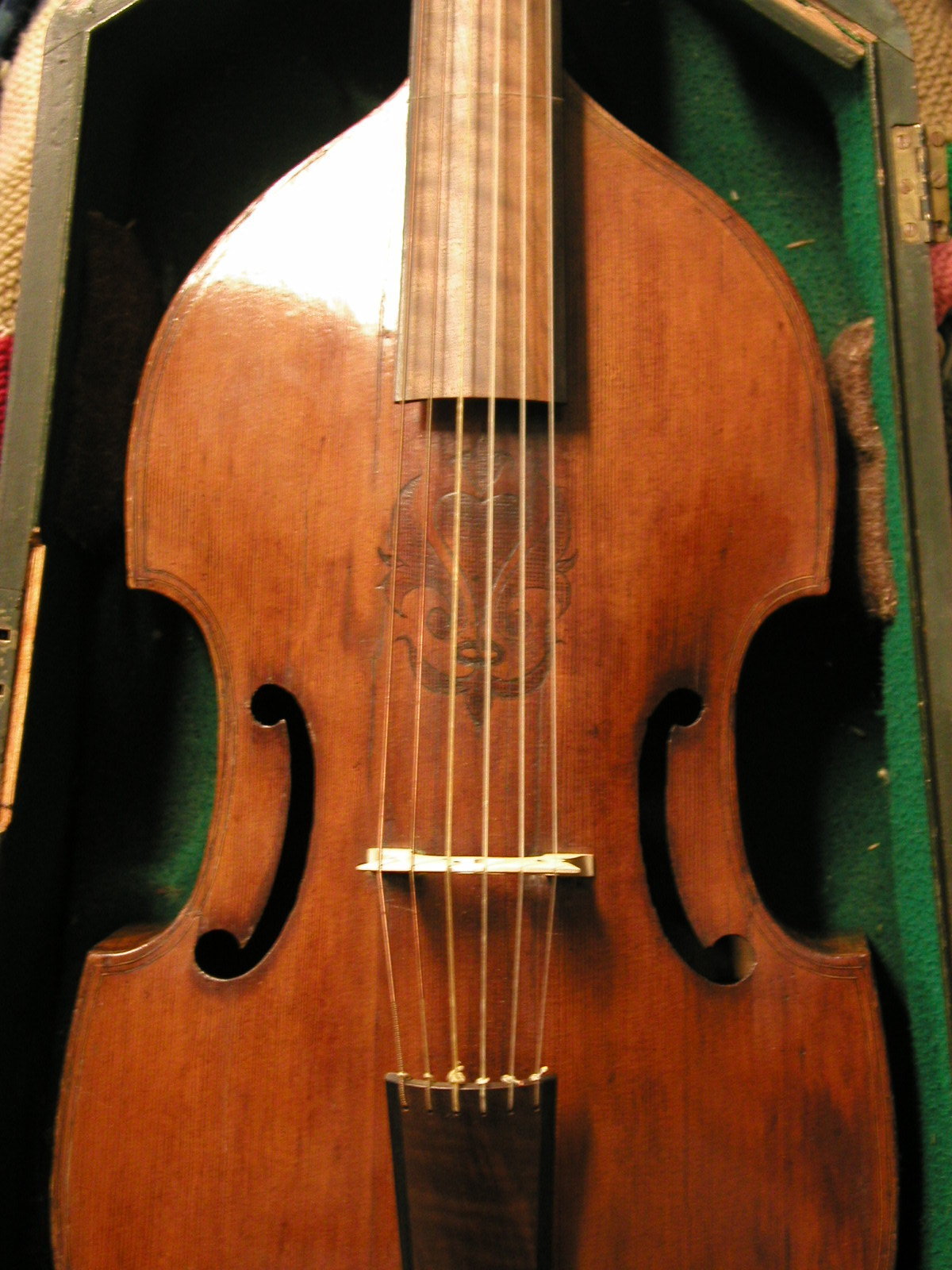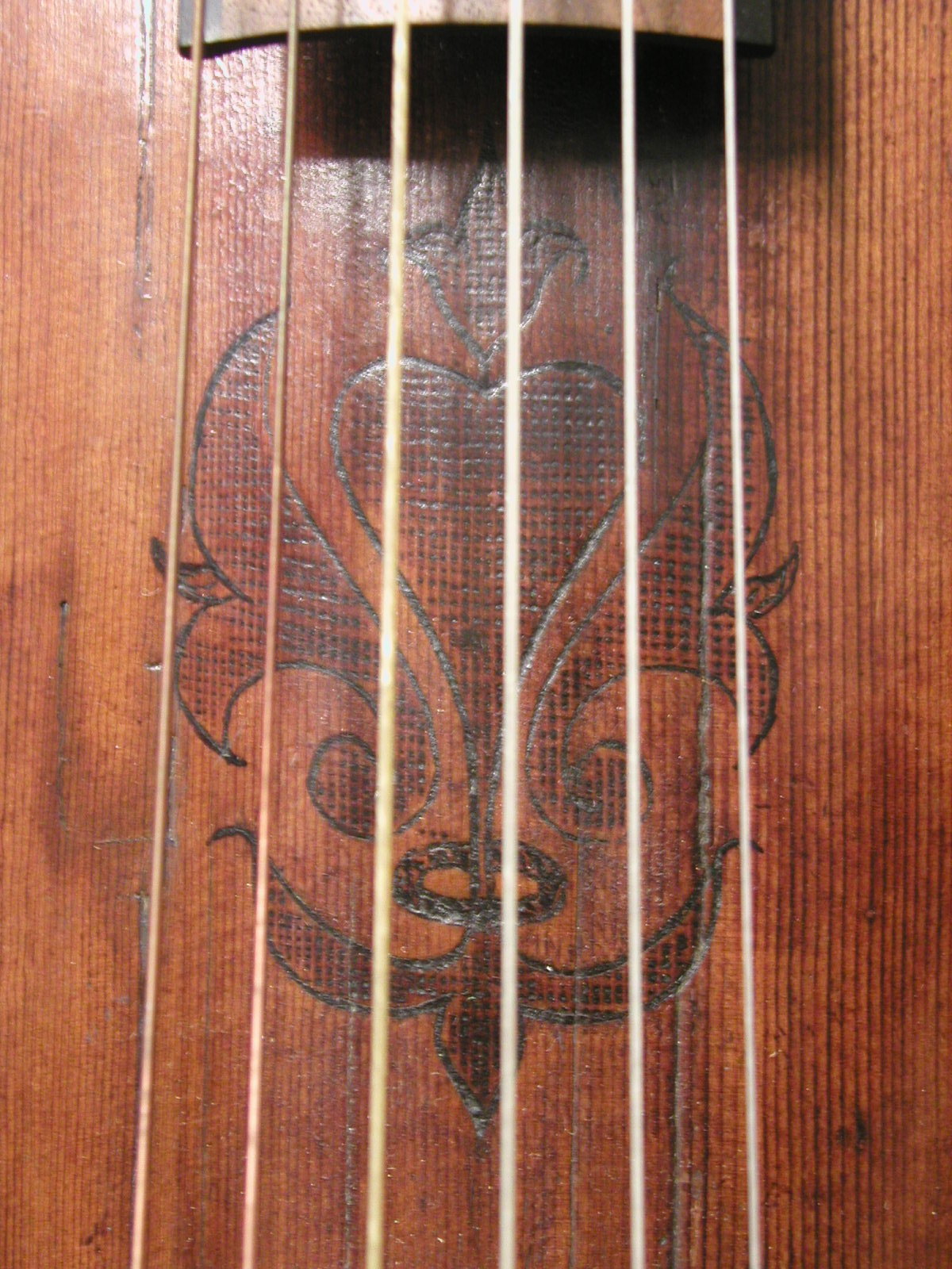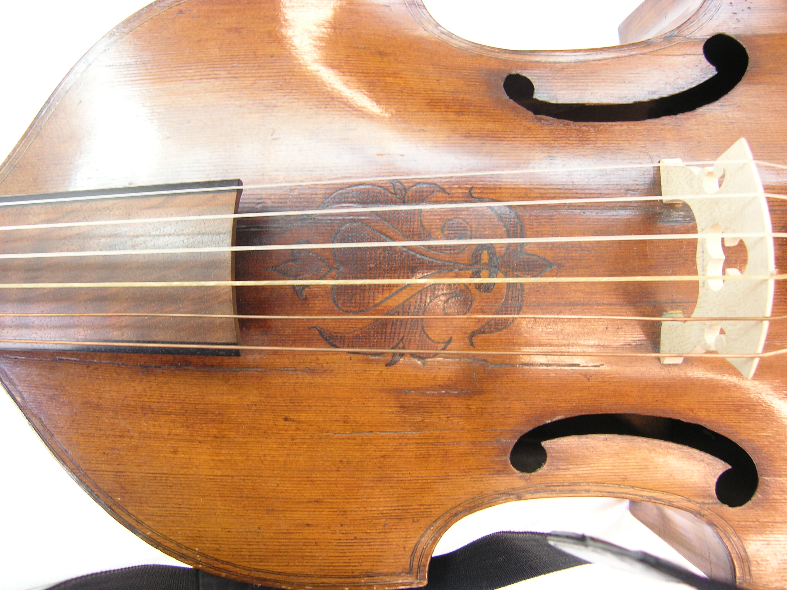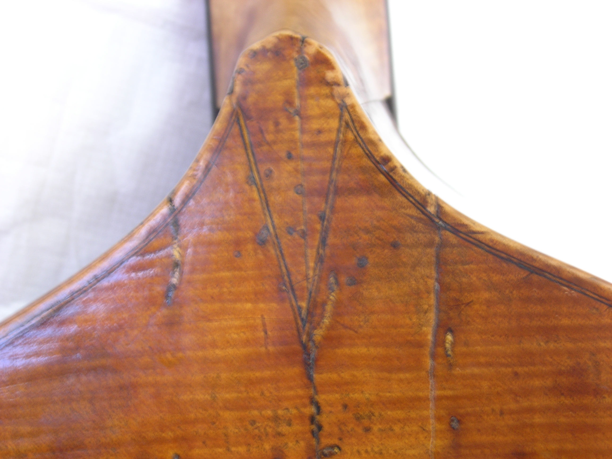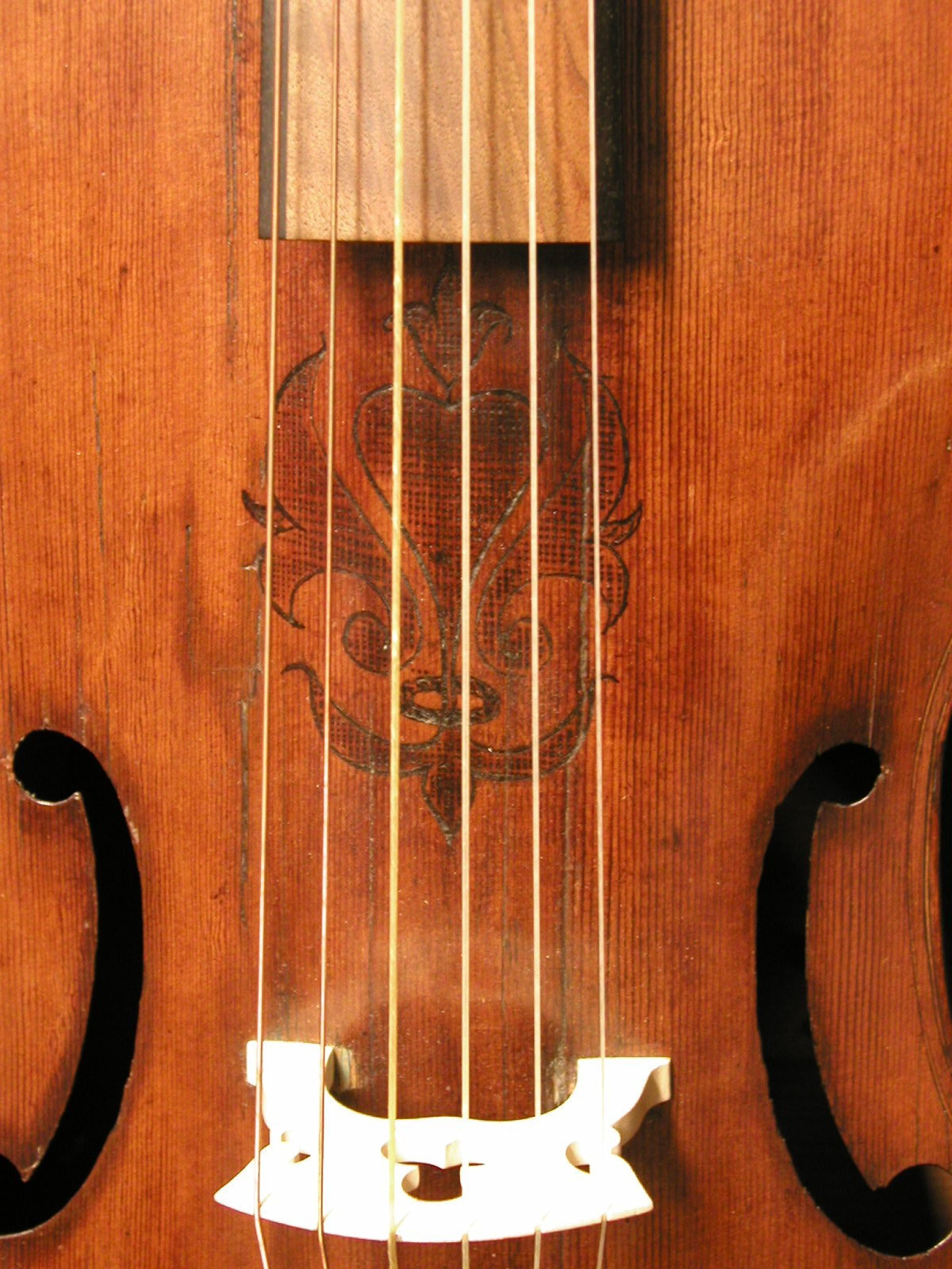viola da gamba, Baroque viol with sloping neck and fingerboard, high bridge, flat plate on back, six strings, fretted fingerboard, frets are catgut tied around fingerboard. Incised design between fingerboard and bridge of stylised plant. Interesting double row of purfling on belly, back has single row of purfling, angling at top of back has two rows of purfling, back joint in middle goes slightly up to one side to balance purfling.Two ")" shaped soundholes on viol body.
