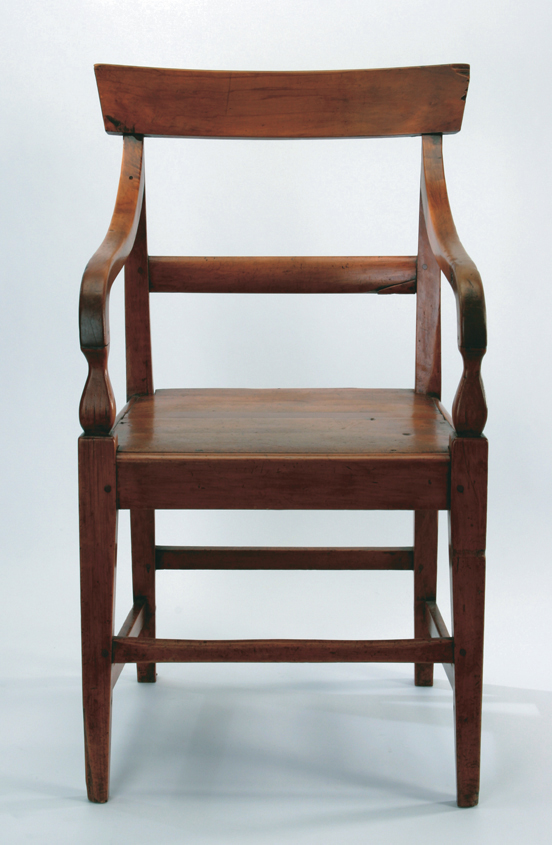 Attributed to the Johnny Jones whaling station and settlement, near Waikouaiti, north of Dunedin, the chair is a very rare, early example of domestic New Zealand made seated furniture used by settlers, whalers and traders. Taking advantage of New Zealand rimu, a wood that grows abundantly throughout the entire country, the chair is a simplified Regency period, Sheraton-styled elegant dining chair with arms and flat integral seat.