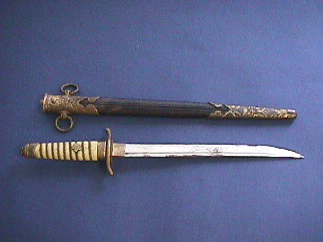 navy blue woollen cloth jacket, peaked cap with embroidered bullion naval badge, dress dagger and sheath, leather dagger belt