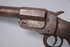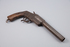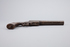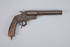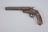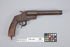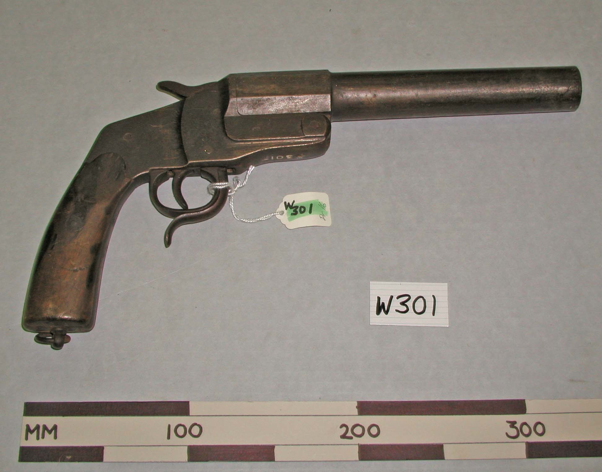 flare pistol; single smoothbore round barrel with octagonal breech; 26.5 mm calibre; under lever action; 9 mm band; stained wooden grips held together with single screw at centre; lanyard ring at base of grip