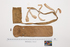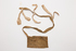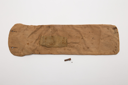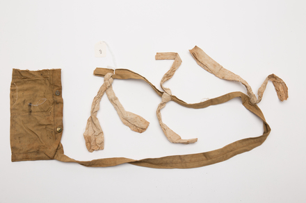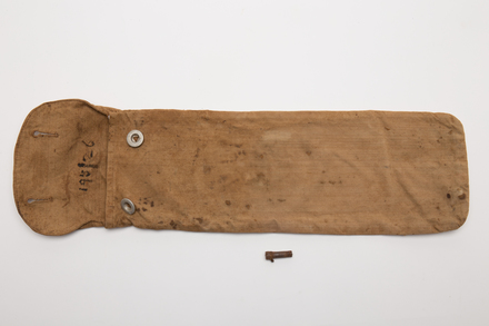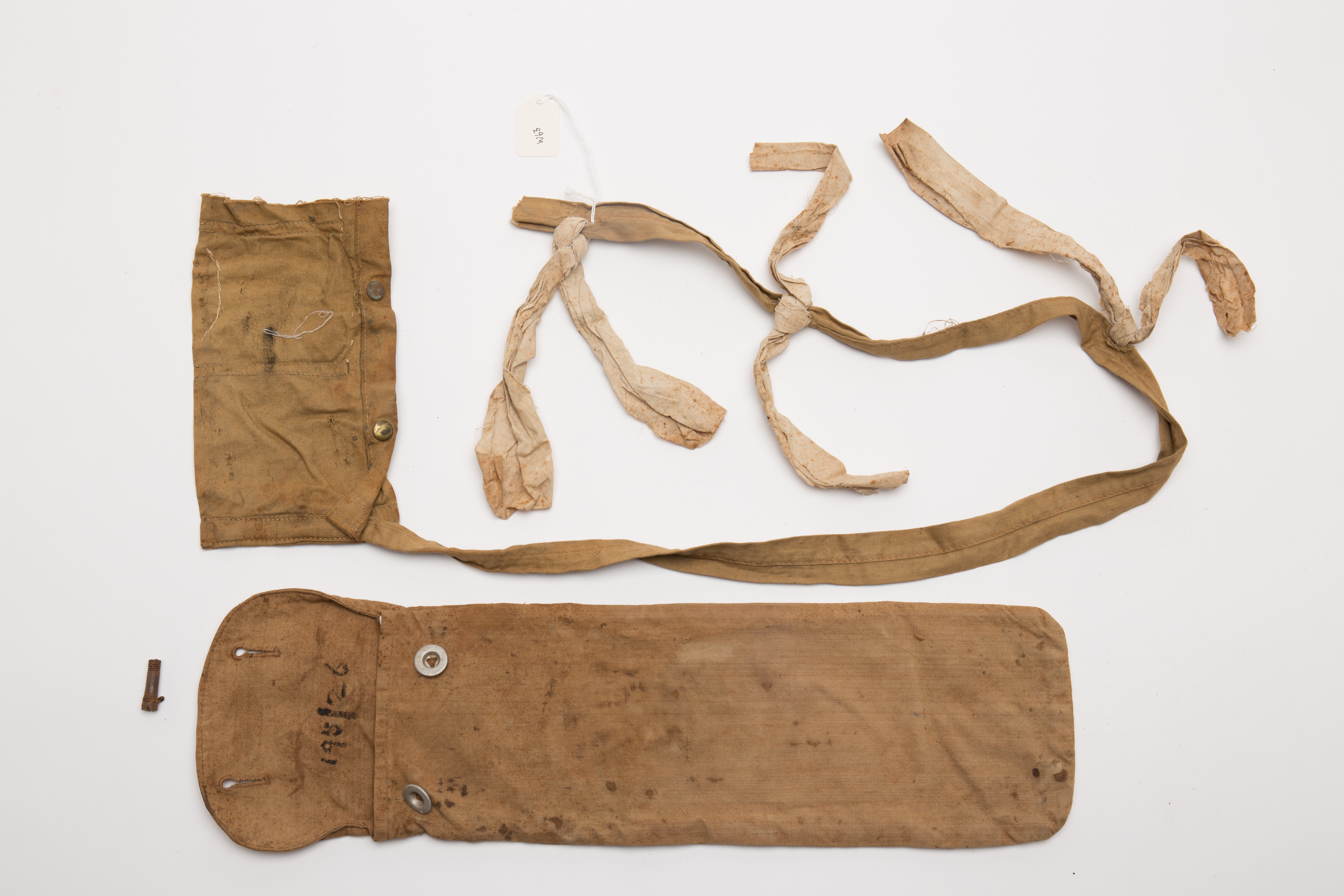 made from wool, cotton, and metal. Brown coloured wool for the messenger bag and case. Half hemmed in white thread. White cotton sand bag attached to one end. Sand bag has 2 metal eyelets with white cotton braid tied through them.