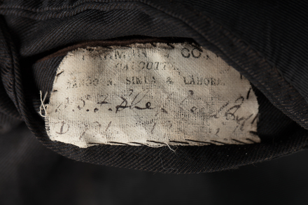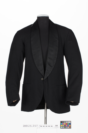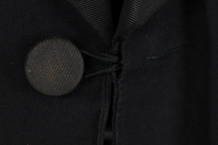 black jacket with wide satin shawl collar, single button closure at the end of the satin collar, jacket is lined with cream cloth with blue stripe, two pockets at front of jacket, handsewn label inside pocket, illegible