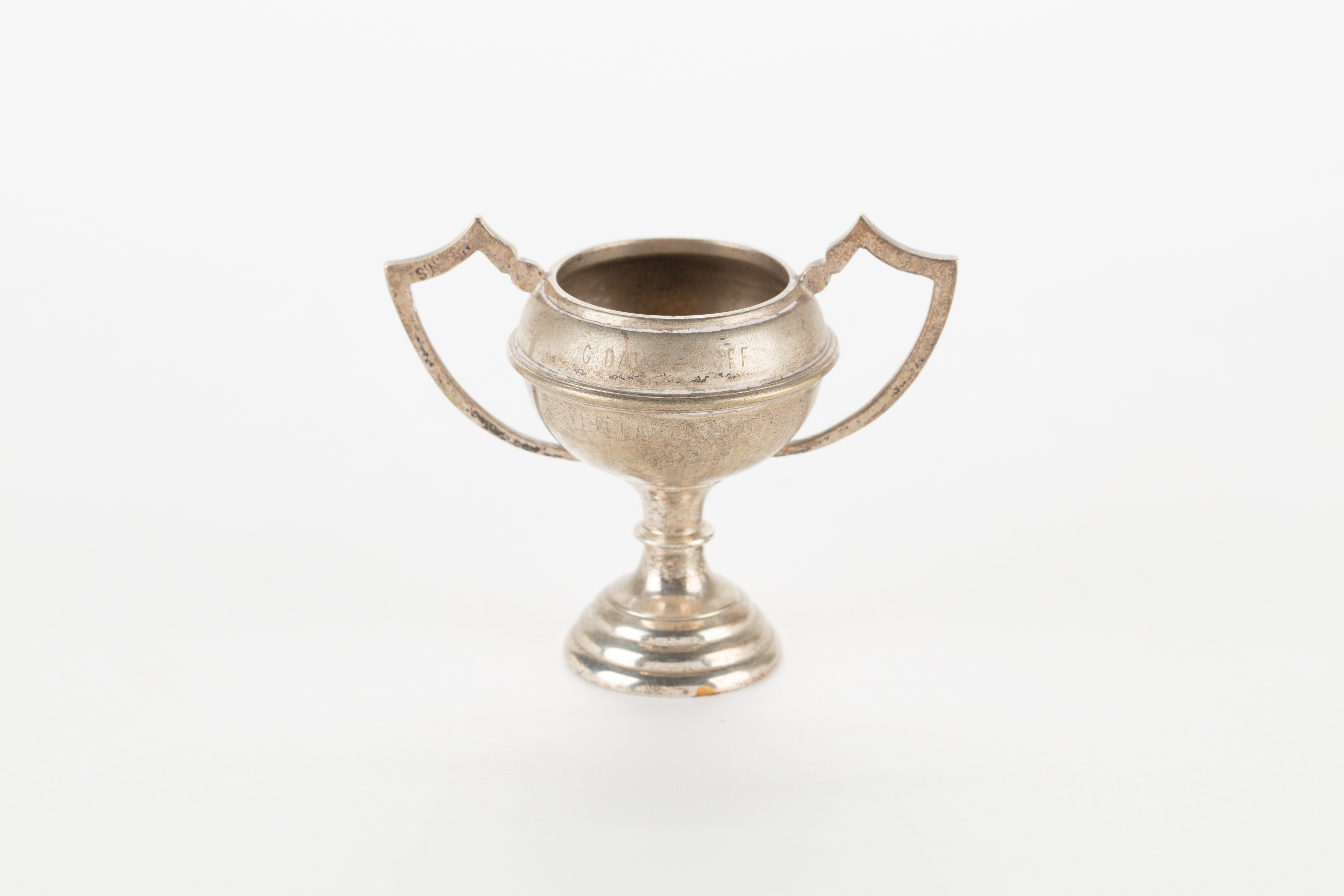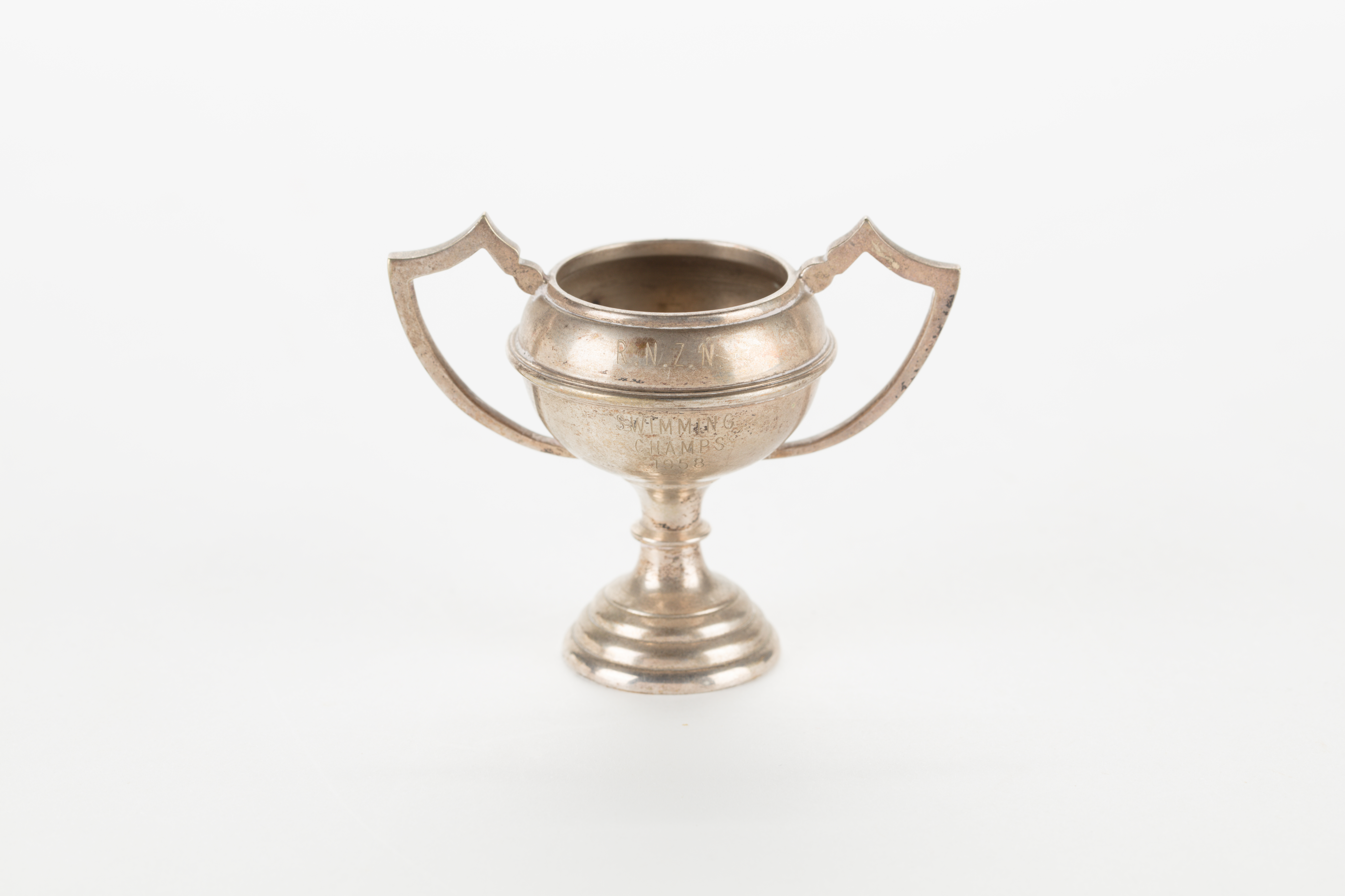 small [silver] cup trophy with two large handles, swimming prize, inscription at front "R.N.Z.N. / SWIMMING / CHAMPS / 1958" and on reverse "G. DAVIS-GOFF / VETERANS RACE", stand missing, stamp on handle: "[illegible].P.N.S."