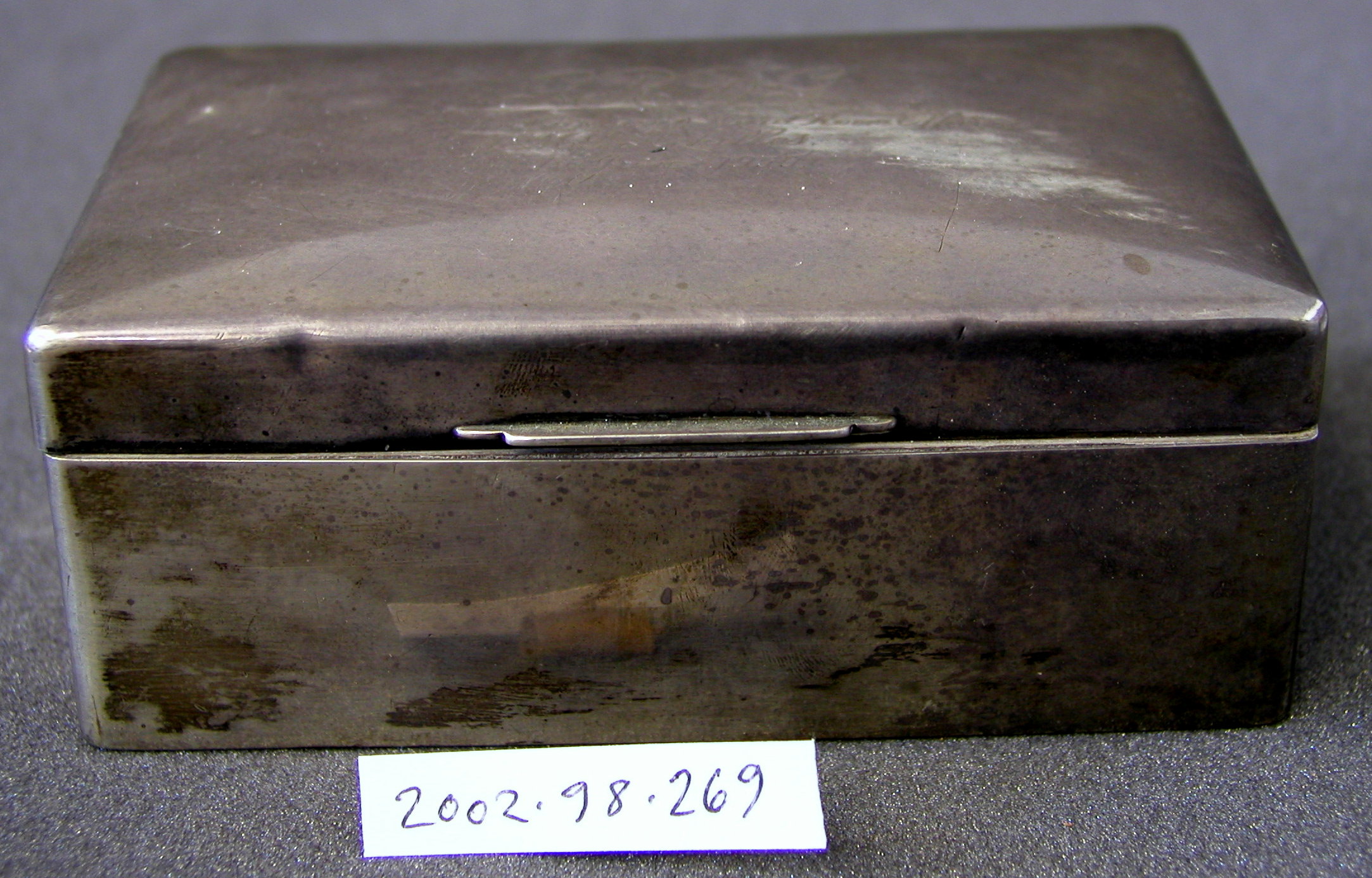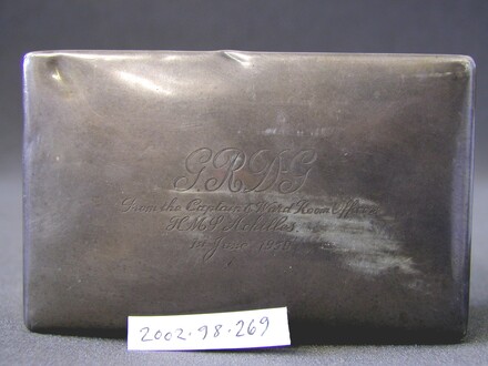 rectangular silver box with hinged lid and wooden lining (1 piece of lining broken - loose in box), inside divided into two compartments, presentation text engraved on top of lid: "G.R. D-G / From the Captain & / Ward Room Officers / H.M.S. Achilles / 1st June 1939", red plastic base, stamped on base "63400" and "7s", hallmarks stamped on left side of box: leopard head / lion / u : M & M