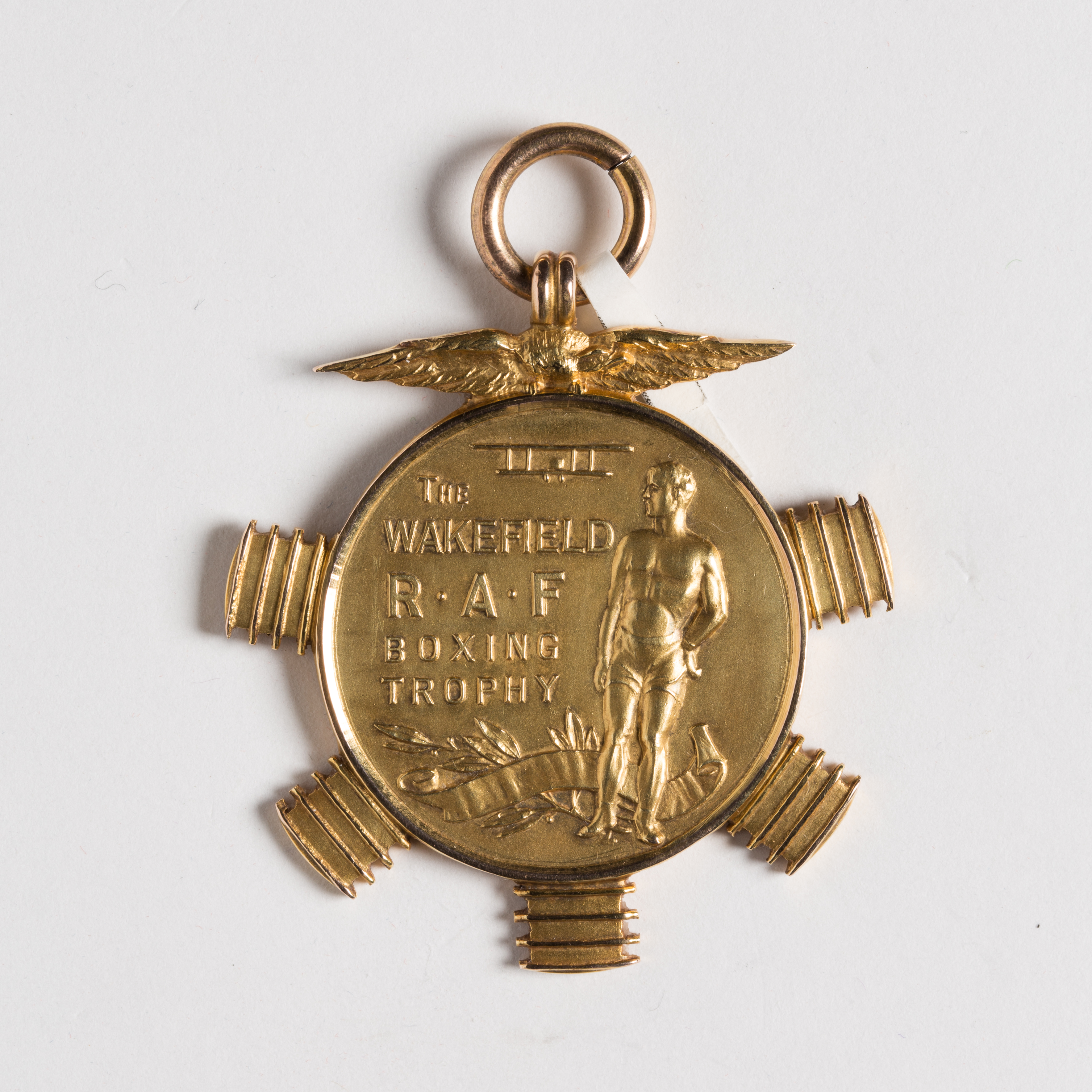 obverse: illustration of bi=plane above with boxer in shorts on rhs, named on lhs: THE / WAKEFIELD / R.A.F. / BOXING / TROPHY