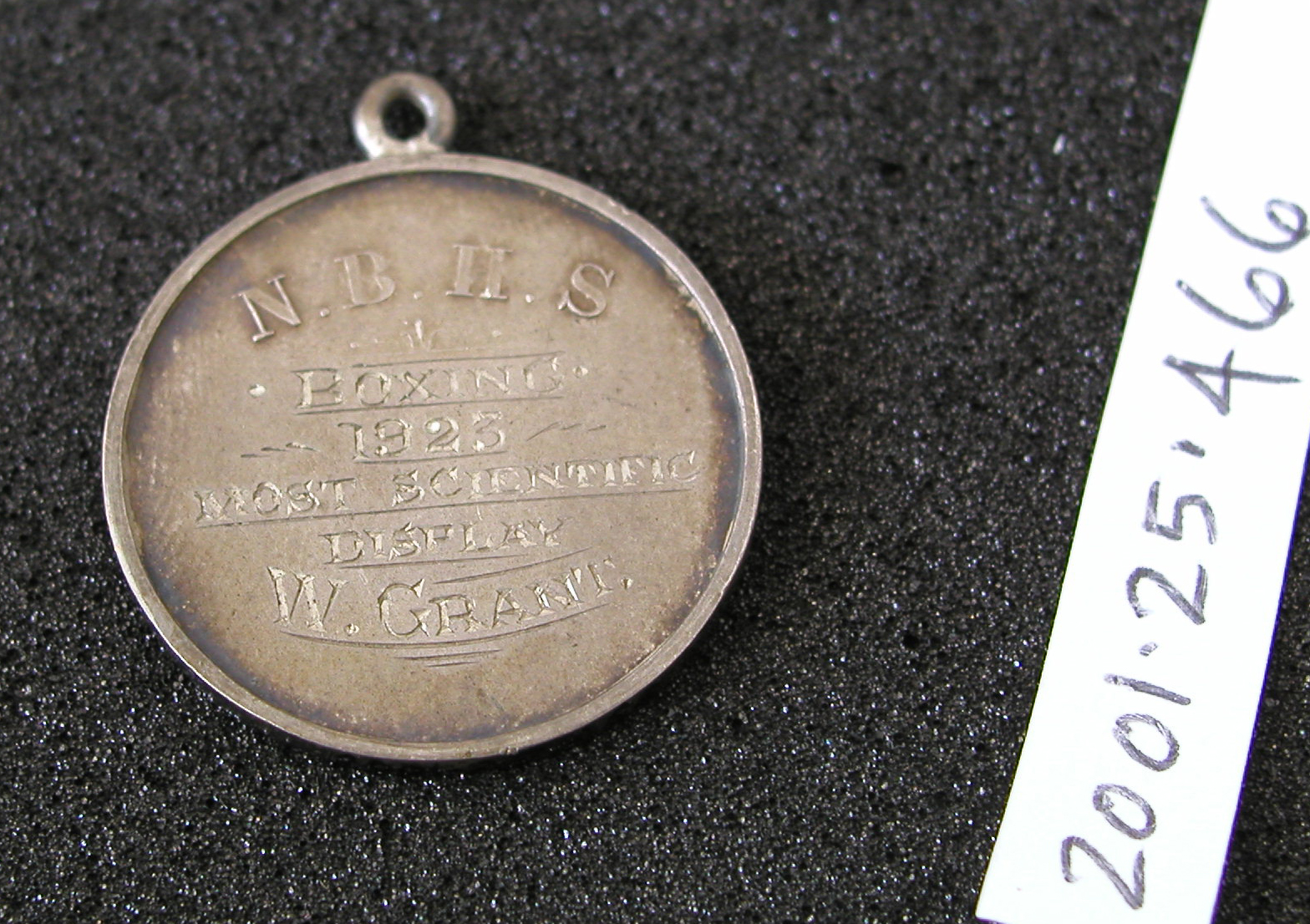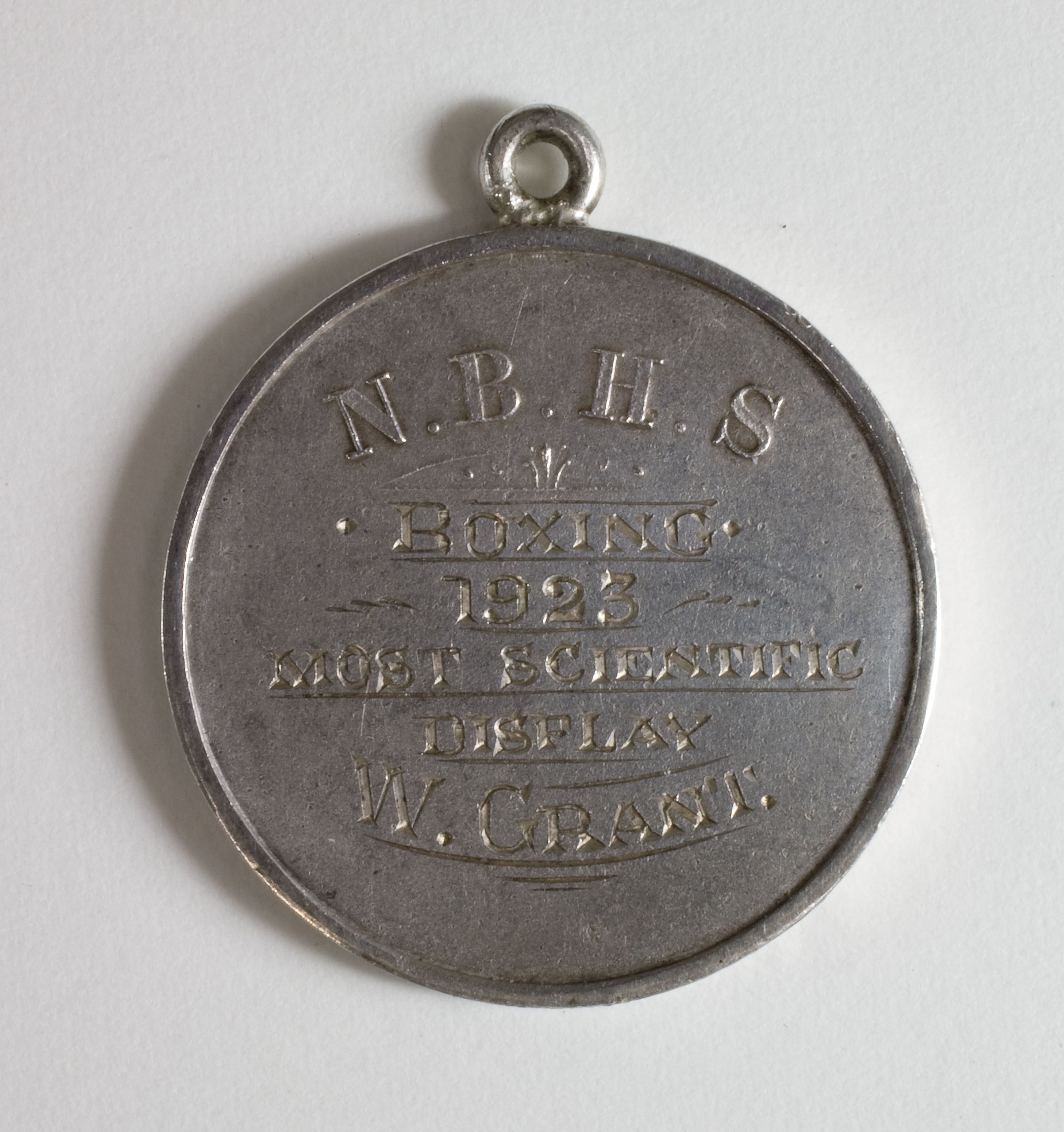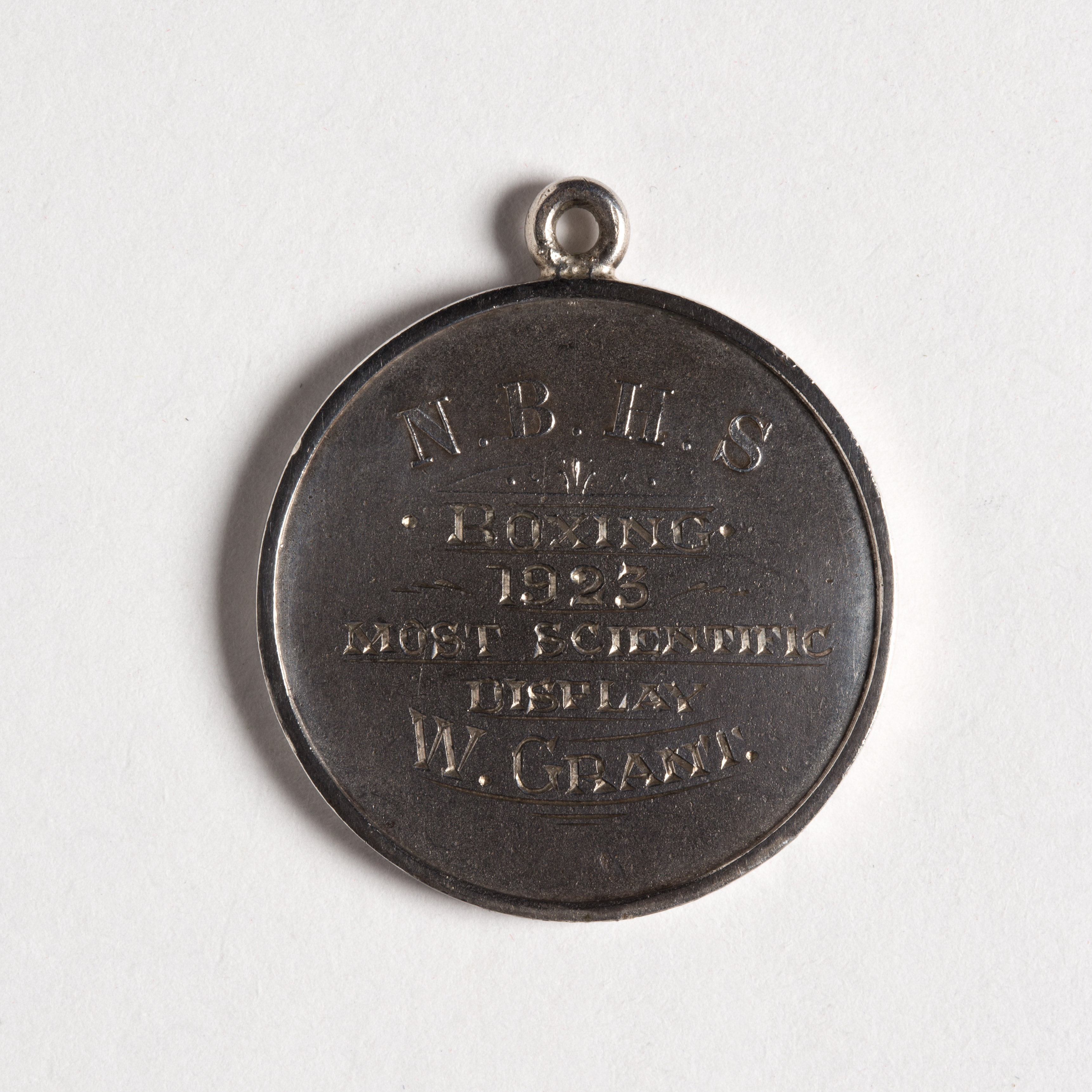 reverse: curved initials inside line rim: N.B.H.S. with engraved presentation details below: BOXING / 1923 / MOST SCIENTIFIC / DISPLAY / W. GRANT.