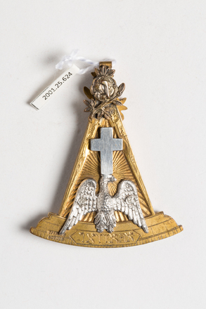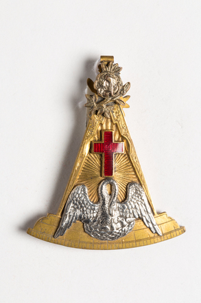 obverse: superimposed on gilt compass and curved measure, a silver emblem of pelican on nest feeding young, red enamel cross above, and at apex a rose
