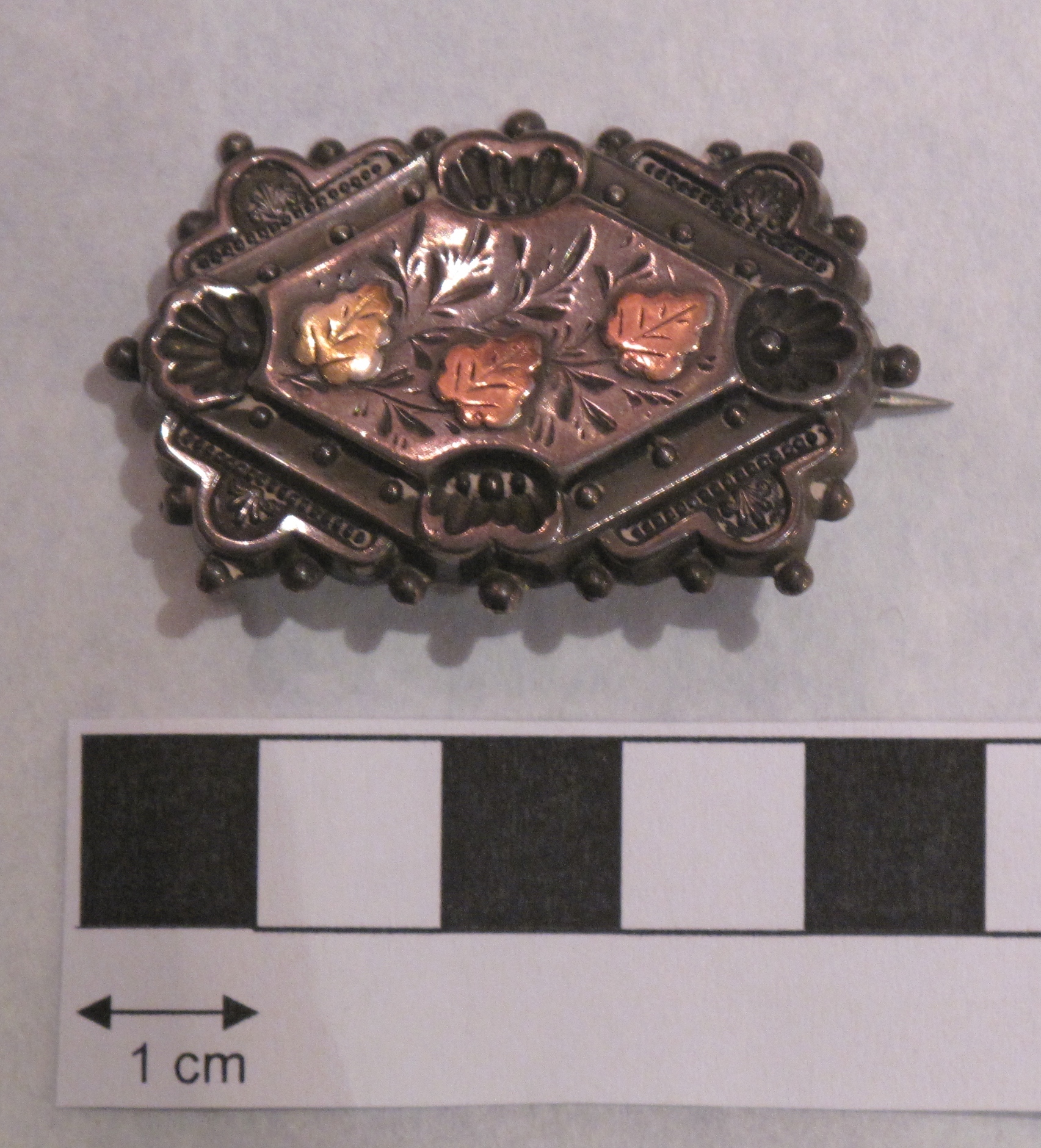 Brooch. Brought to New Zealand by Mr and Mrs Francis Tapp who arrived in Auckland by the troopship 'Oriental Queen' on September 17th, 1849. Made from silver and gold. Rectangular shape. The brooch has a tiered diamond design with three gold leaves at the centre. The edges of the brooch are little filigree silver beads. The reverse has the engraved text: 'SLG SLVR'. The brooch has a pin and hook closure.