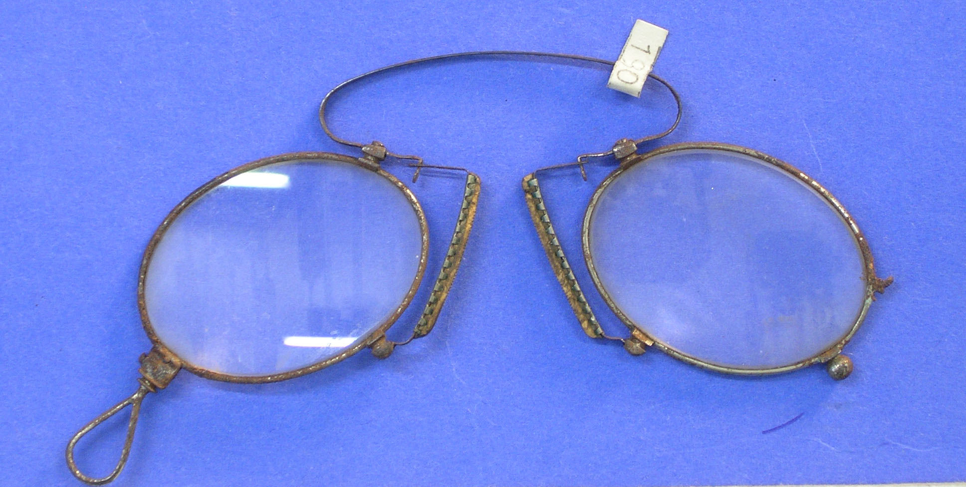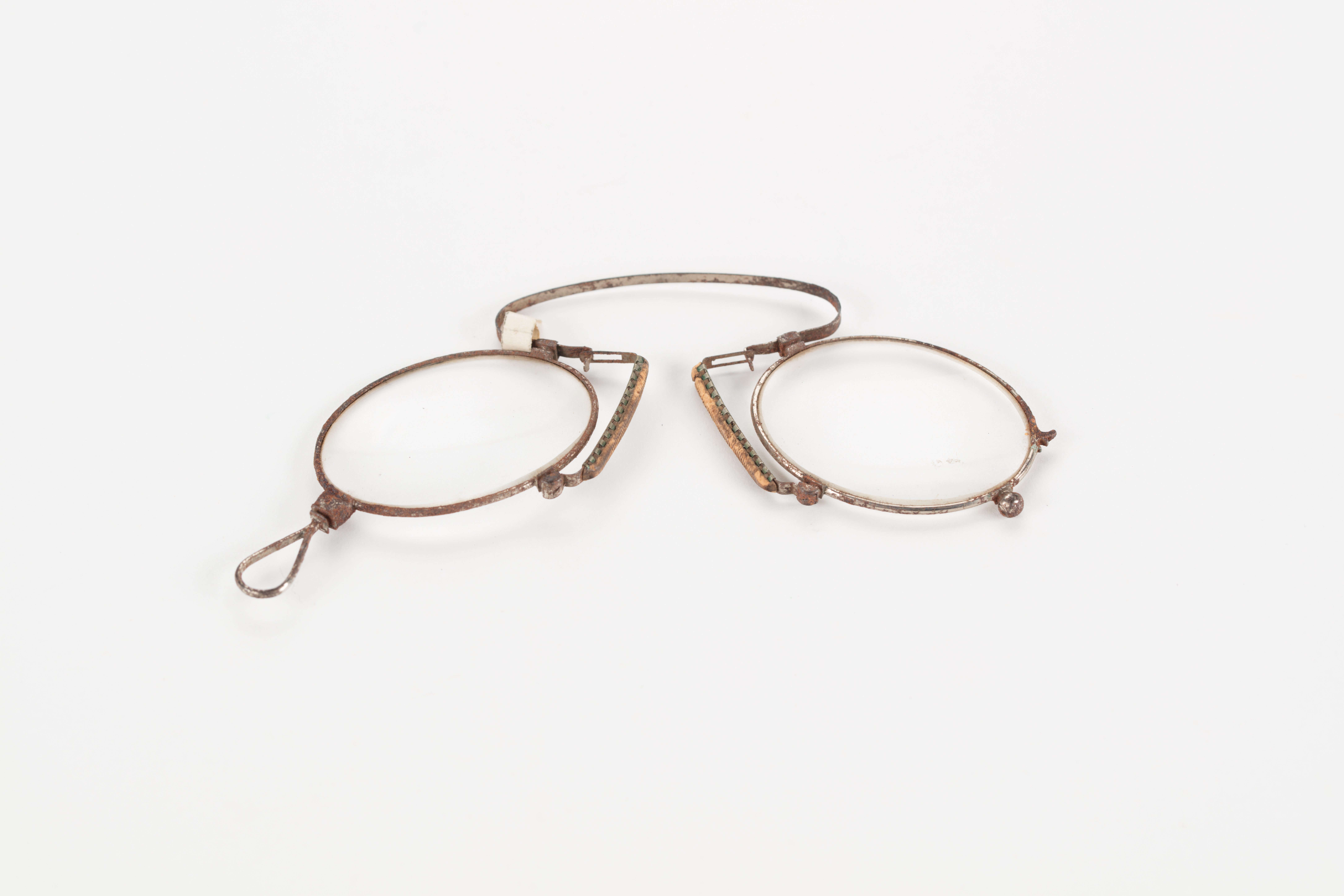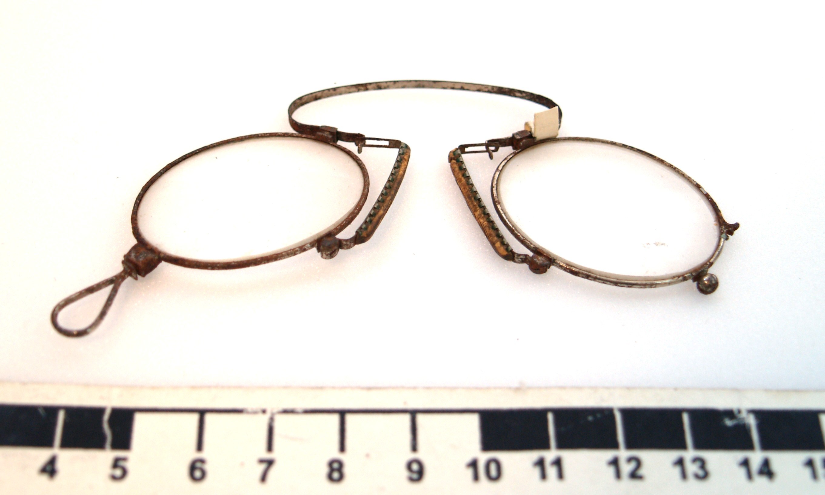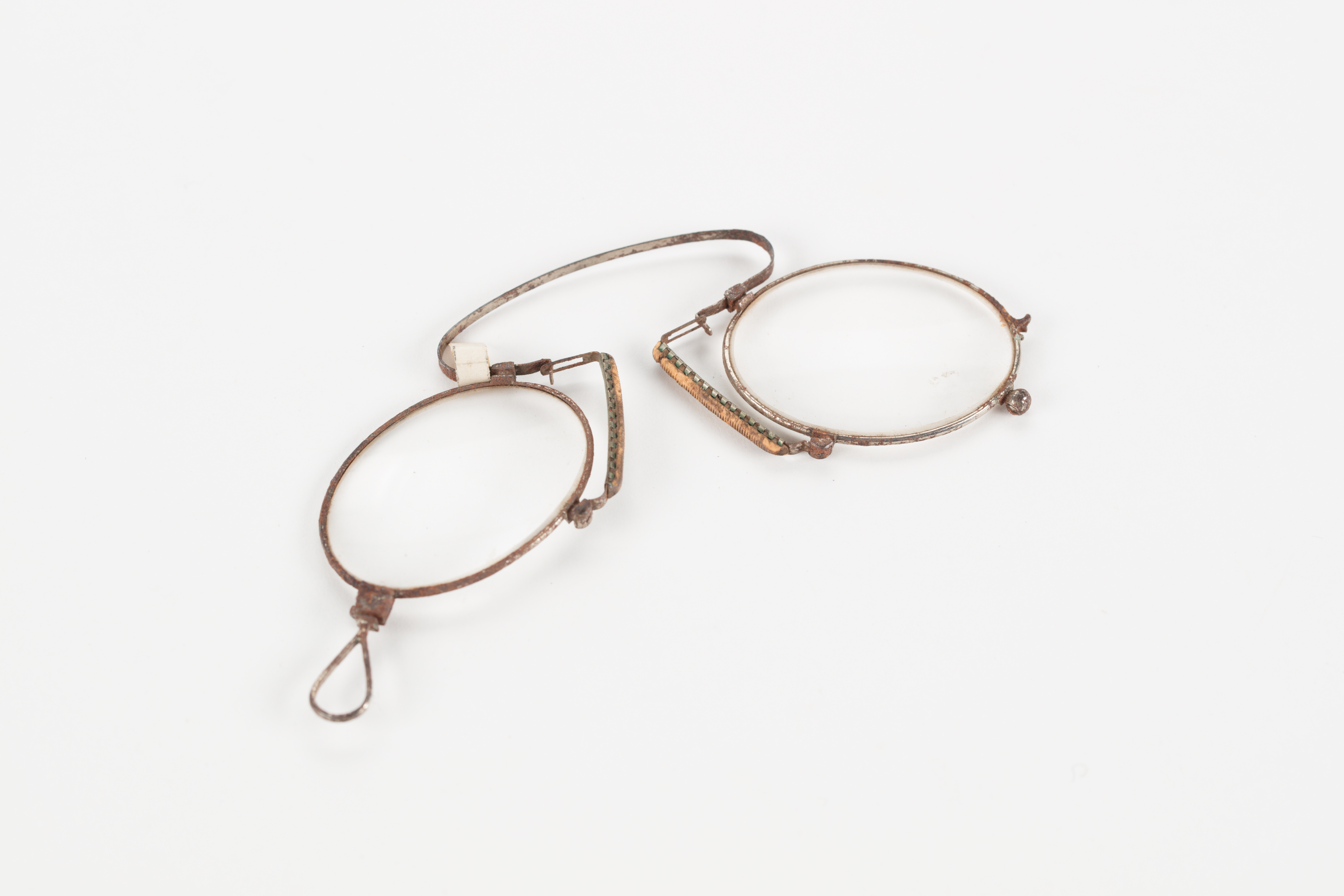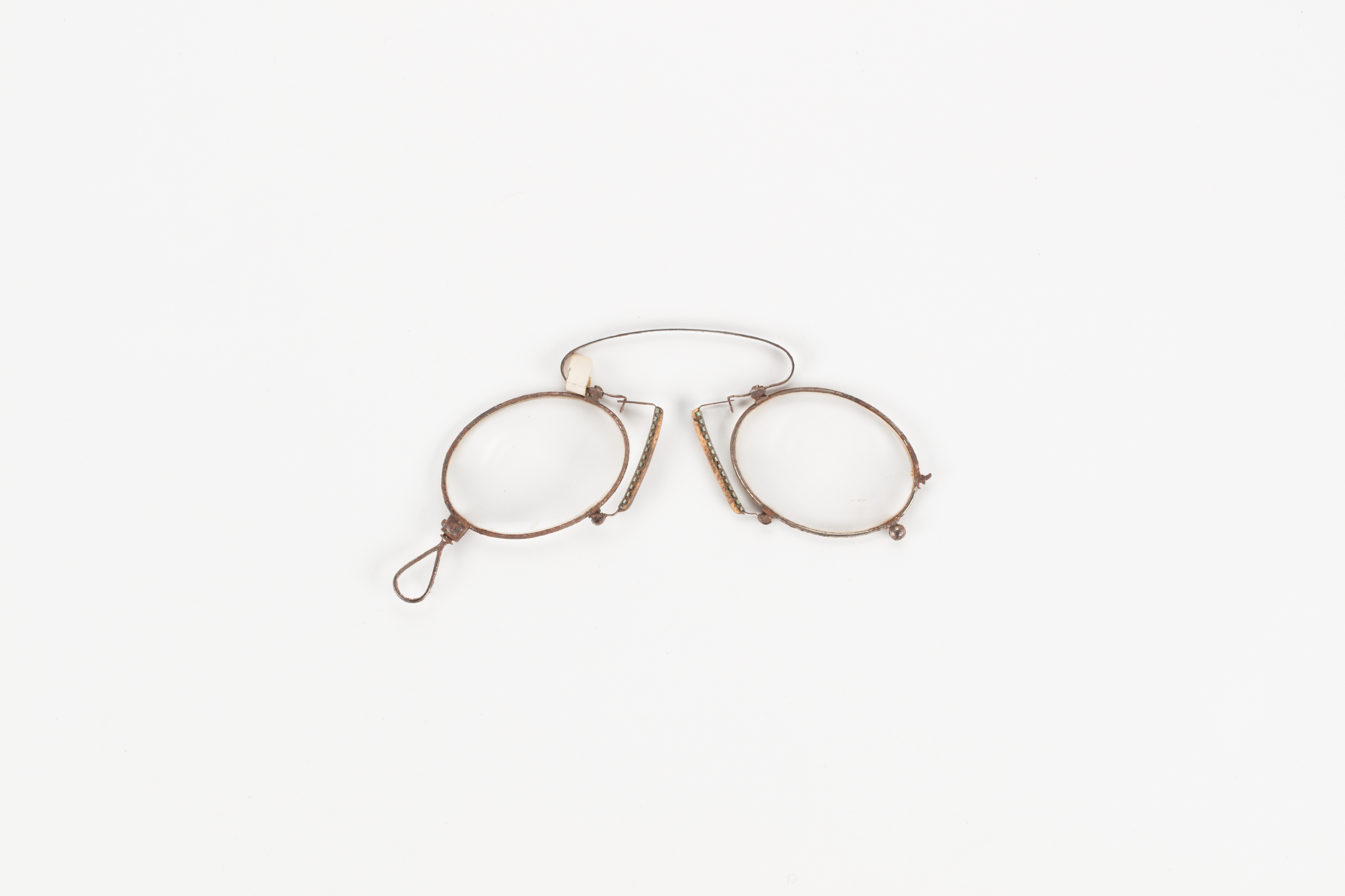 metal framed pince-nez, oval lenses, cushioned nose pads, small loop on left lens for chain or ribbon; rust spots on frames; collection brought to N.Z. by Mr & Mrs Francis Tapp who arrived in Auckland by the troopship 'Oriental Queen' on September 17th 1849.