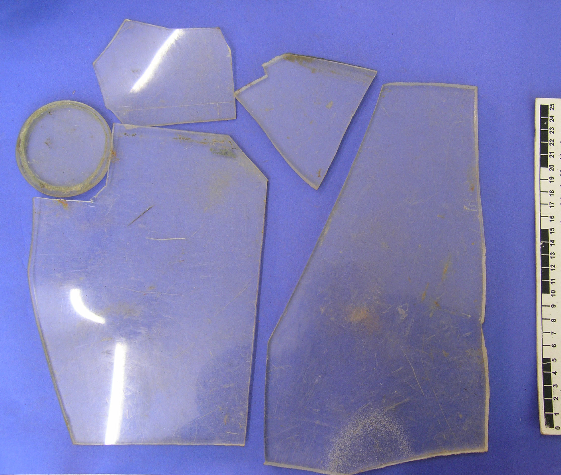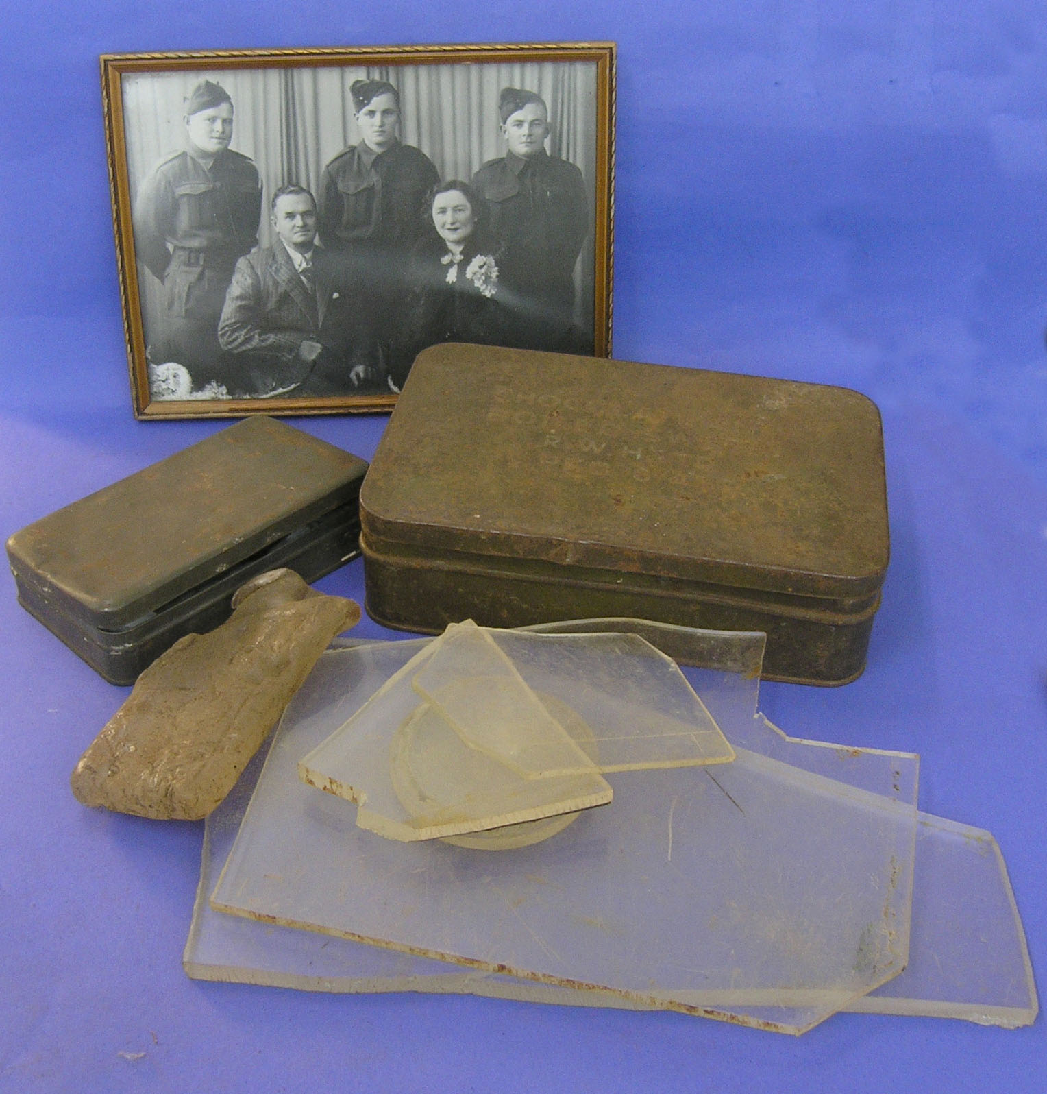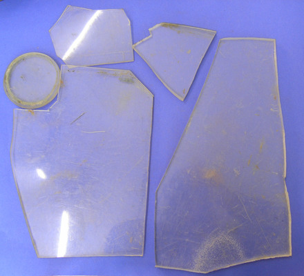 pieces of perspex from German plane which had been shot down,and subsequently acquired by 423170 Pte Ralph Turner, 21st Infantry Battalion, 2NZEF, for making souvenirs. These formed part of his trench kit, (see 2007.10.1).