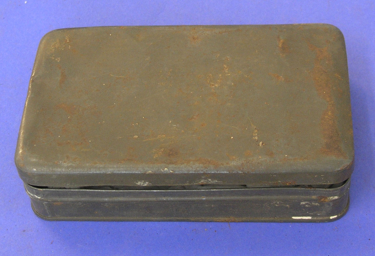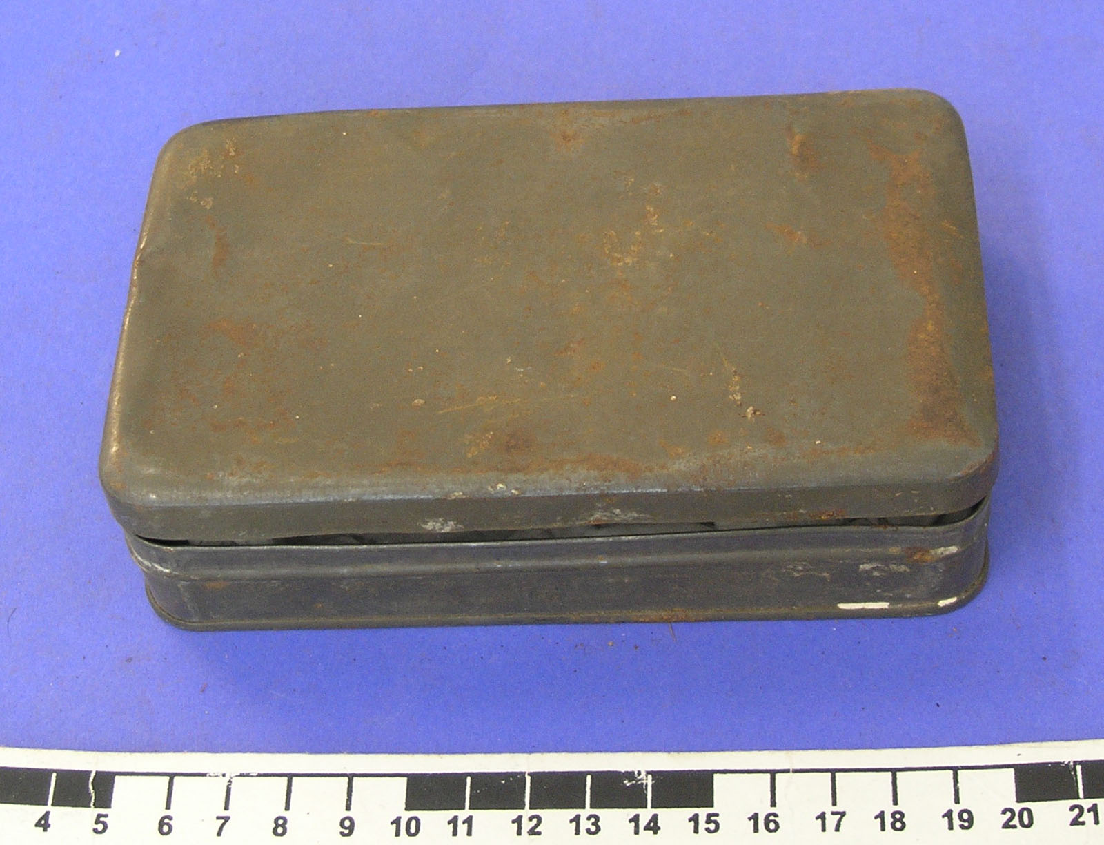 tin container used by 423170 Private Ralph Turner, 21st Infantry Battalion, during WW2 to carry souvenirs. It contains a cigarette holder, cuff-links and pendants acquired while serving in Italy.