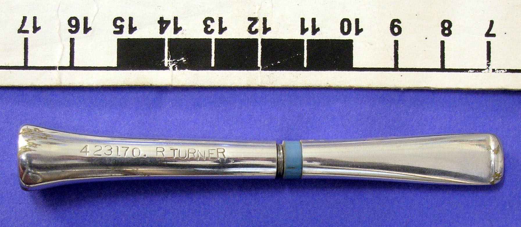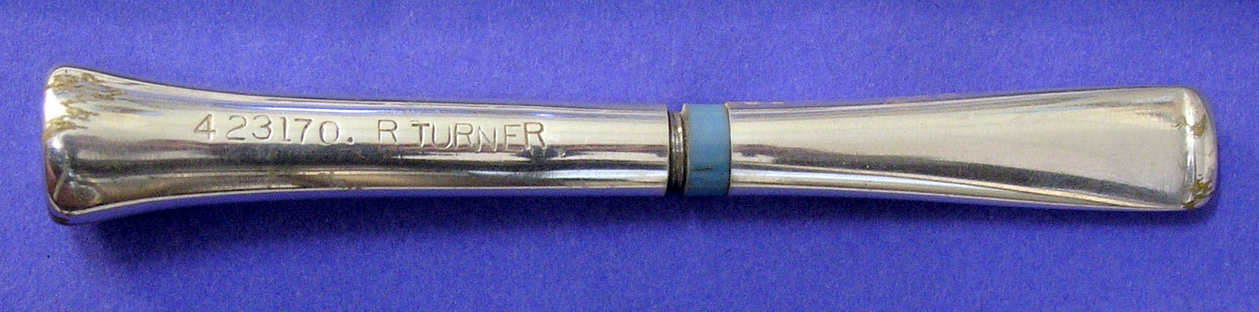 aluminium; two parts screwed together;owner's name impressed on side: "423170. R. TURNER."