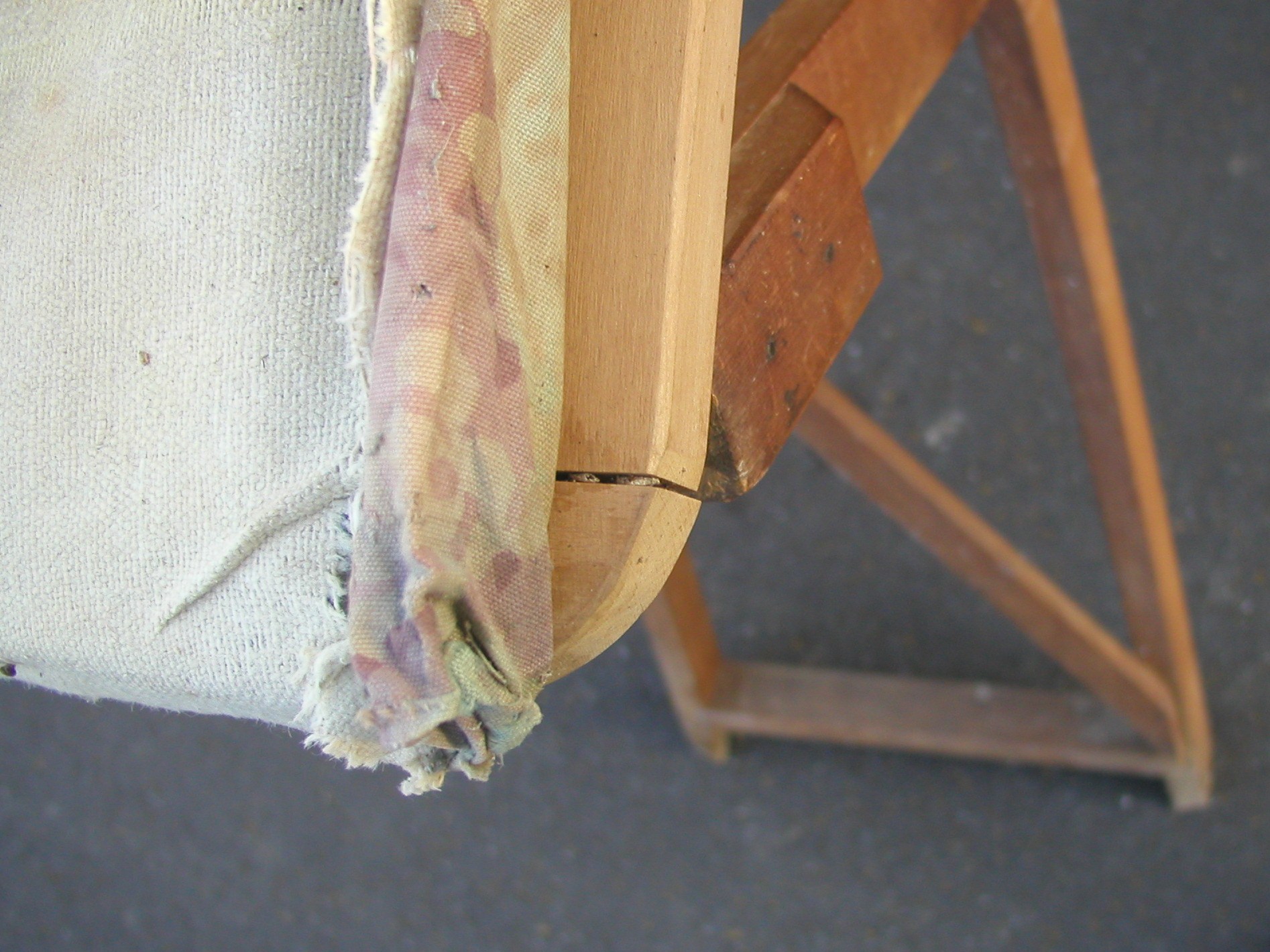 Possibly home made, covered with folded blue and mauve printed floral curtain fabric with woollen blanket remnants to ends, cover is roughly nailed to board, frame hinged at widest end or board