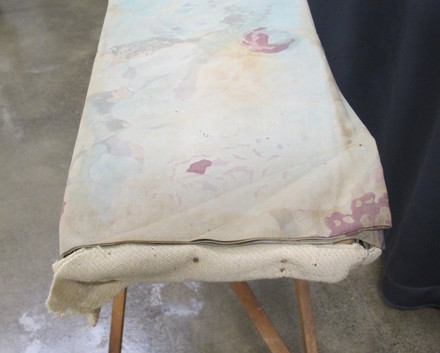 Possibly home made and covered with remnants of home made cover of curtain fabric and blanket. This board is typical of 1940s period laundry / ironing equipment; superseded in 1950s by metal frame folding ironing boards.
