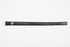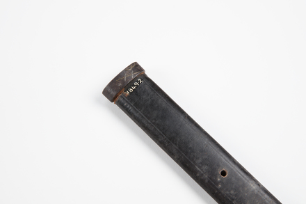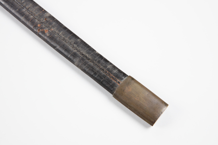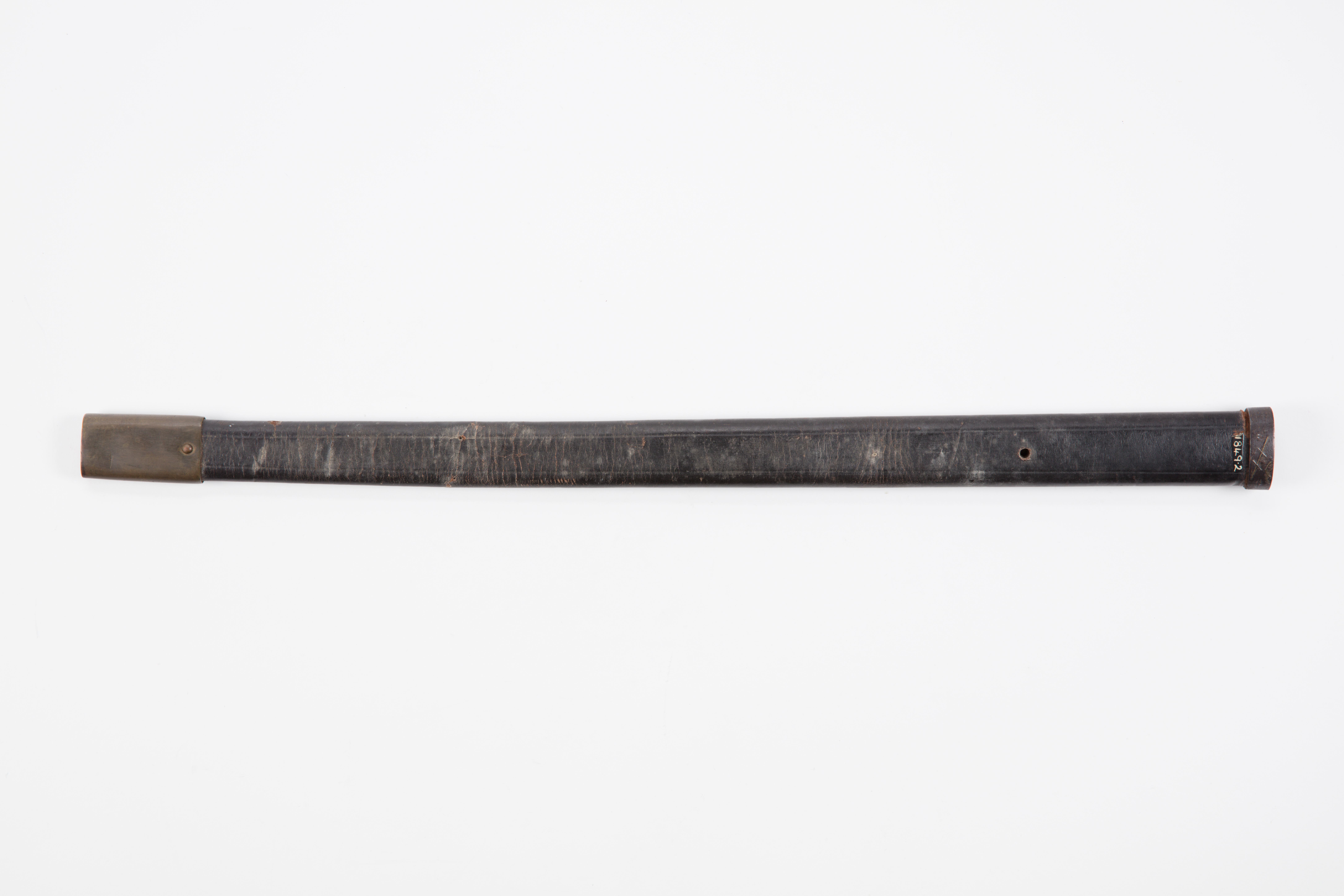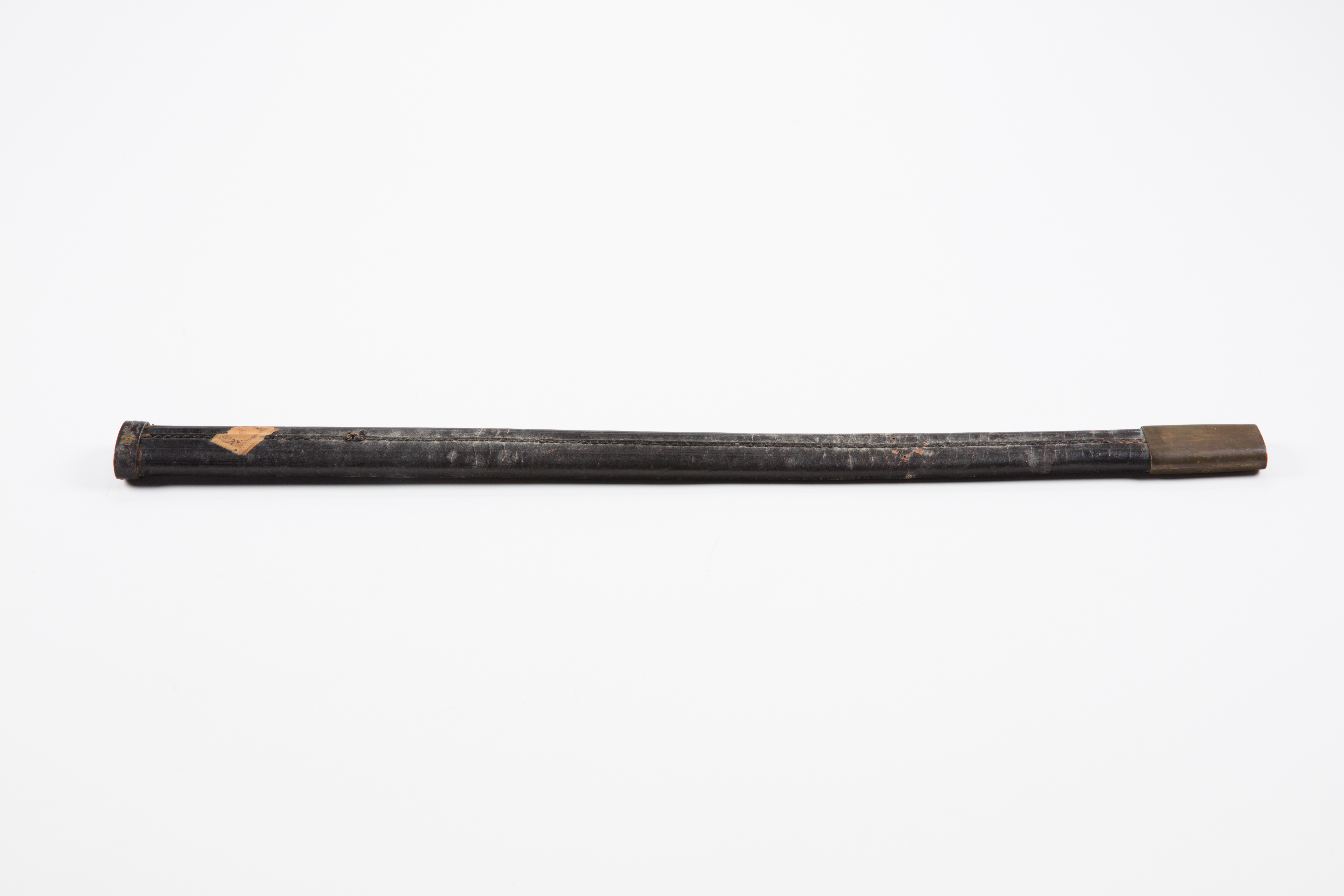 leather saya (scabbard), straight shaped saya with metal end; koiguchi (metal ring around top of saya) is a raised relief design of a leaf and various squiggles in silver and gold;