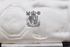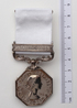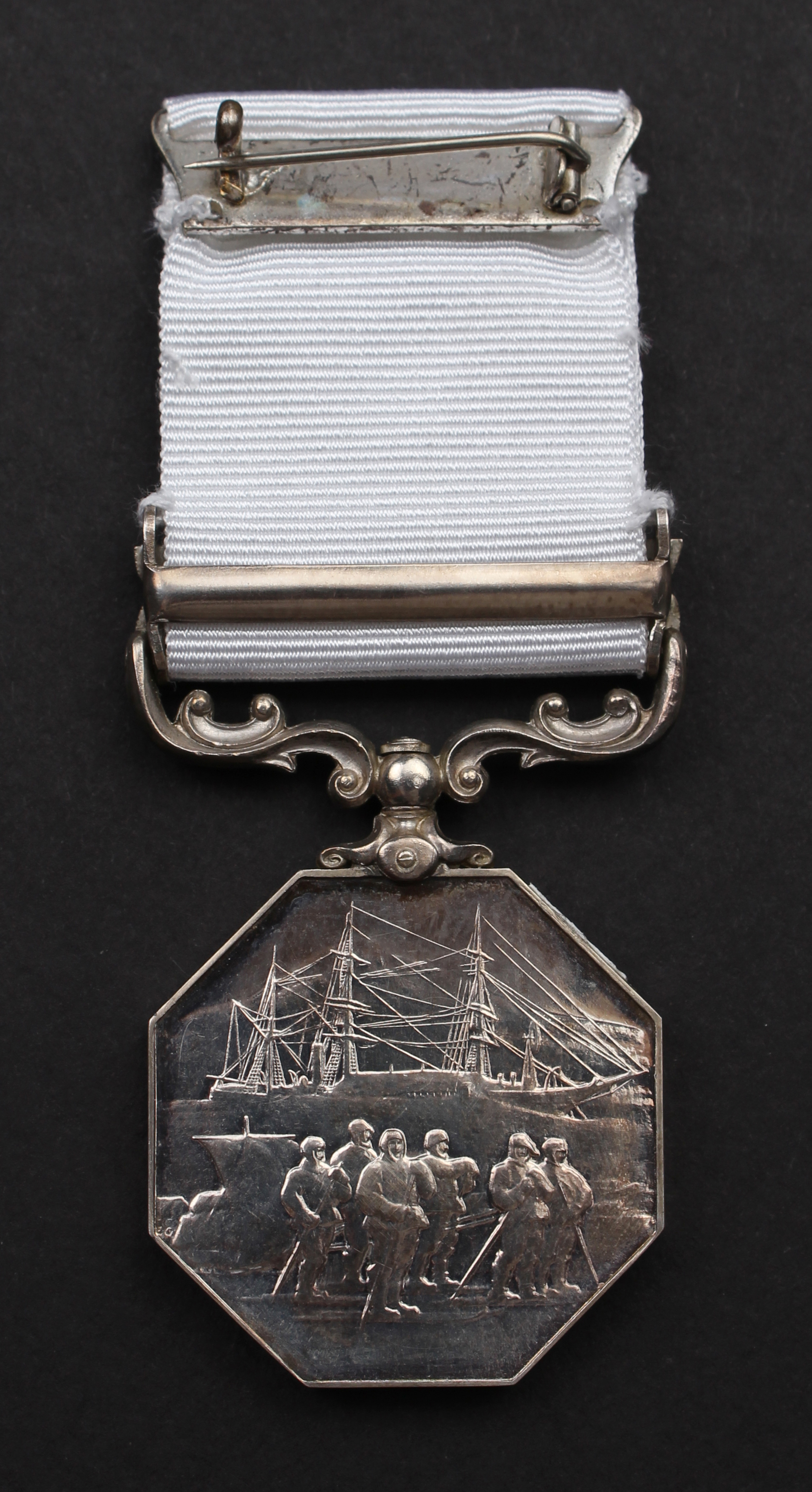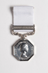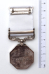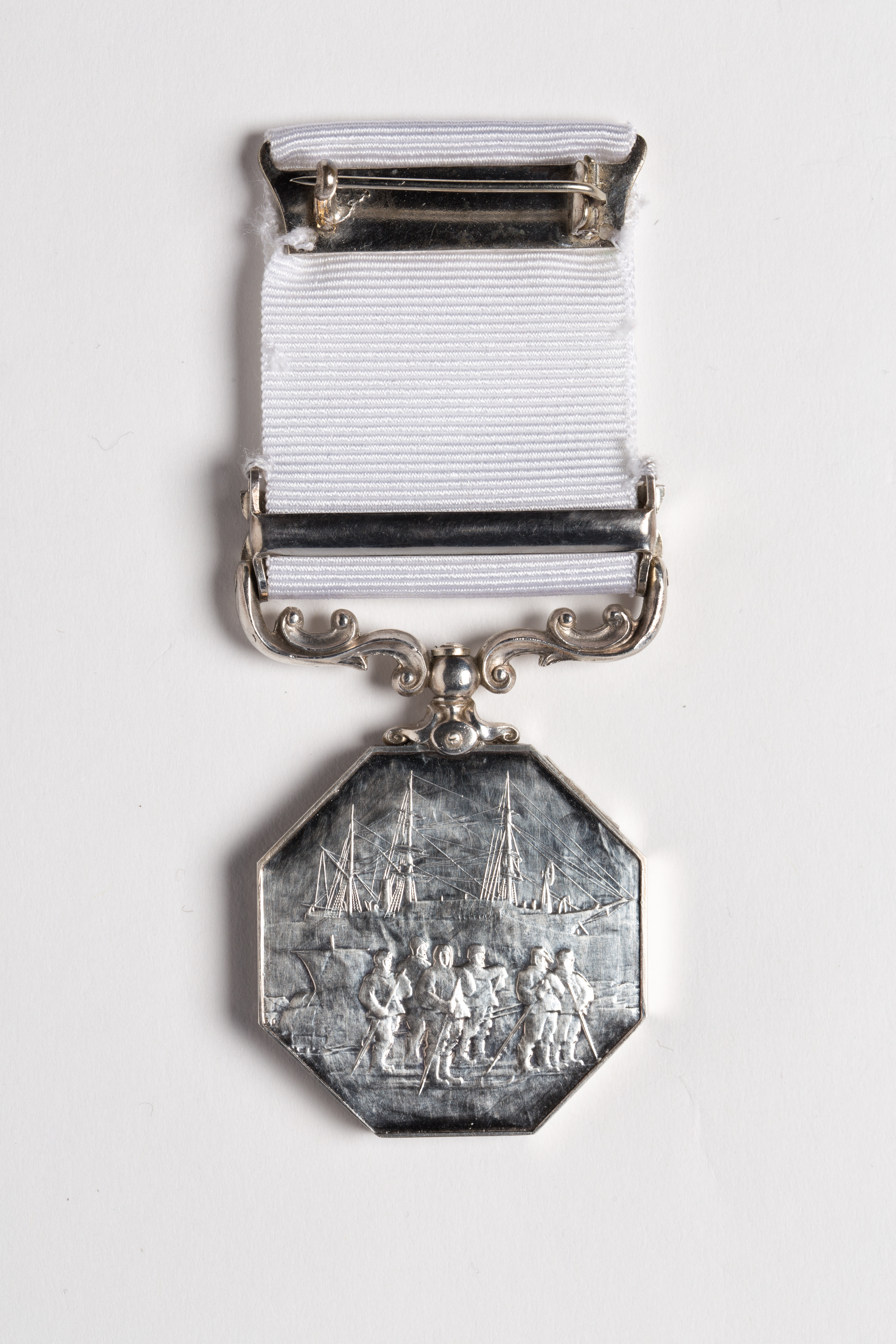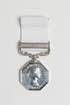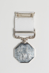 silver medal octagonal in shape with a white ribbon