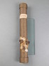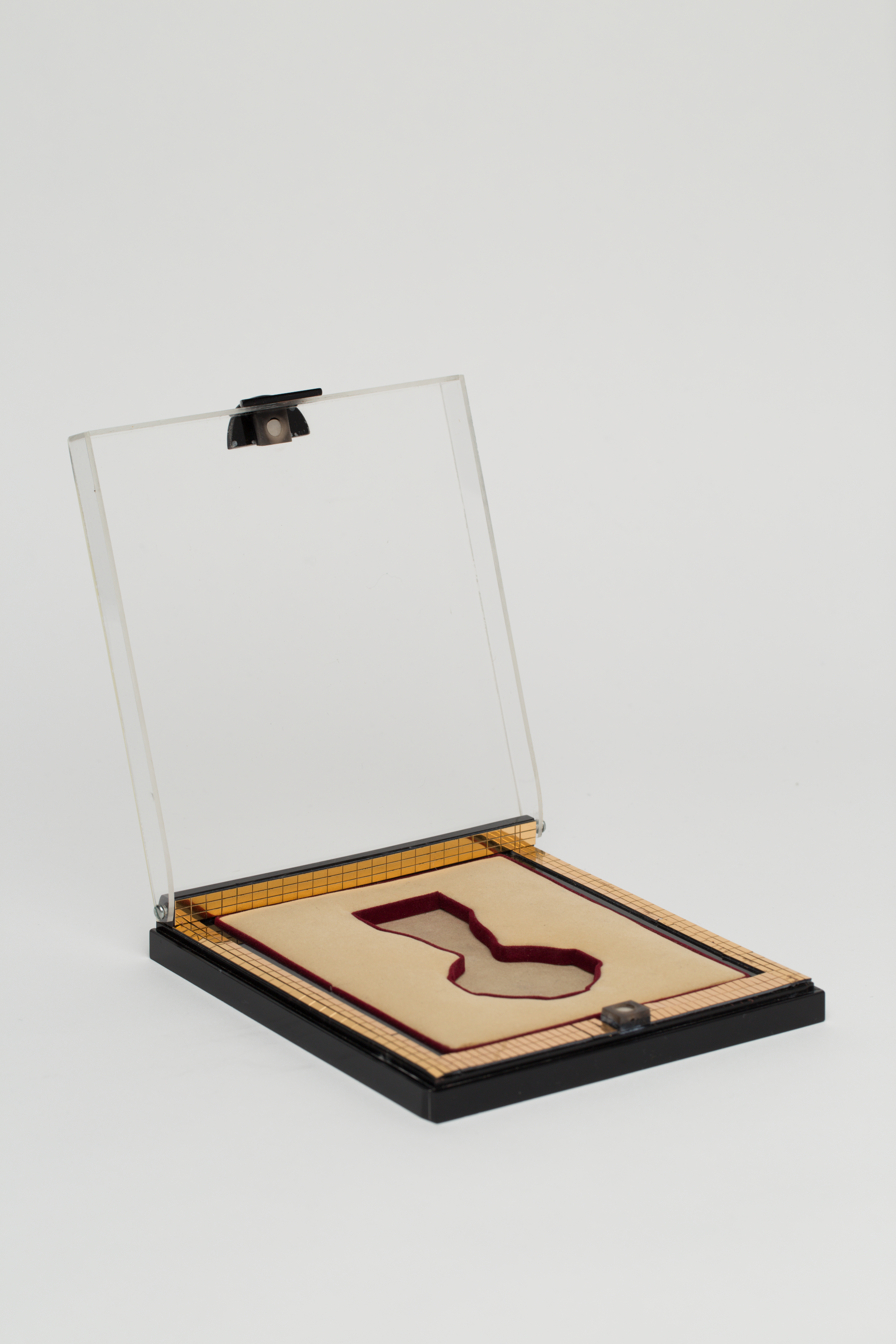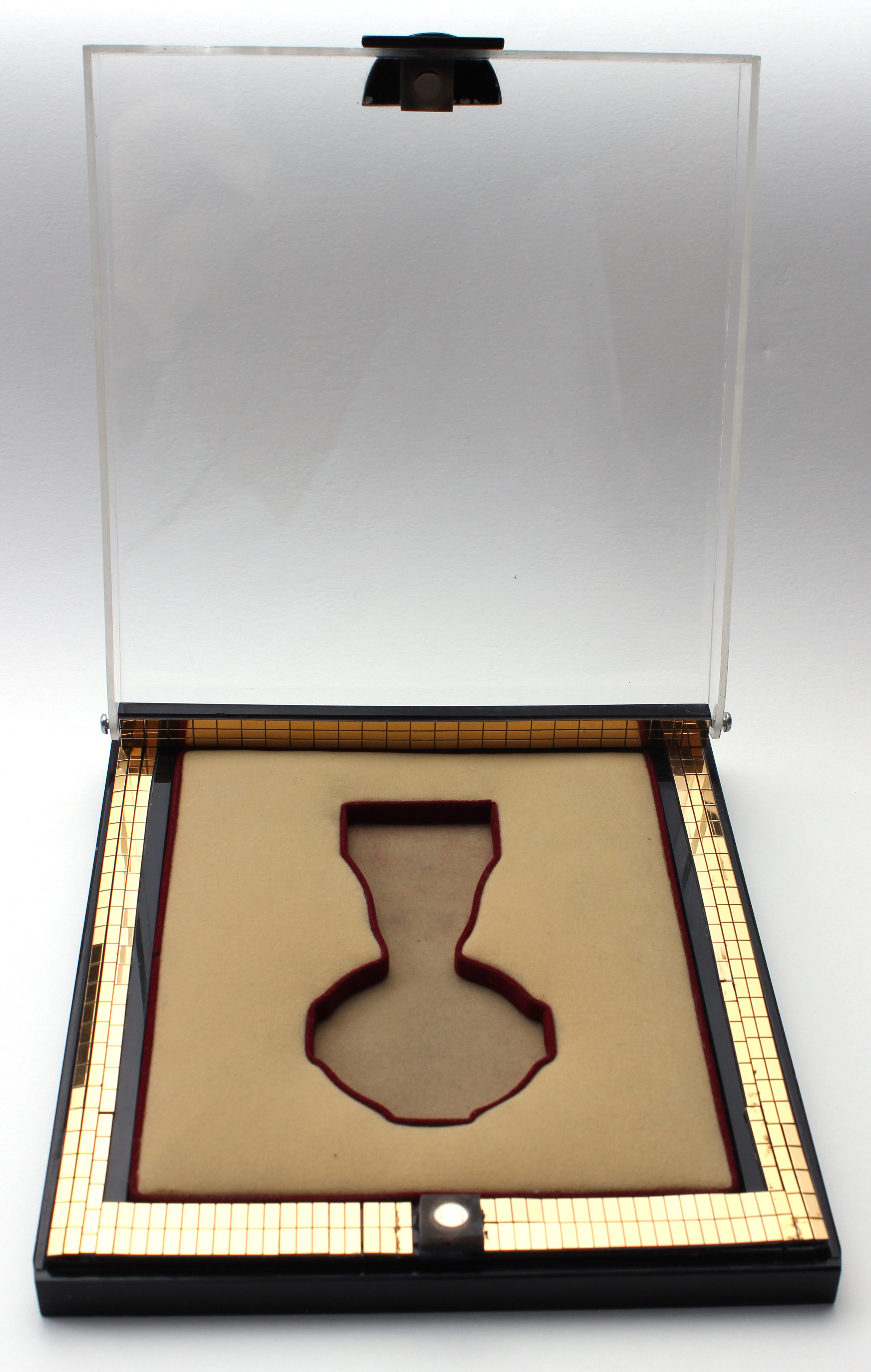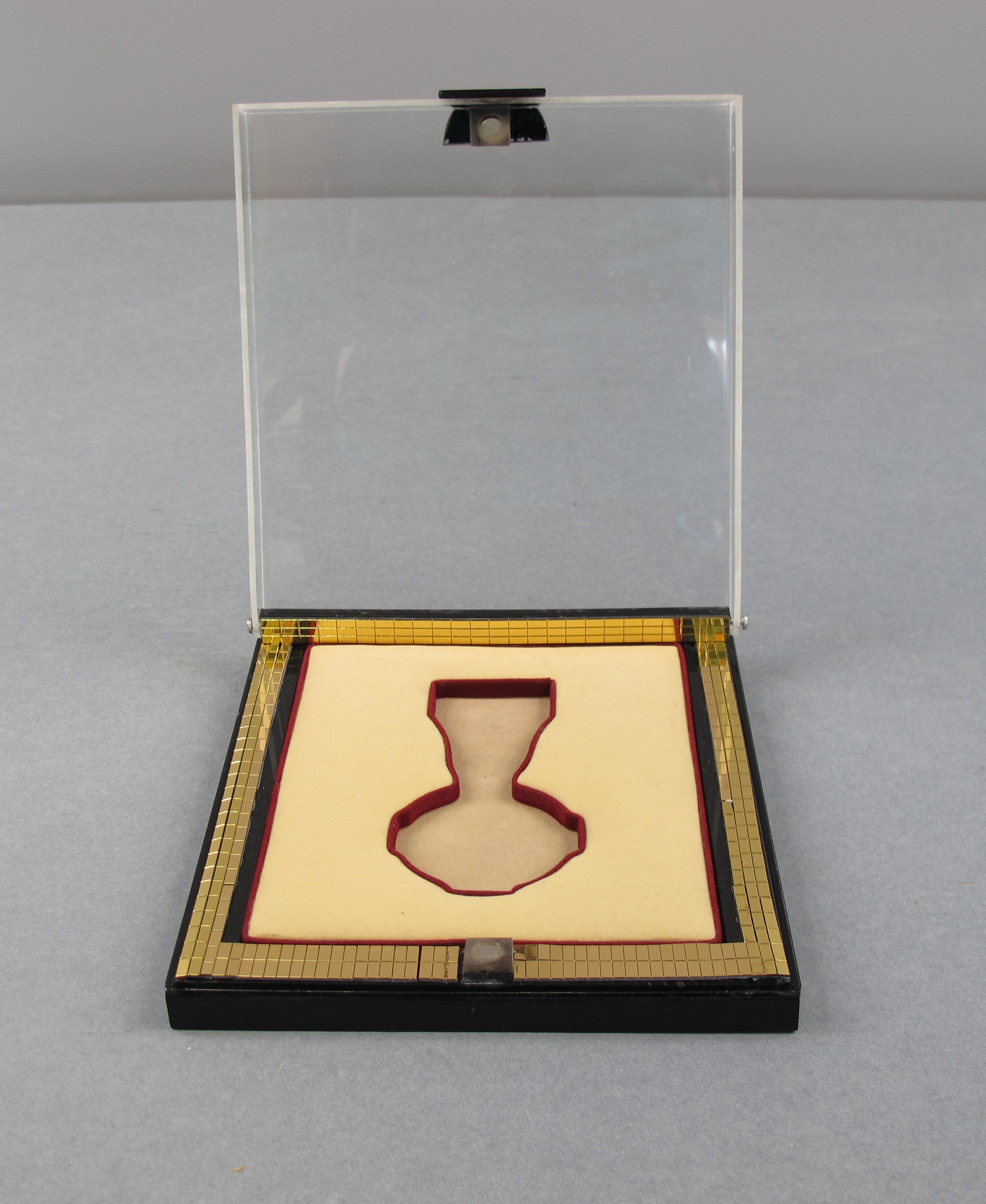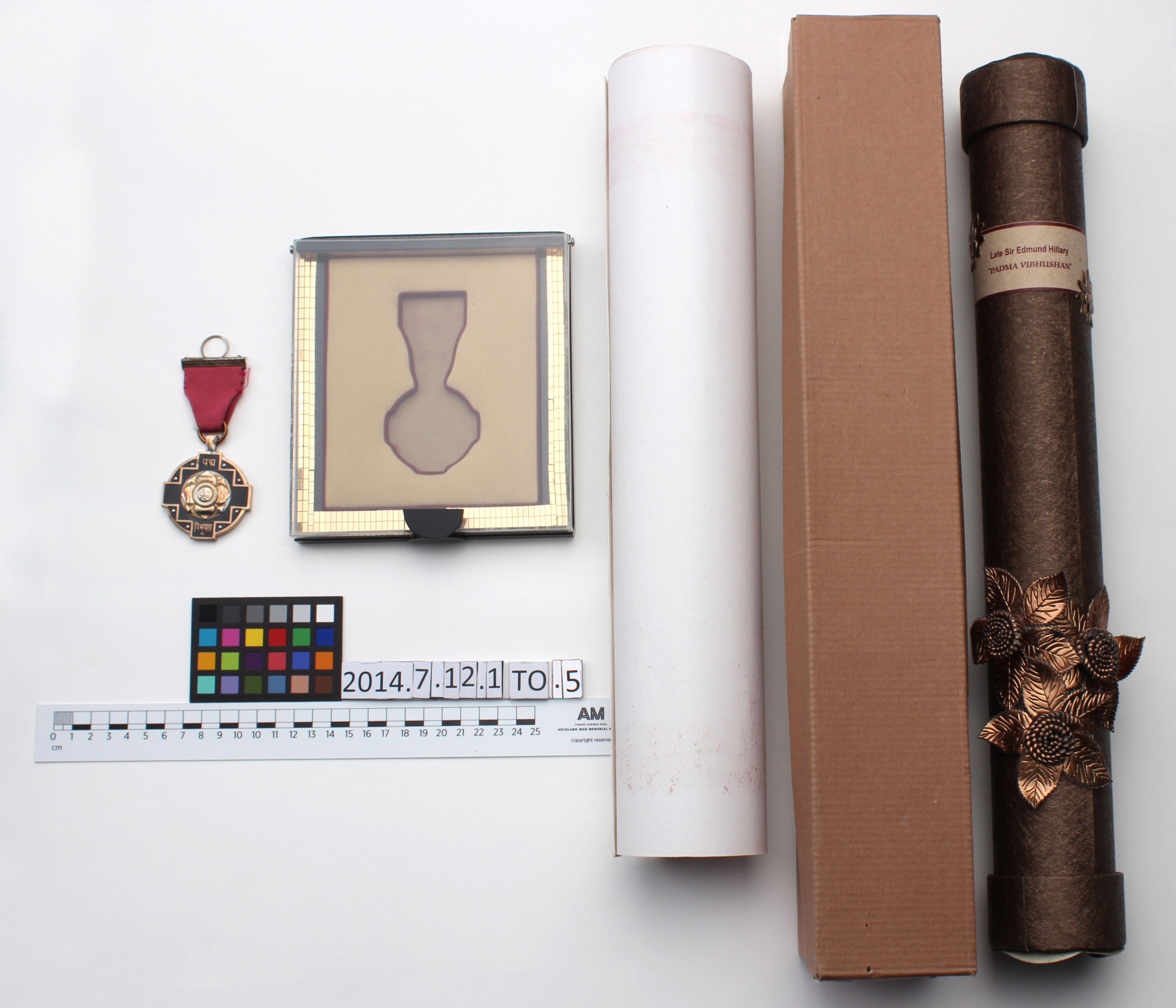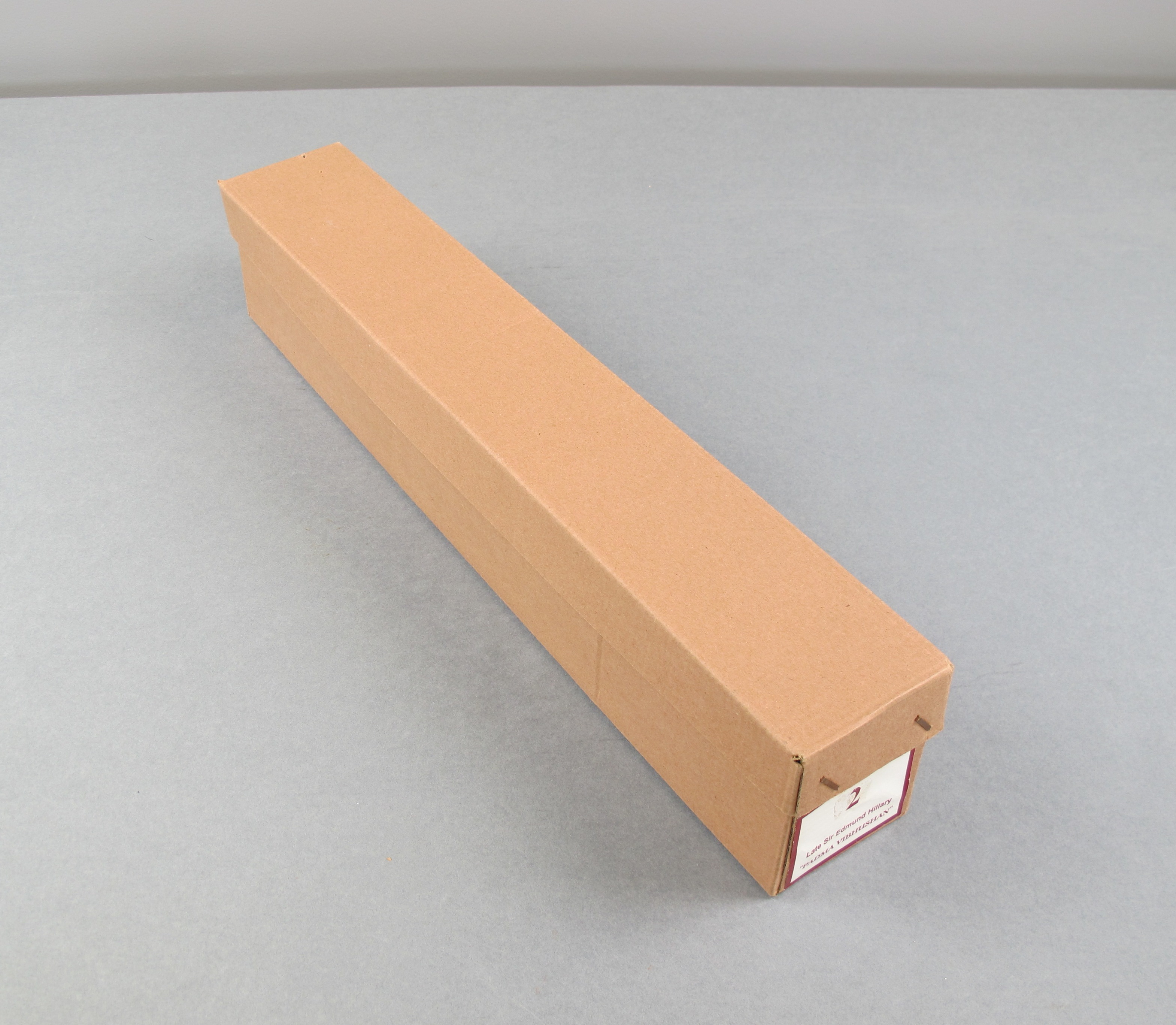 Associated material is a paper scroll (certificate) in a decorated cardboard tube, stored in a brown cardboard box.