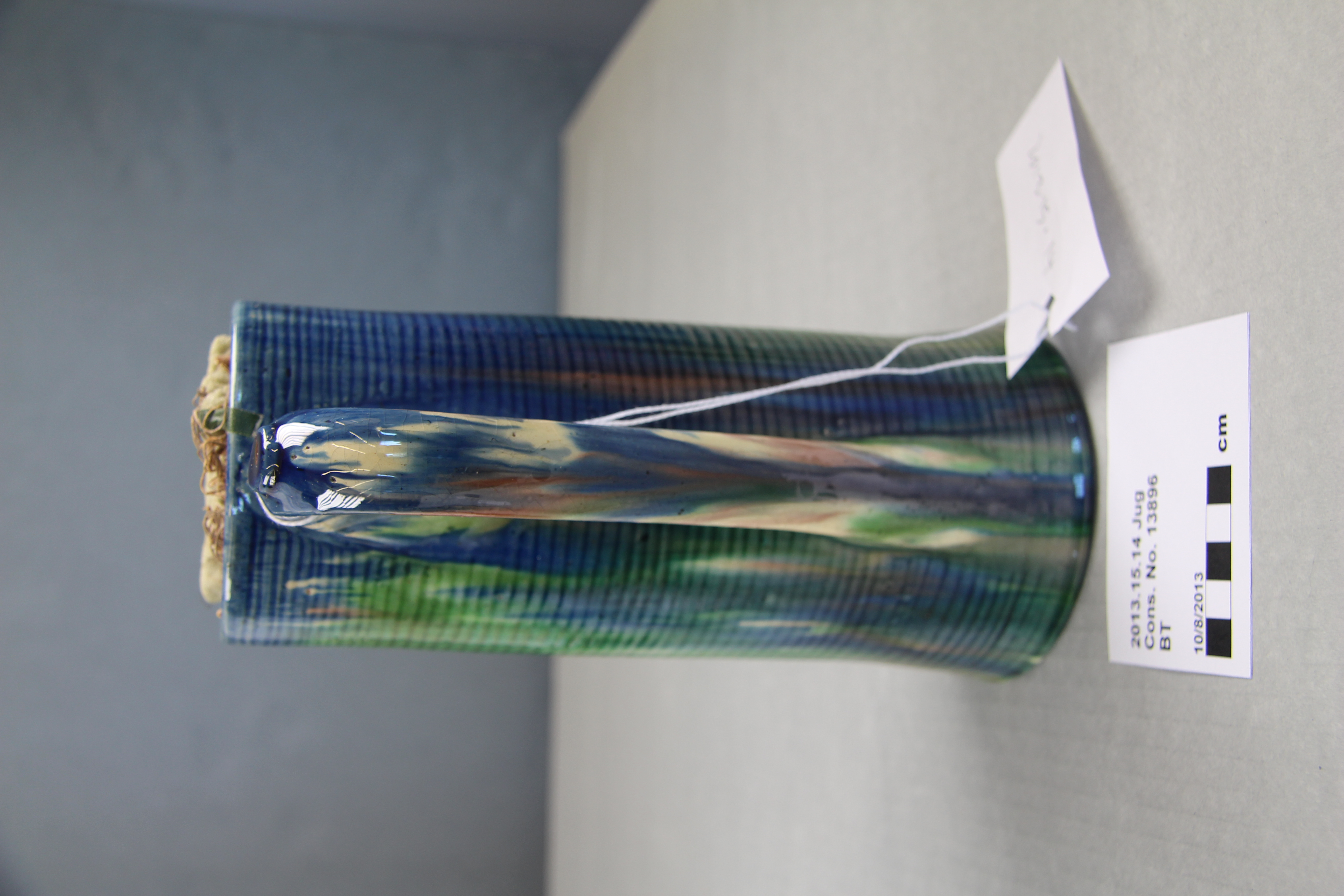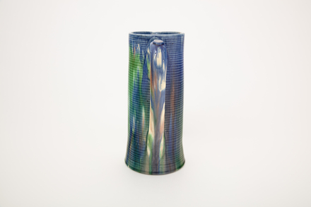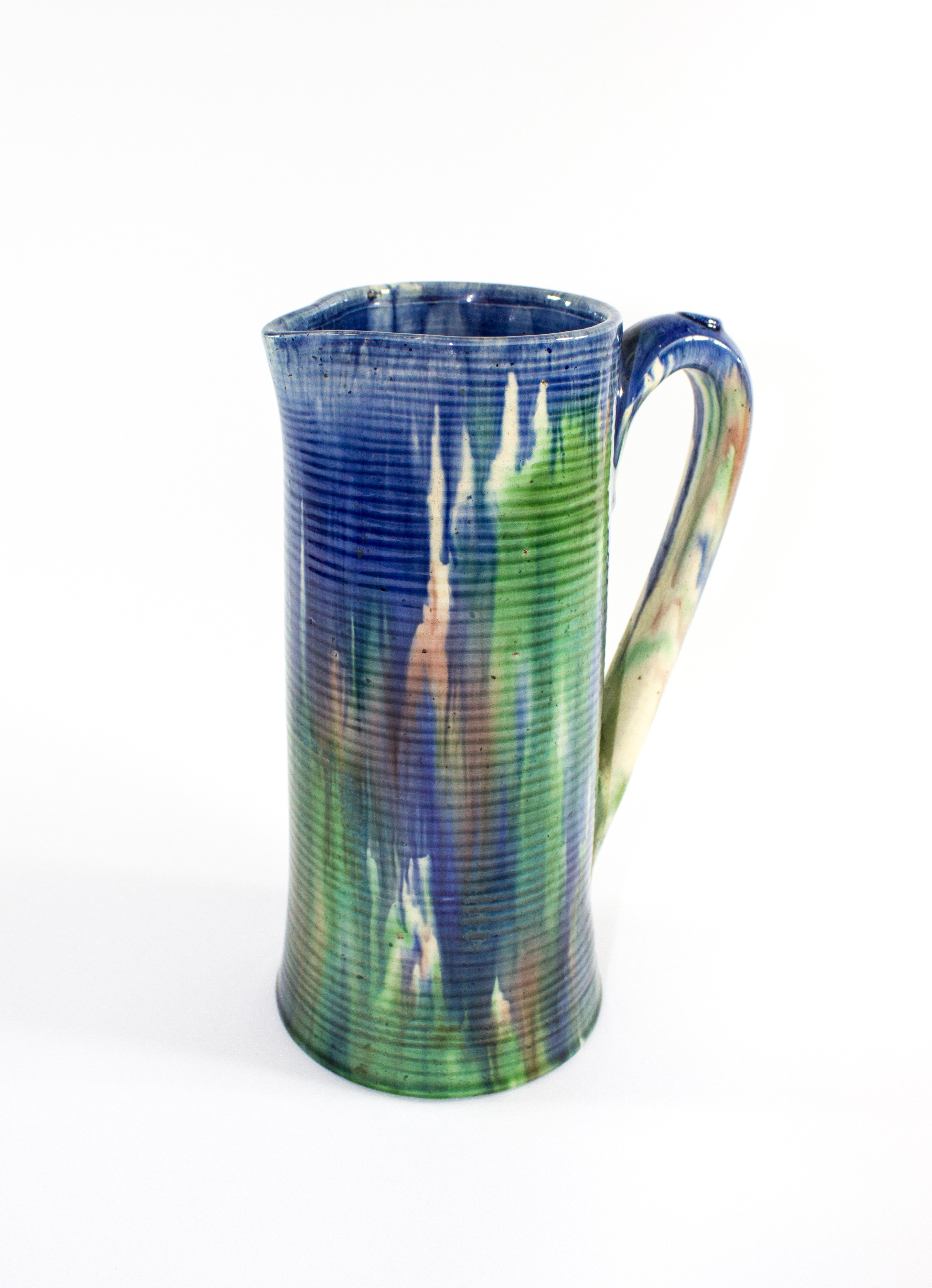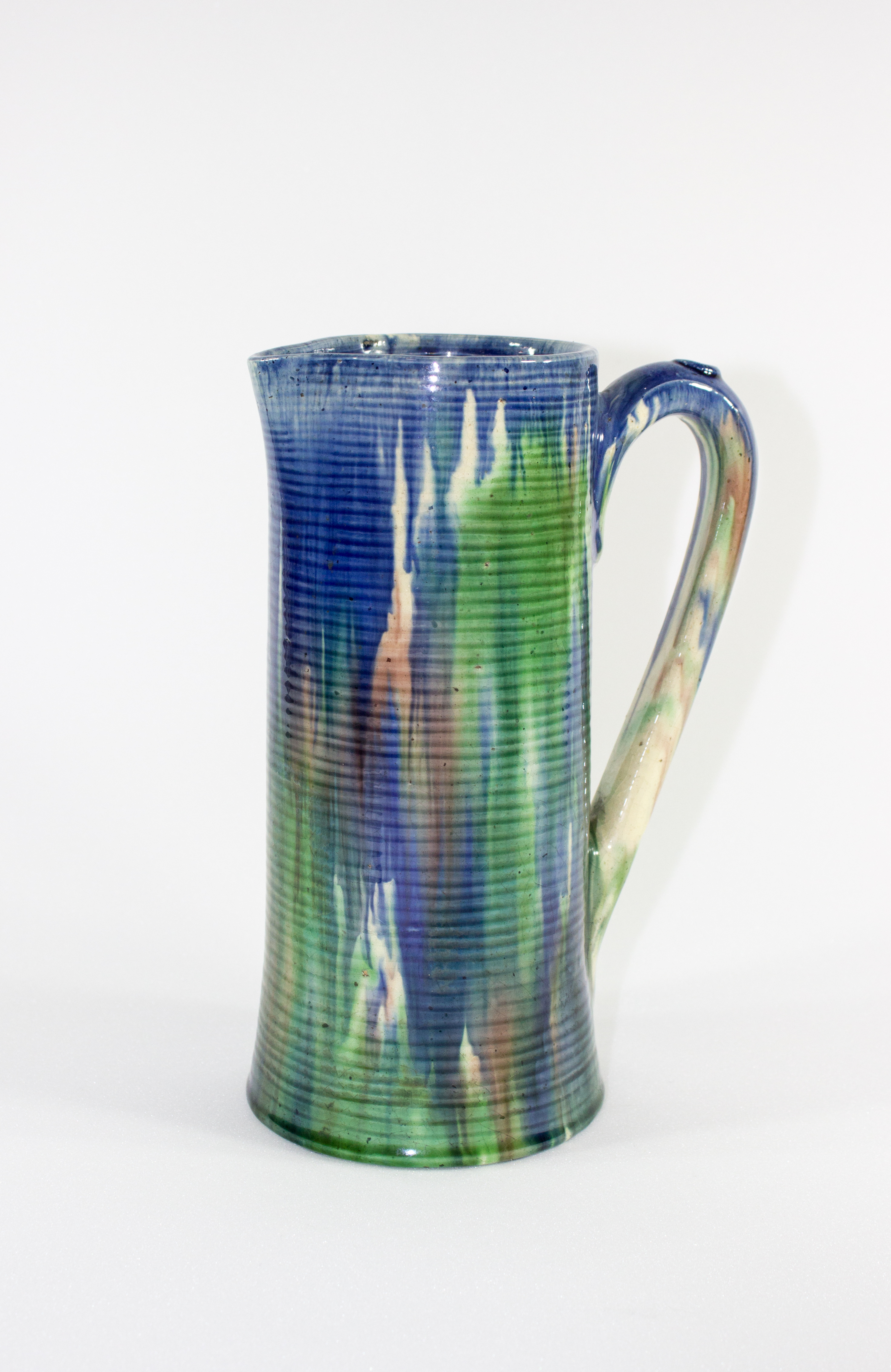 jug; ribbed; green, blue, purple; glazed; complete