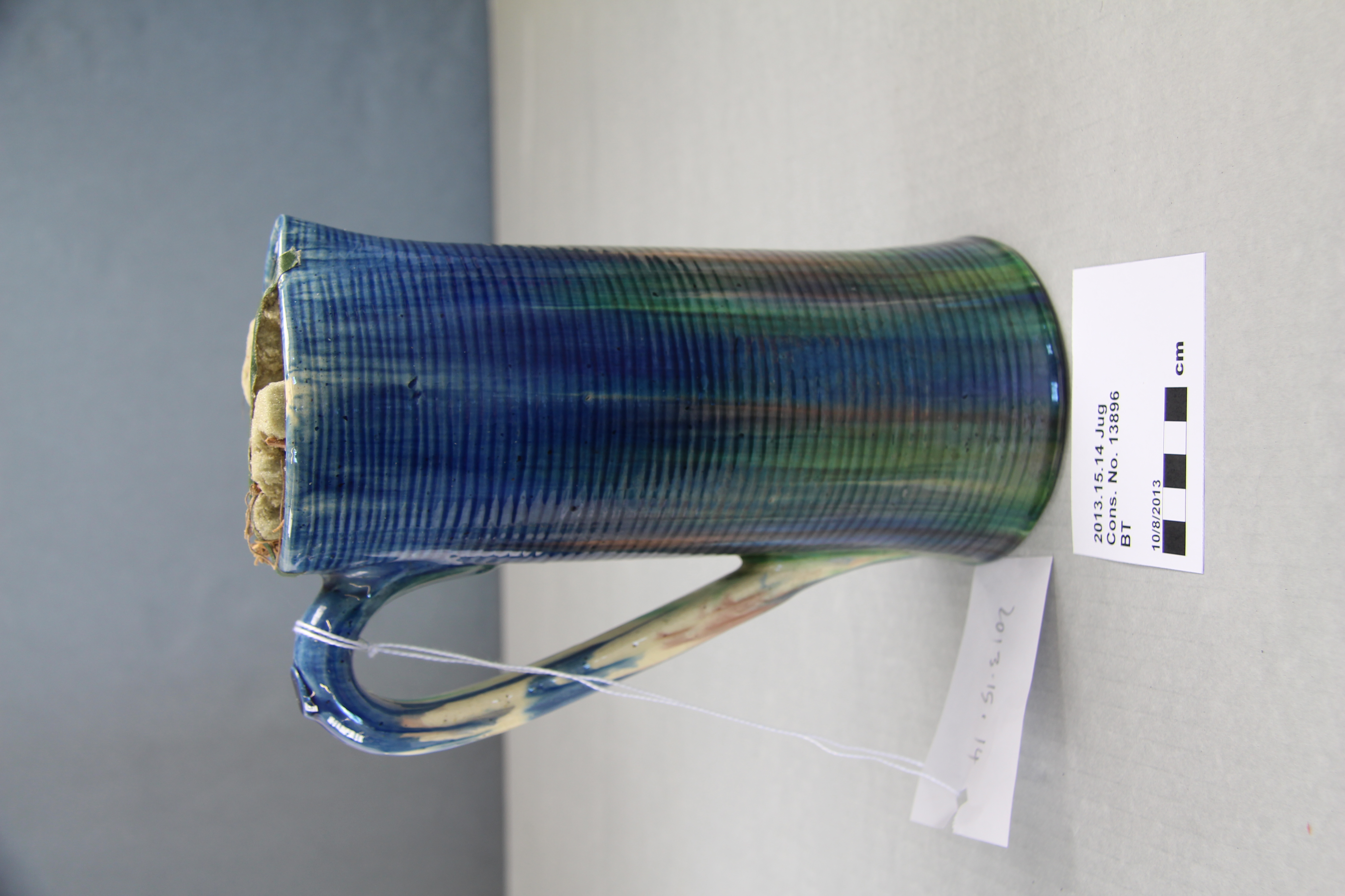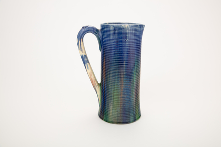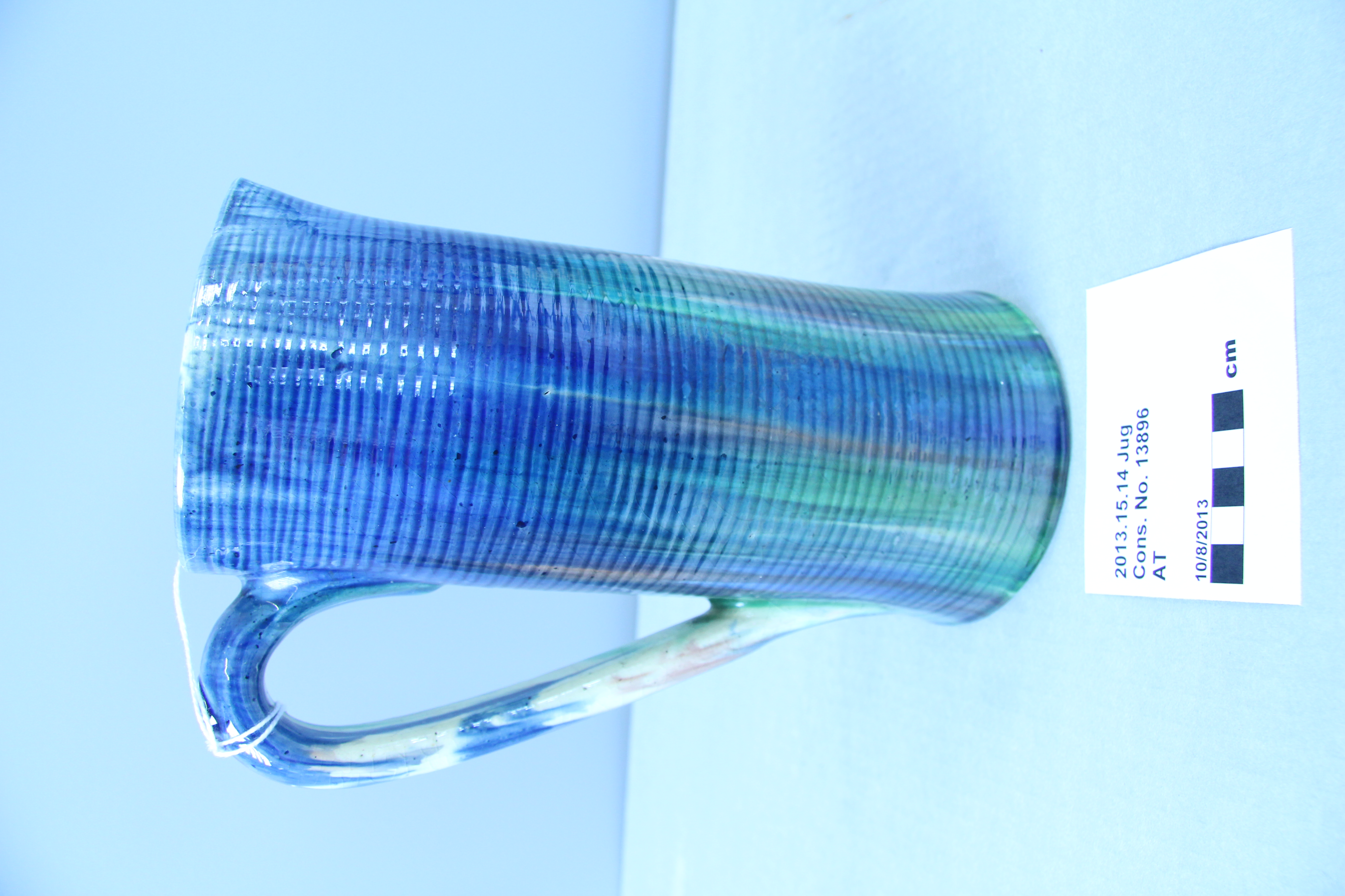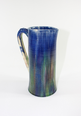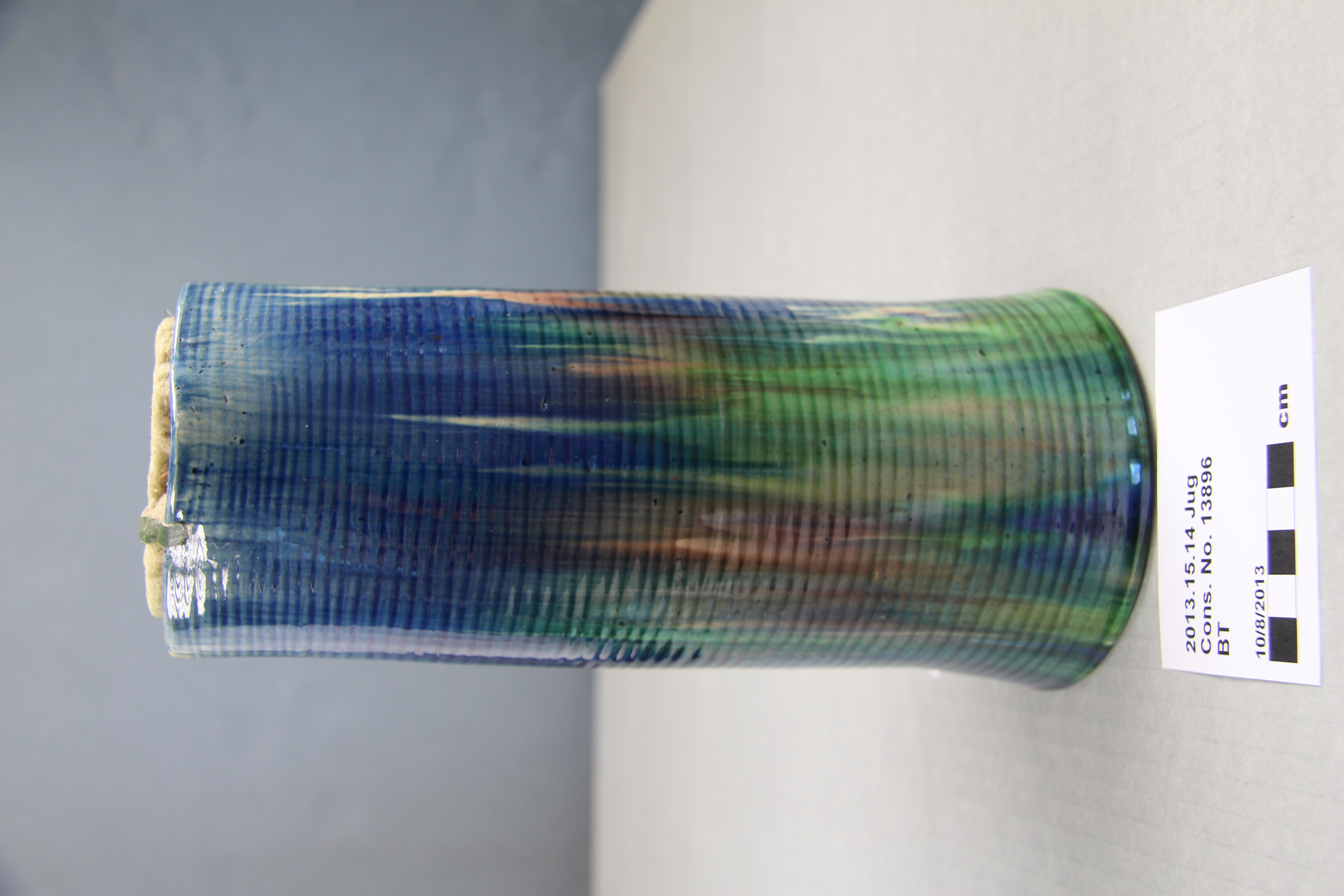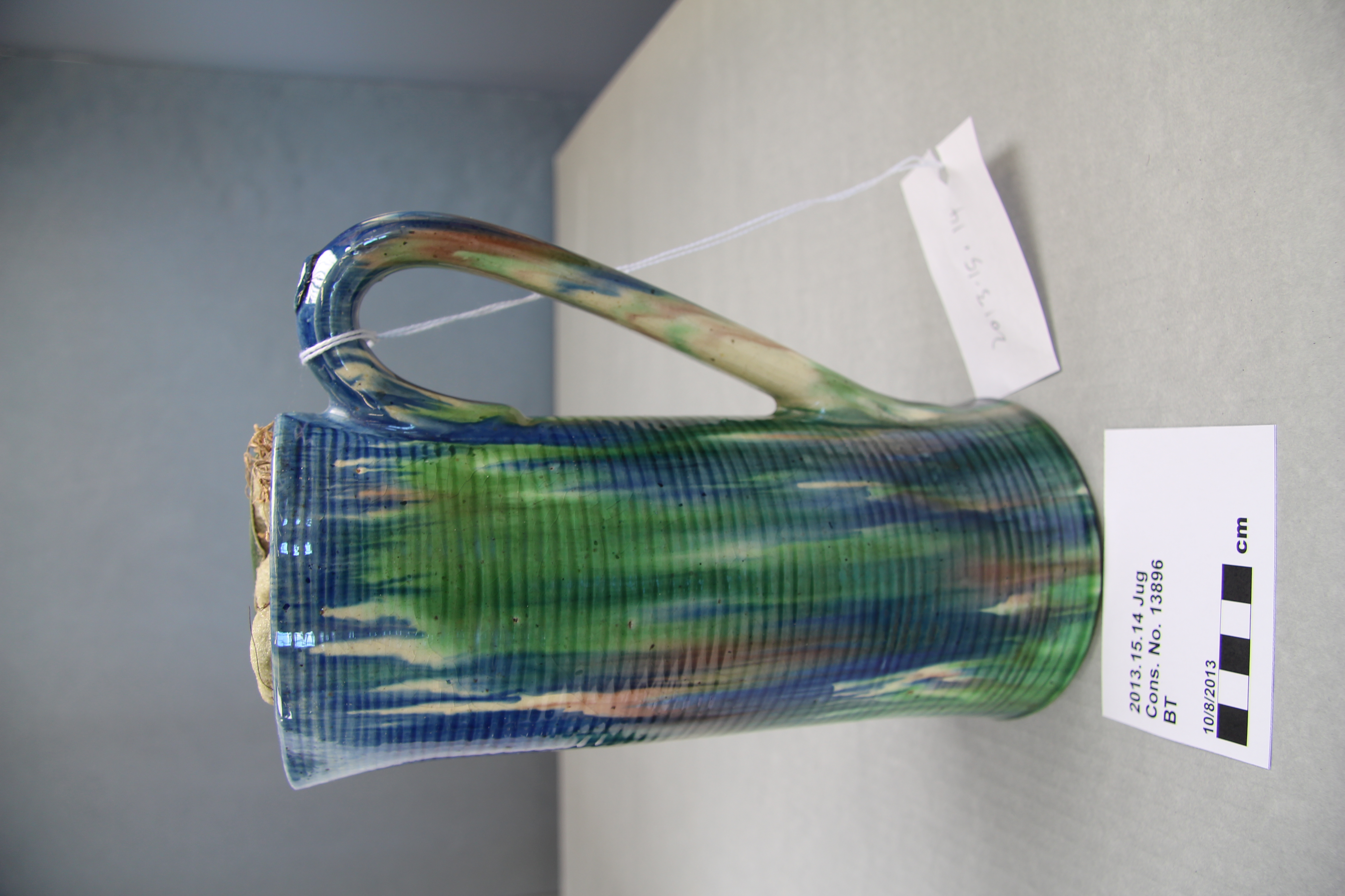jug; ribbed; green, blue, purple; glazed; complete