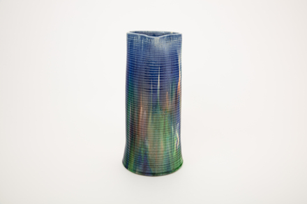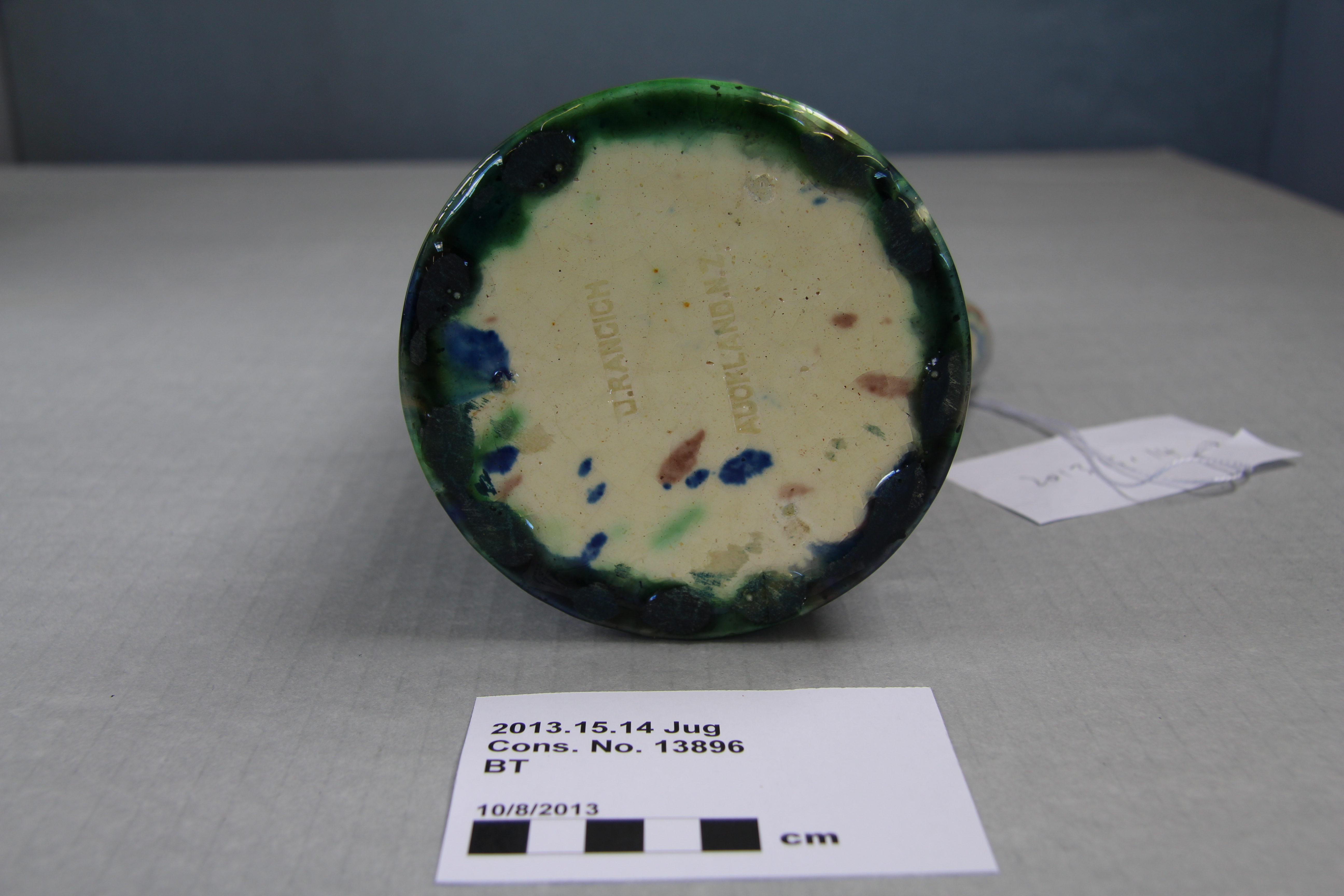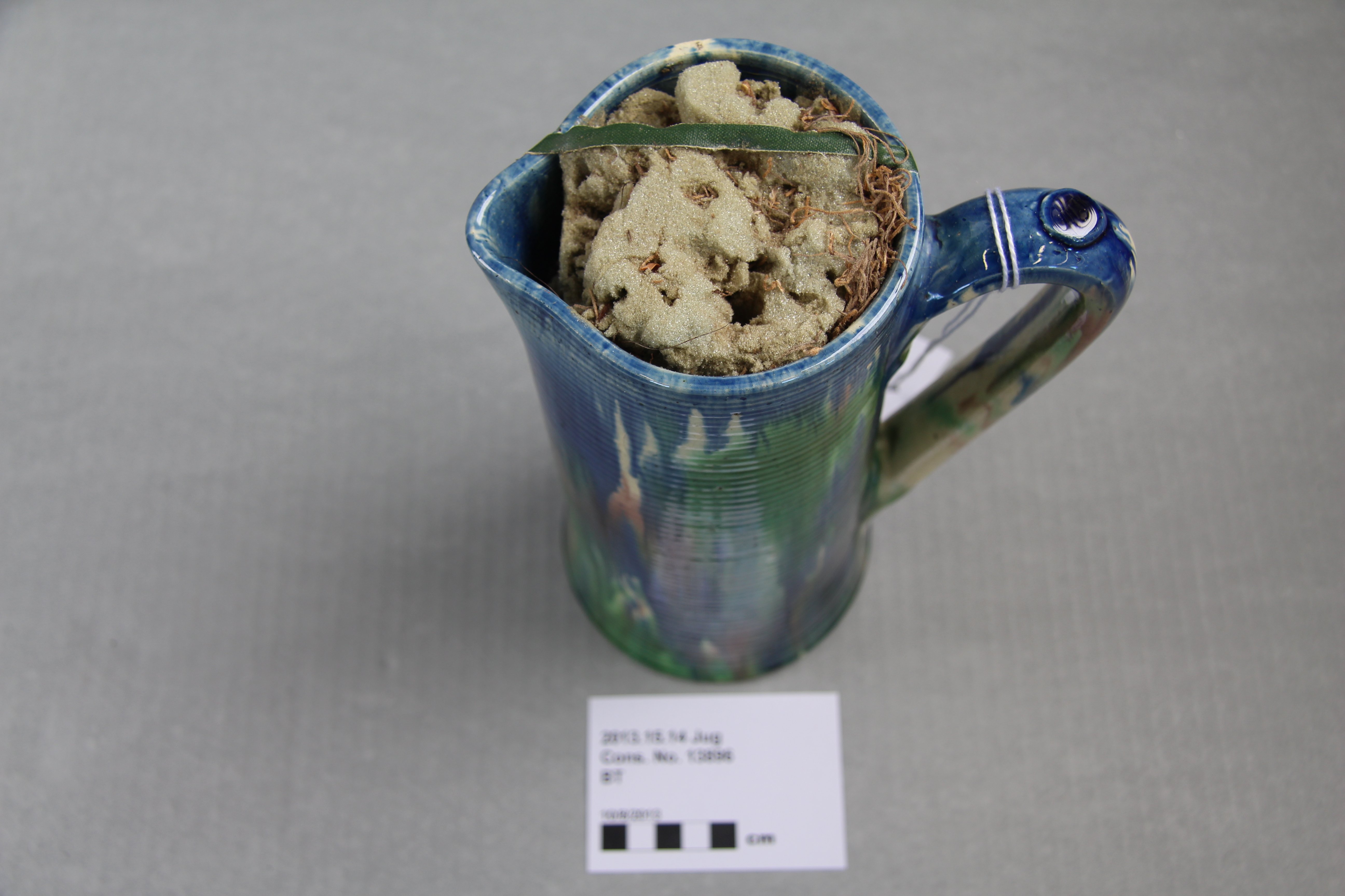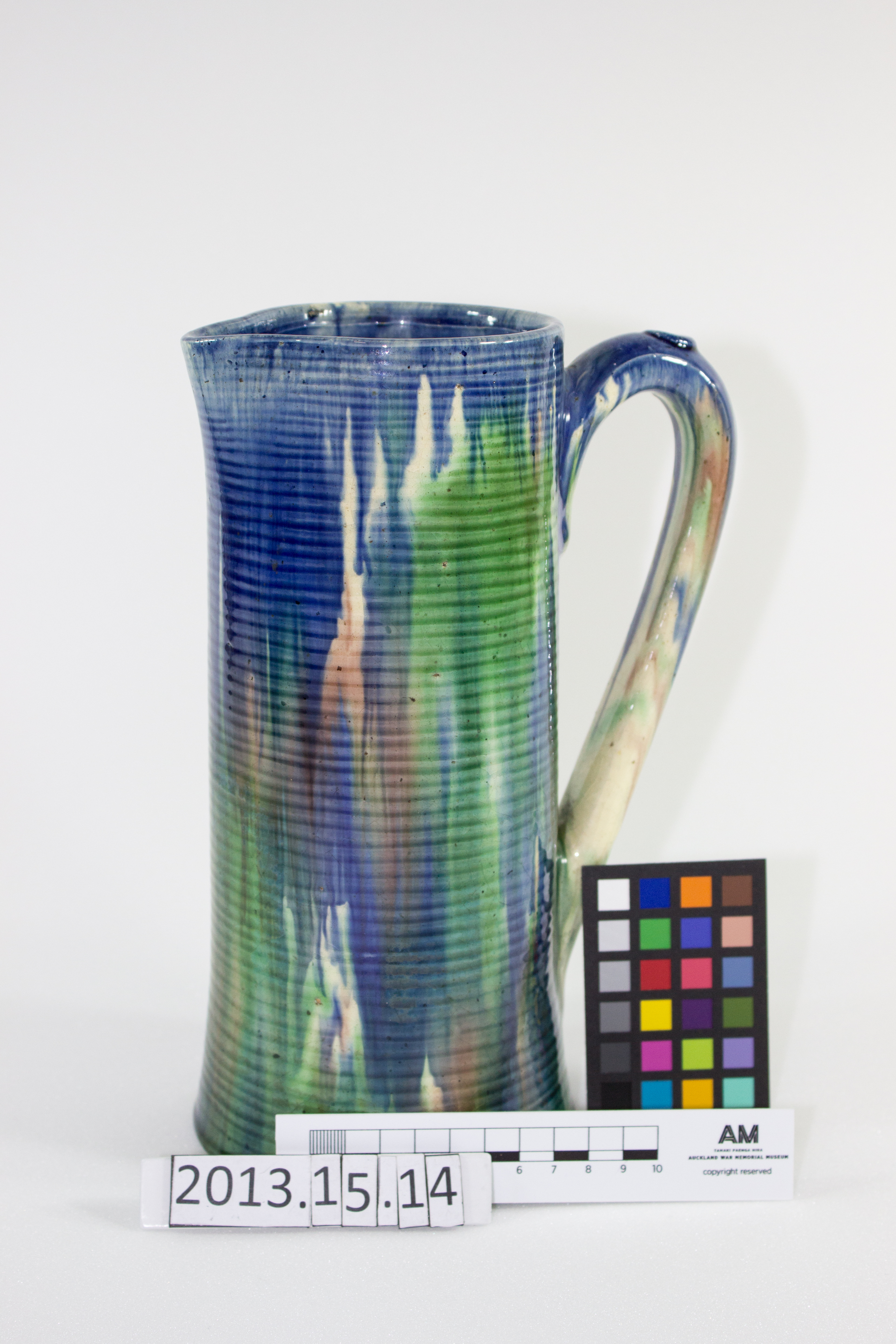 jug; ribbed; green, blue, purple; glazed; complete