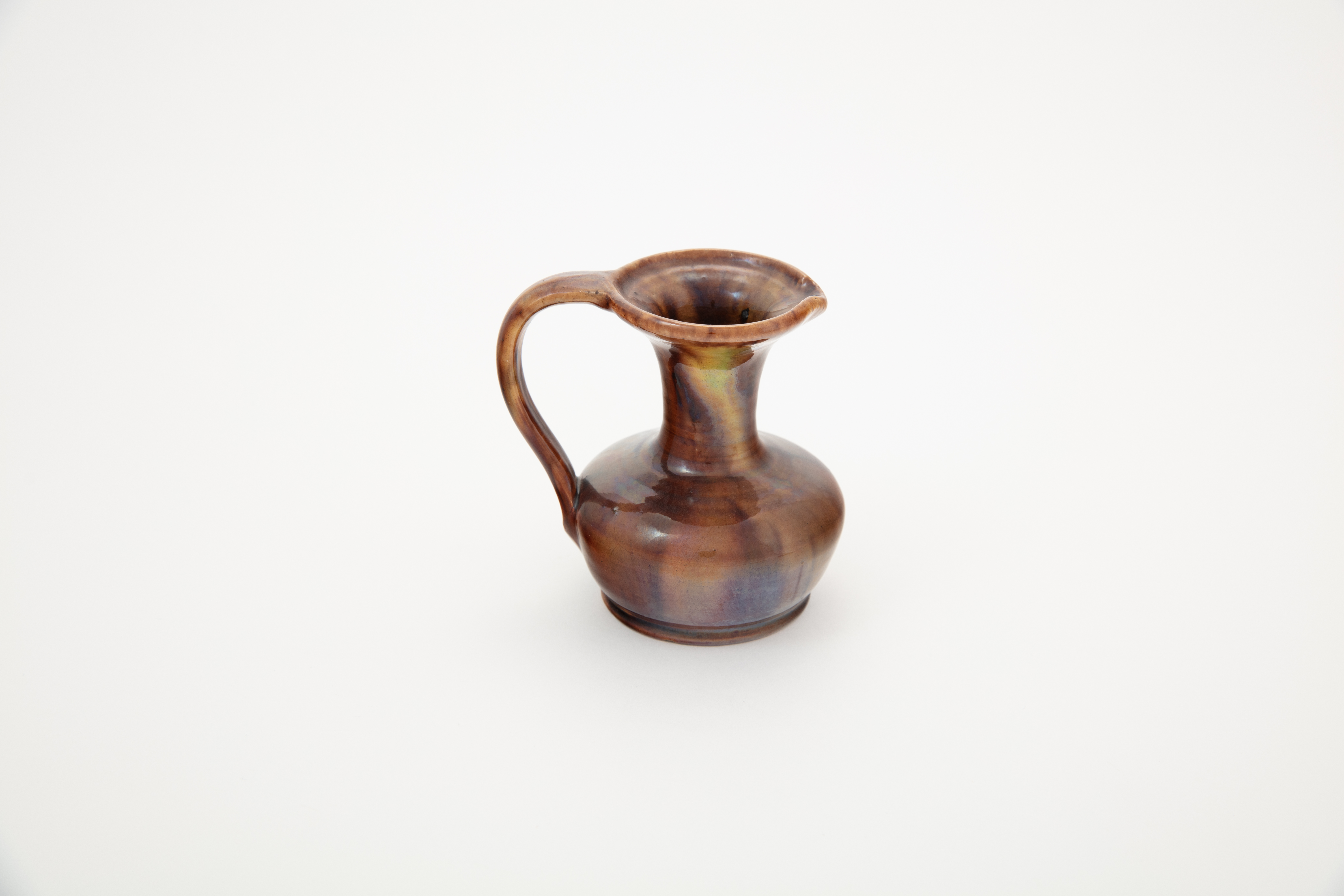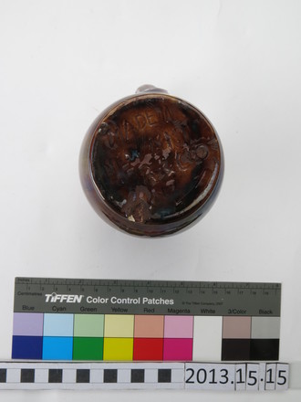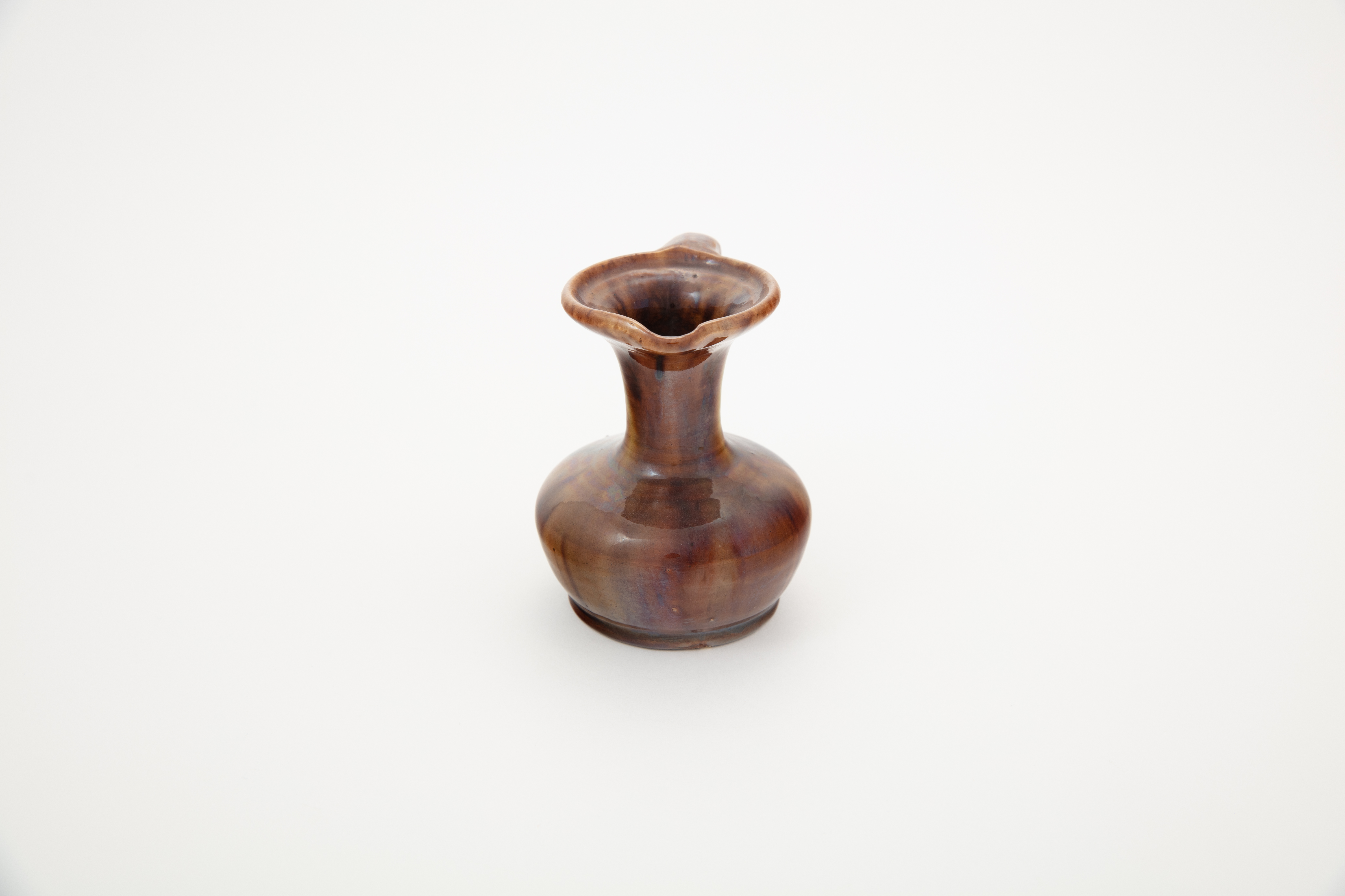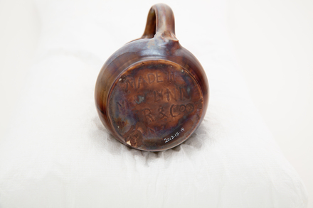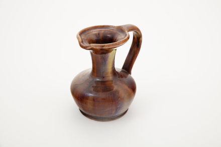jug; flattened, bulbous body, flared neck; brown; glazed; complete
