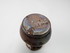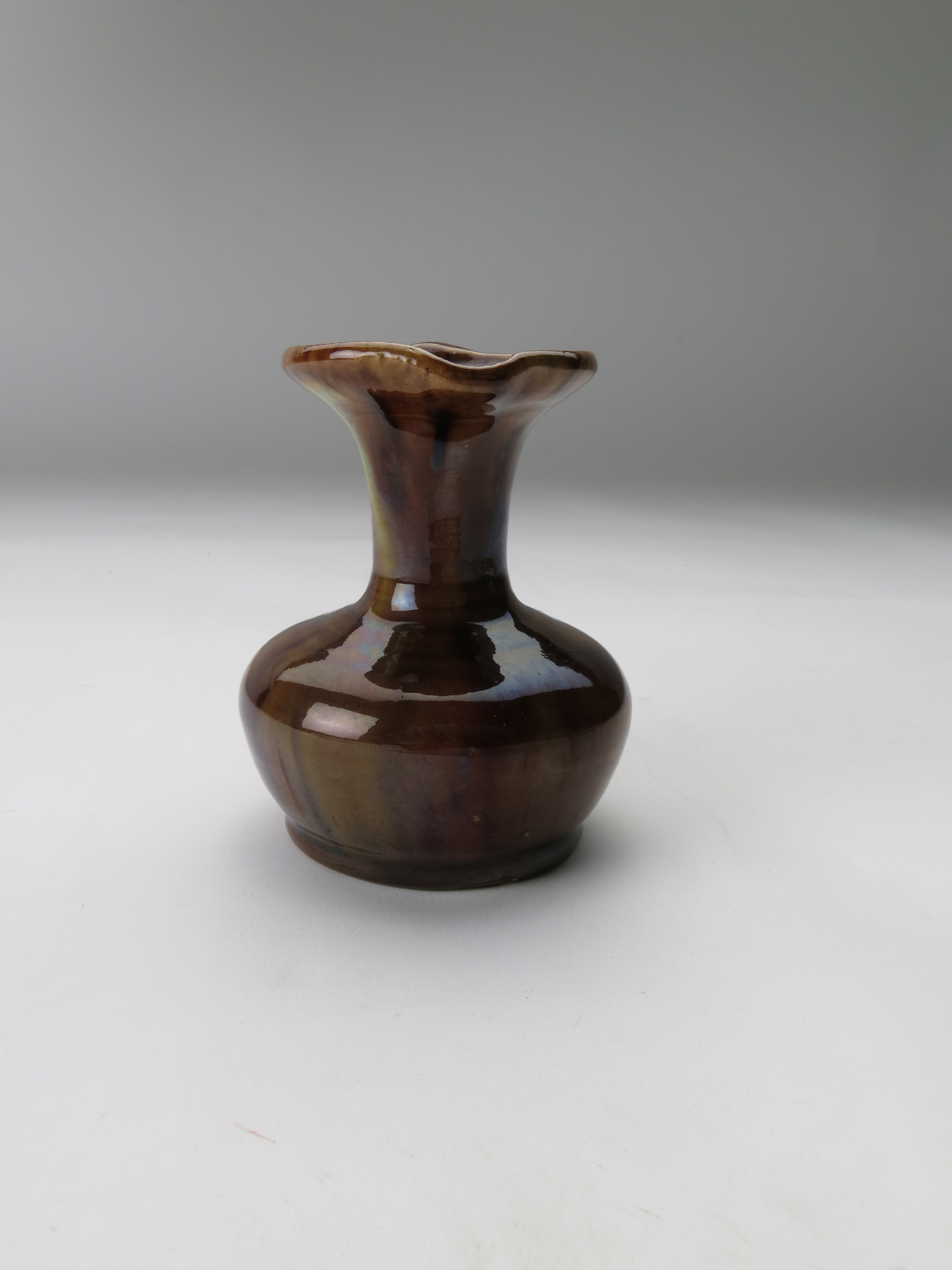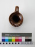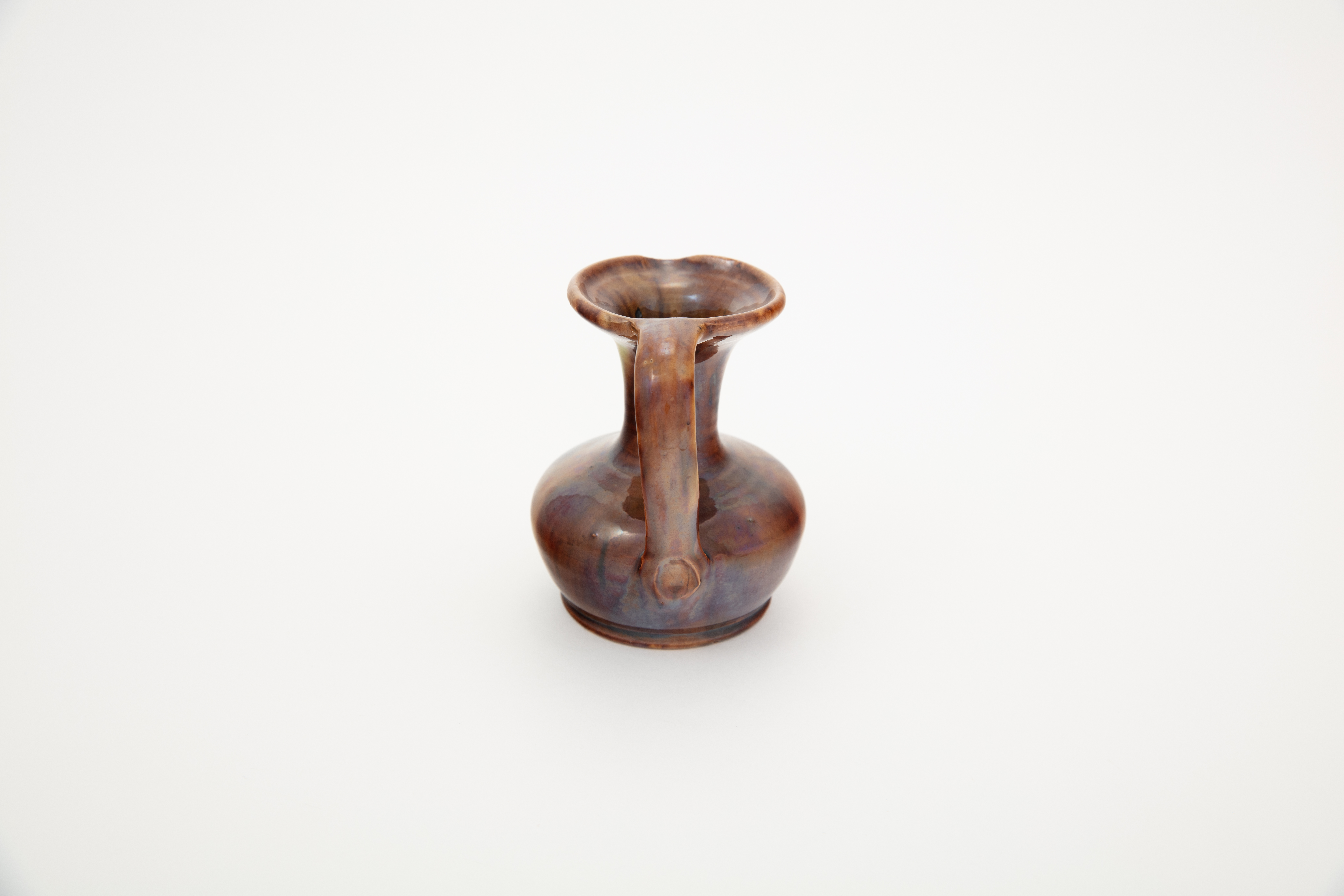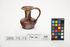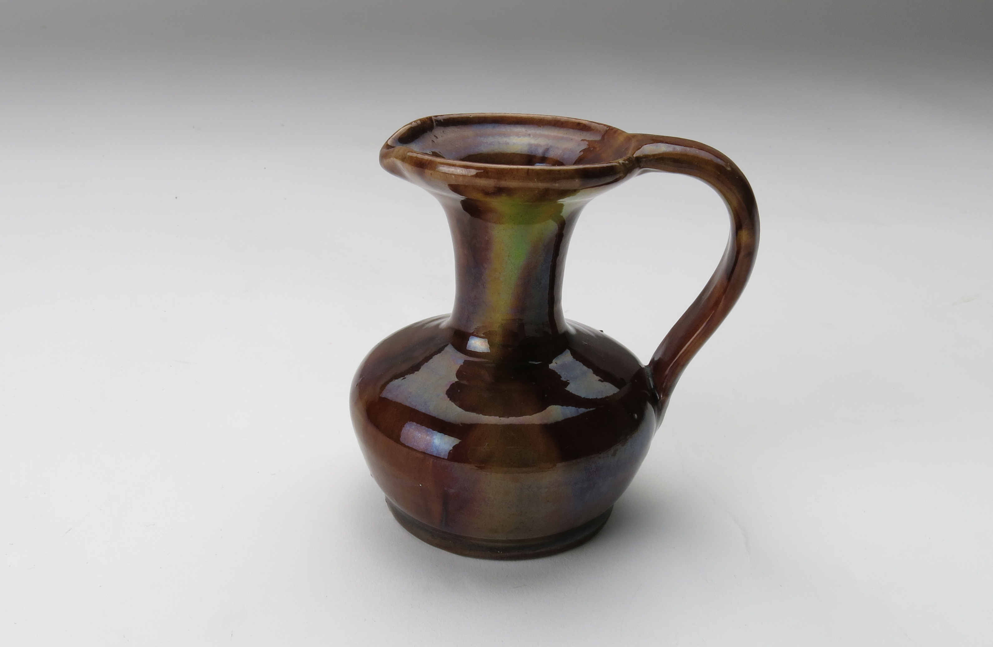 jug; flattened, bulbous body, flared neck; brown; glazed; complete
