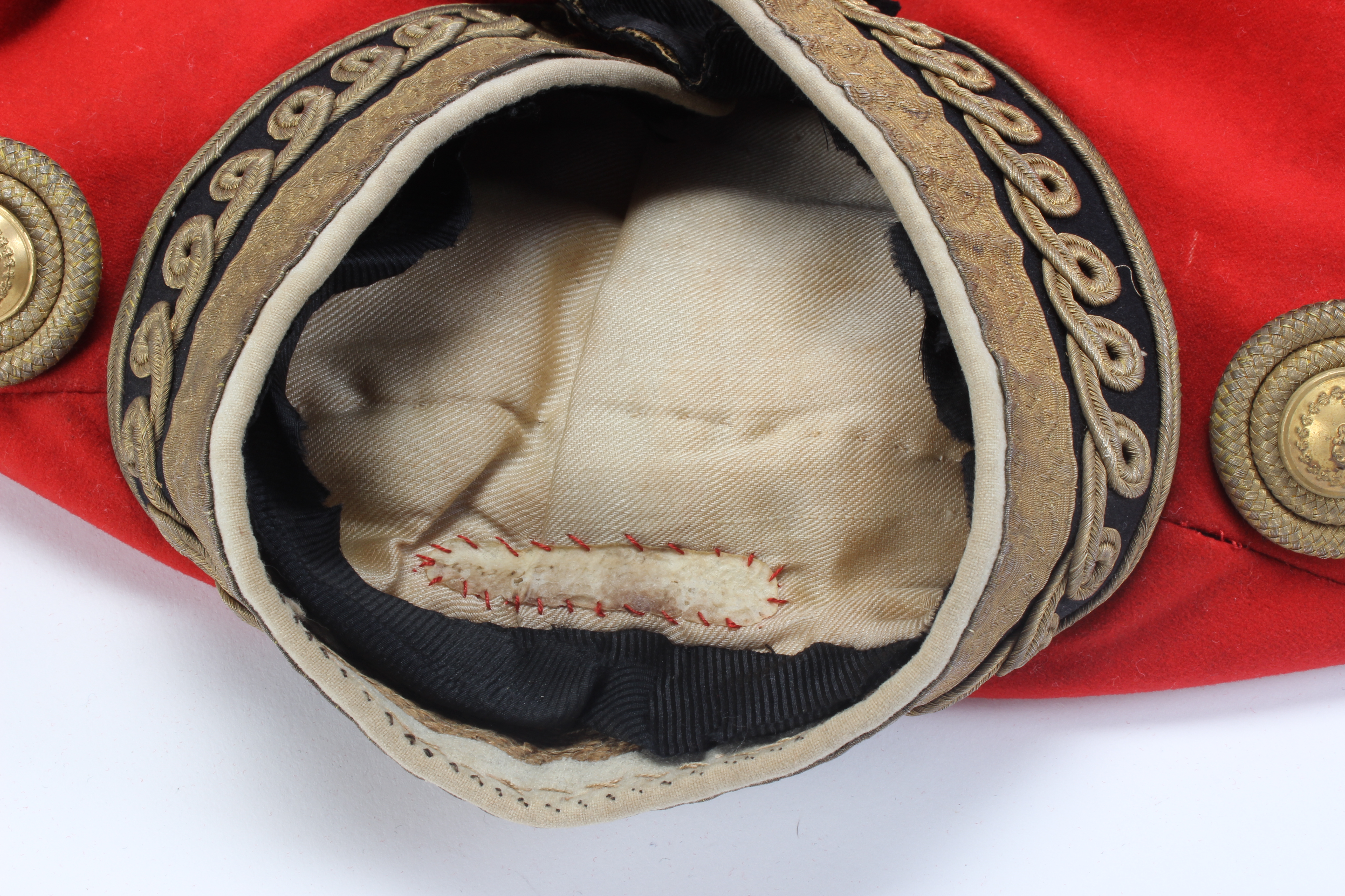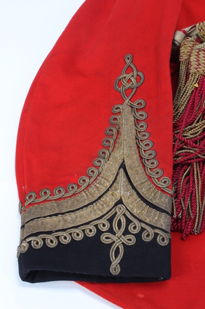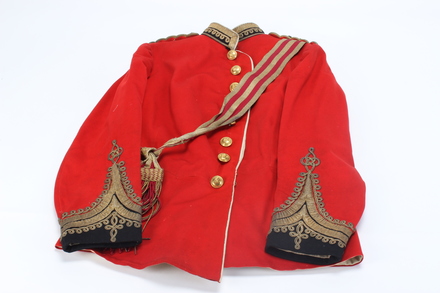 red tunic with gold braid and lace; belonged to Lieutenant Colonel Charlton Dawson; collar has gold lace edge and braid inset; buttons: crowned harps with inside laurel wreath; sash: full-dress uniform sash; associated with the "Prophets War".