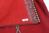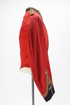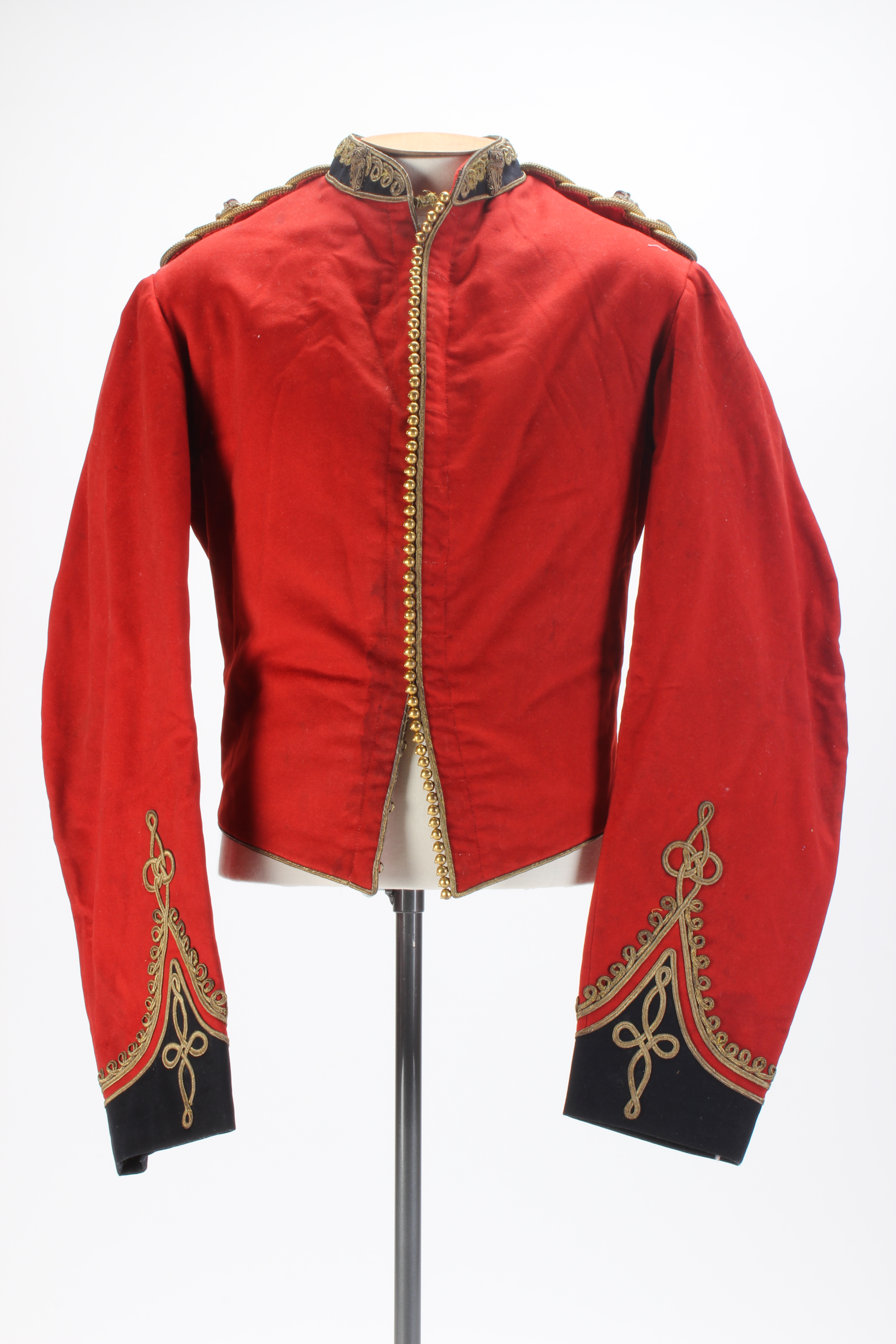 Mess jacket; red cotton blend with short dense pile; front opening with hidden hook and eye fastenings; gold piping along opening edge and hem; gold beads running down front opening edge; cuff length sleeves with black cuffs and gold ribbon embellishments; short black standup collar; satin lining; hidden interior pocket at front breast; gold swirl passants, raised embroidered crown on each passant, embroidered :R on each passant, gold coloured button with lyre on each passant;