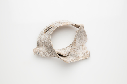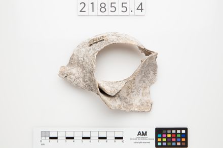 trumpet, shell. puutaatara. Charonia lampas capax. Shell smooth over all surfaces. Ribs on varix ground to form a flat, sharp edged ridge. A notch, 11x6 mm, has been cut on 1 side of the anterior canal (same side as inner apertural lip) and a perforation made within the notch and through the shell wall. Mislabelled 21855.4. Apertural lip only, dorsal surface of body whorl broken.