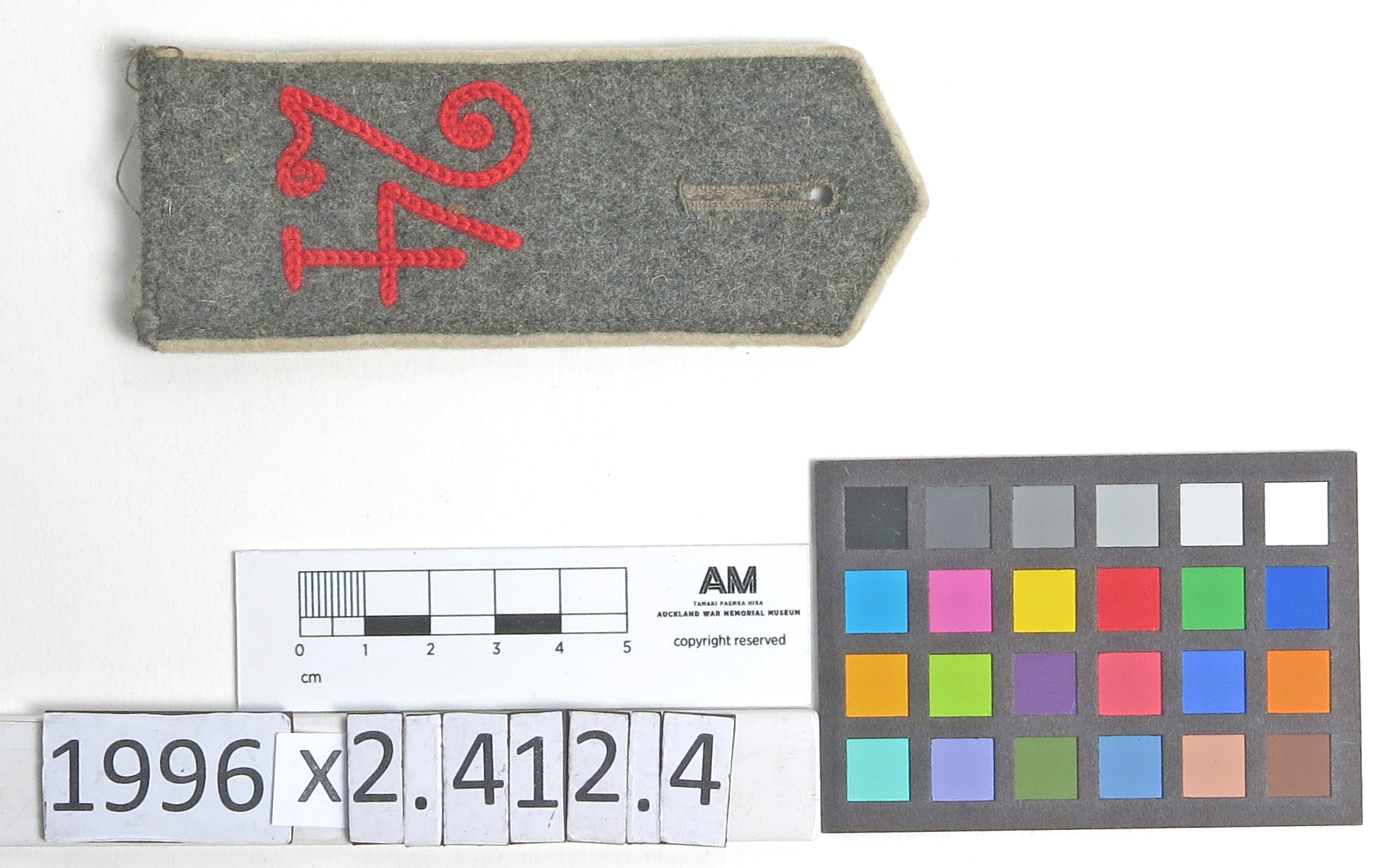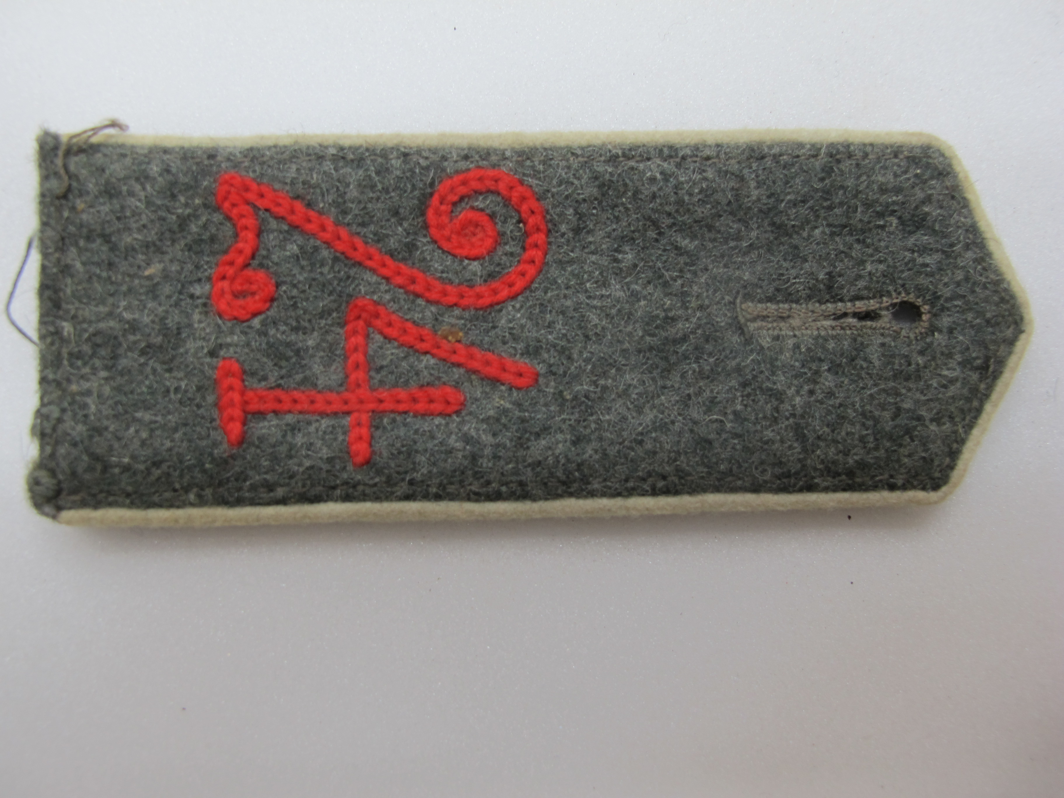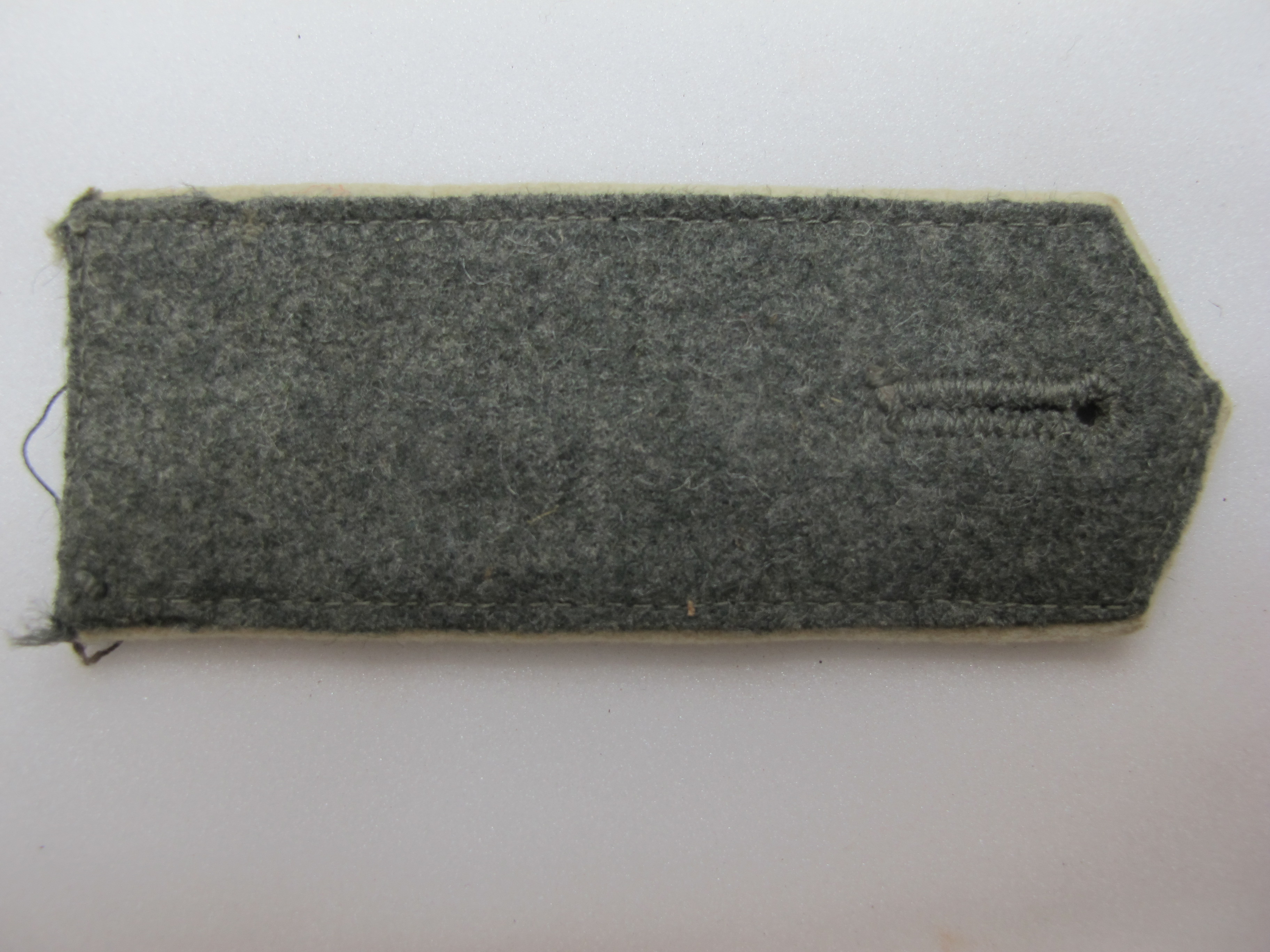 field grey shoulder strap with white piping; numeral 24 embroidered in red chain stitch; machine-stitched button-hole; plain same fabric reverse
