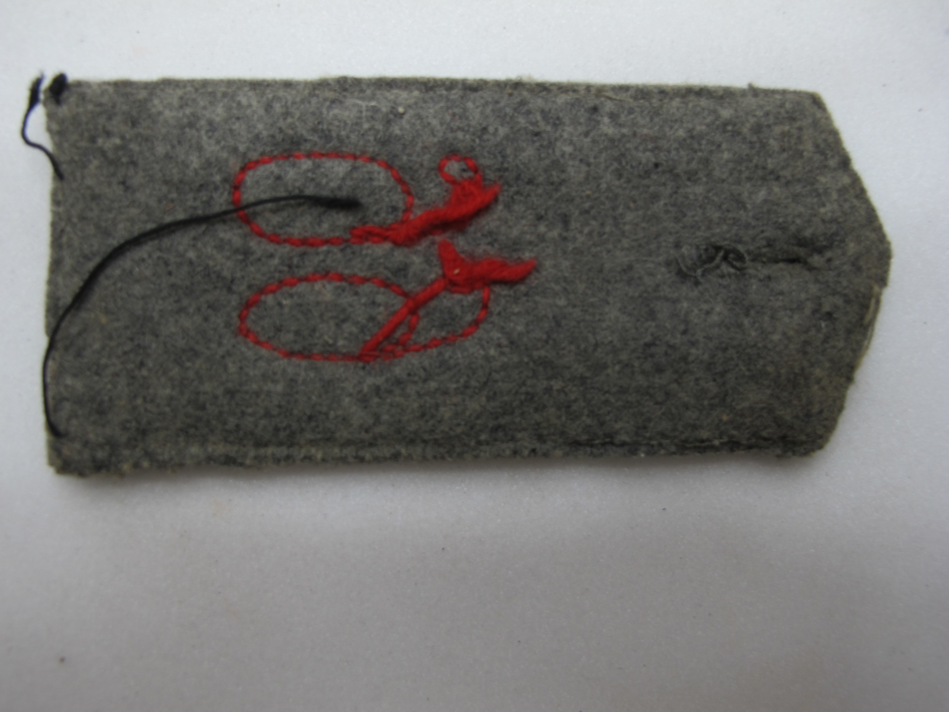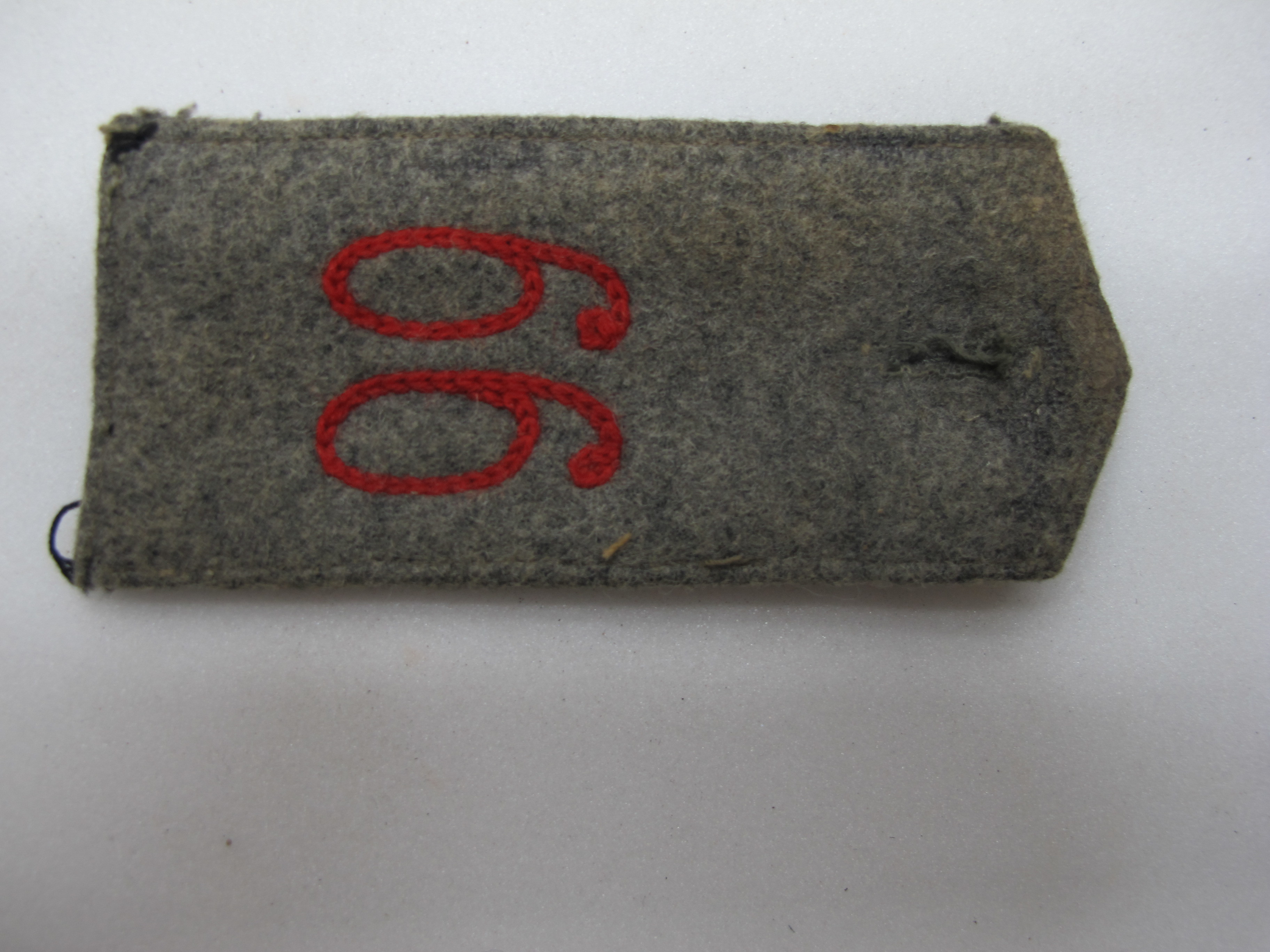 field grey shoulder strap; numeral 66 embroidered in red chain stitch; machine-stitched button-hole