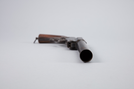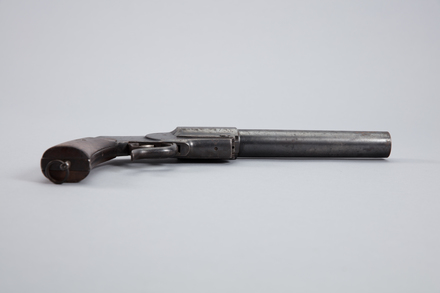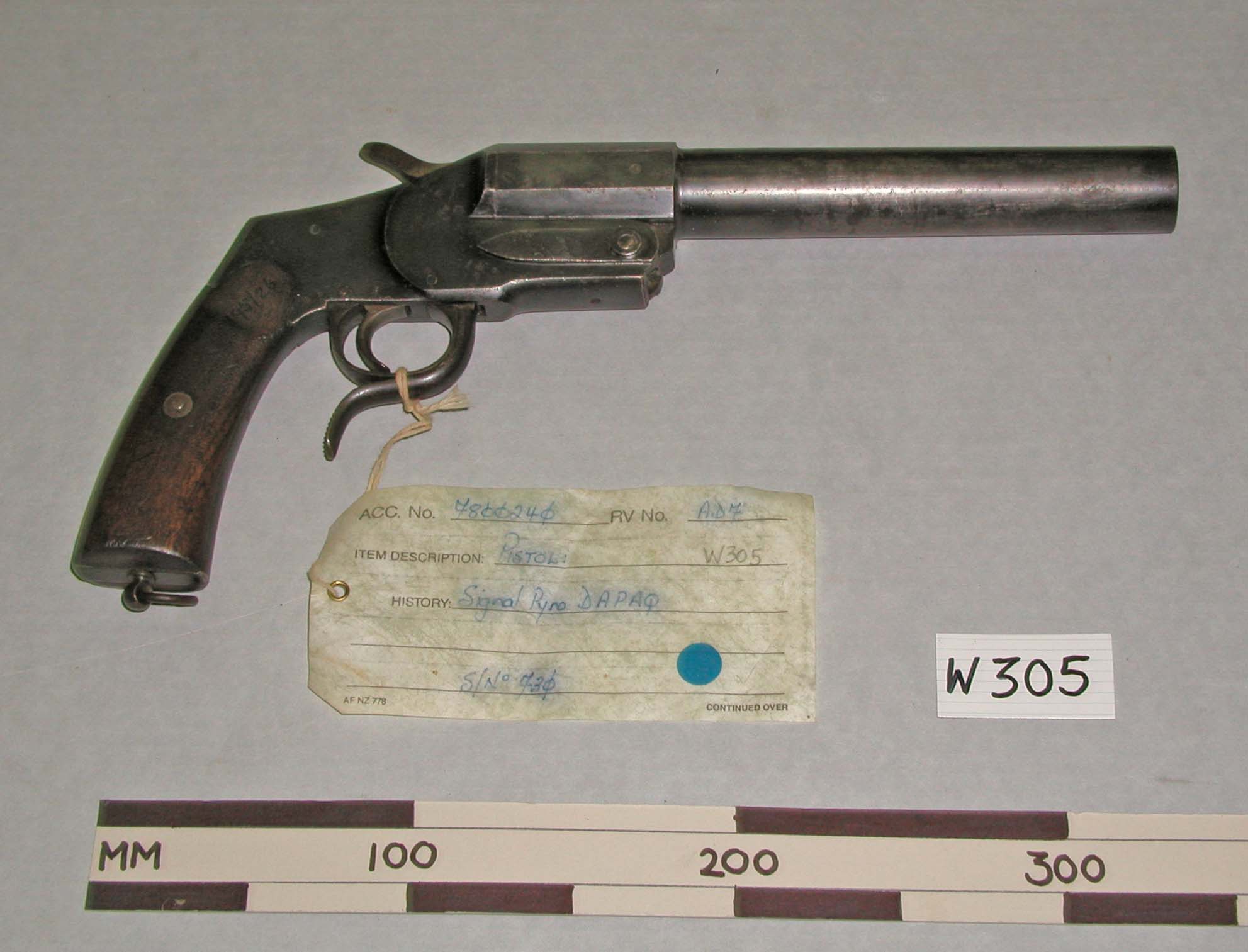 flare pistol; single smoothbore round barrel with octagonal breech; 26.5 mm calibre [1-1/16 inch bore]; under lever action; wooden two-piece grips held together with single screw at centre; lanyard ring at base