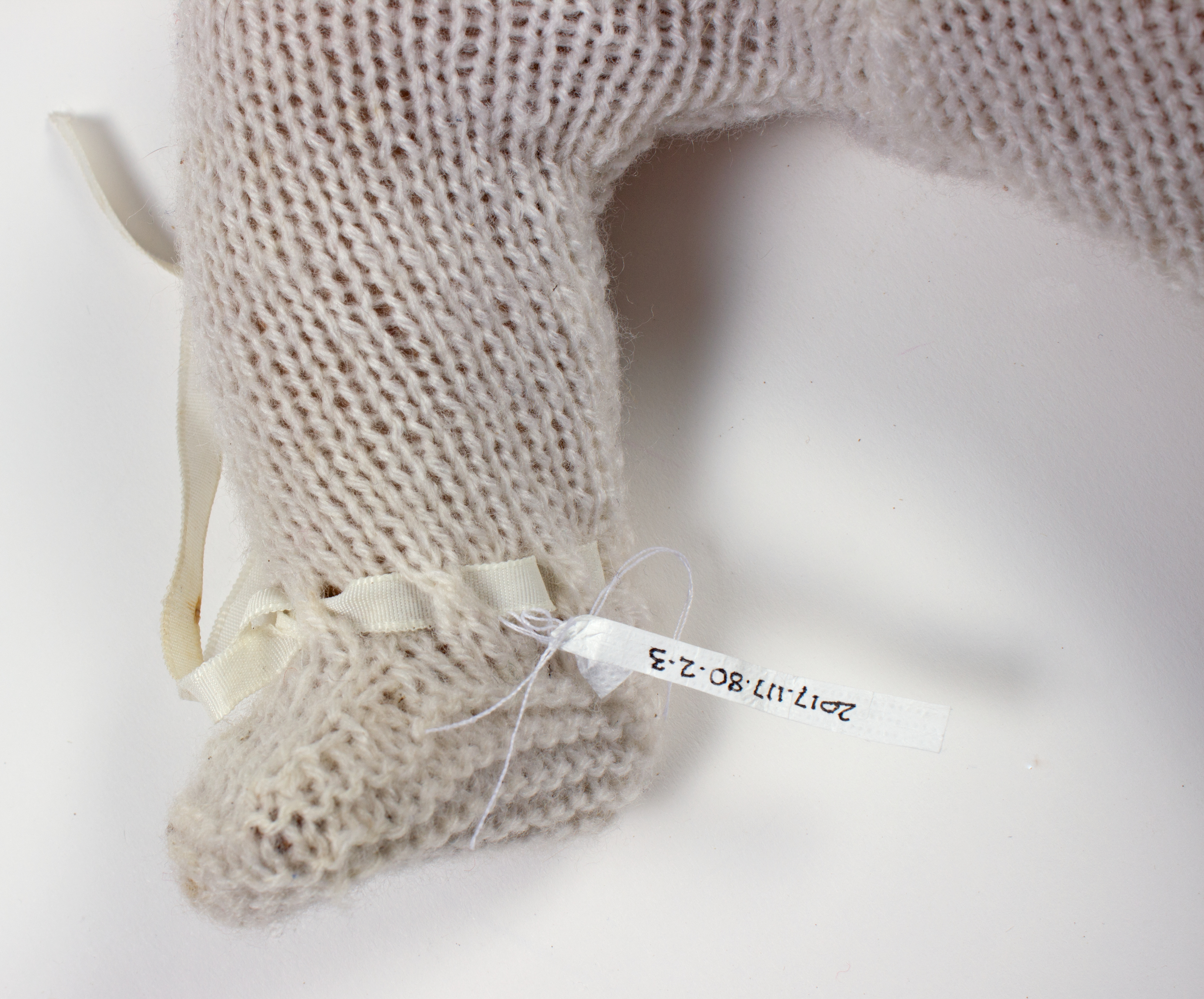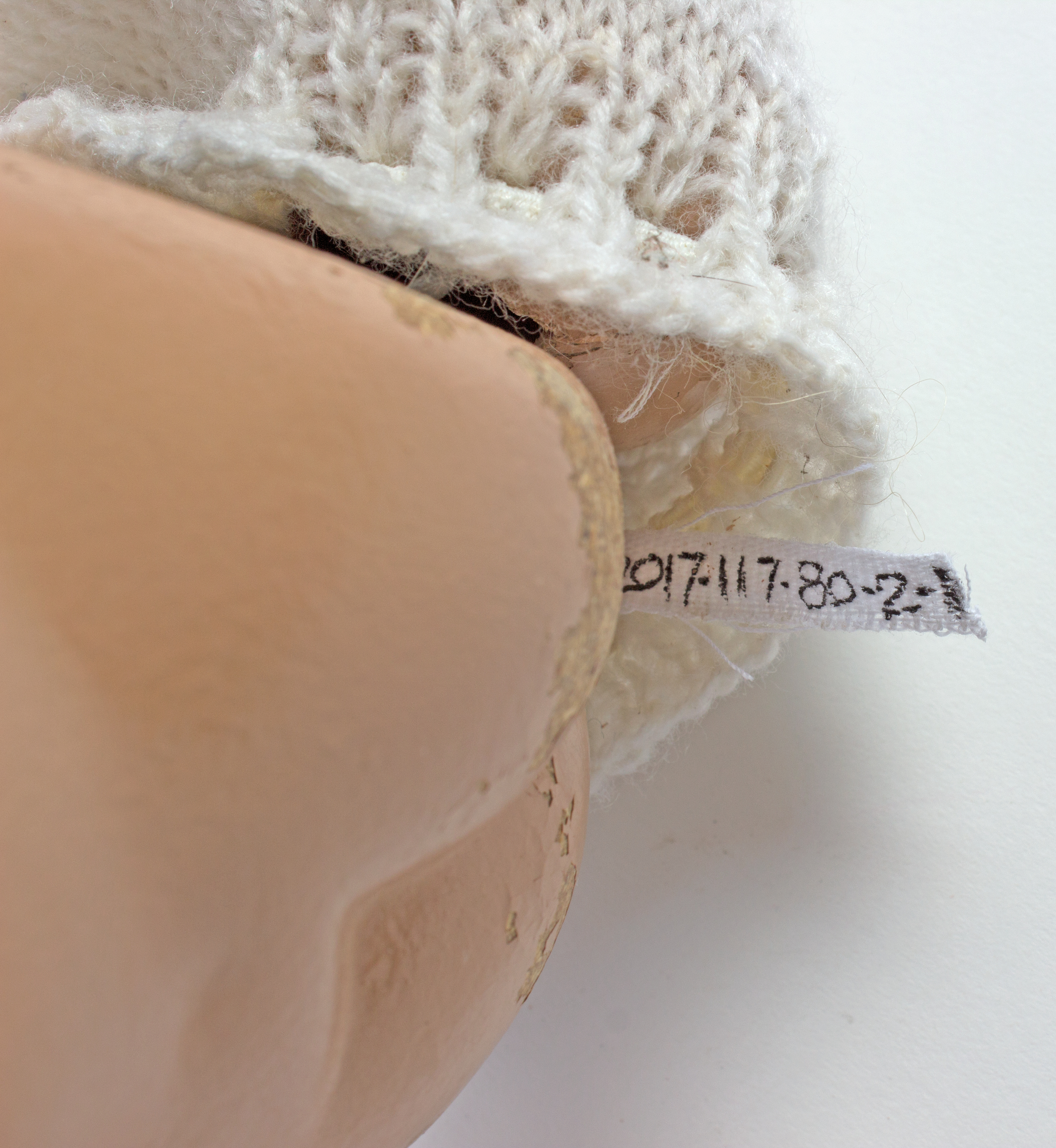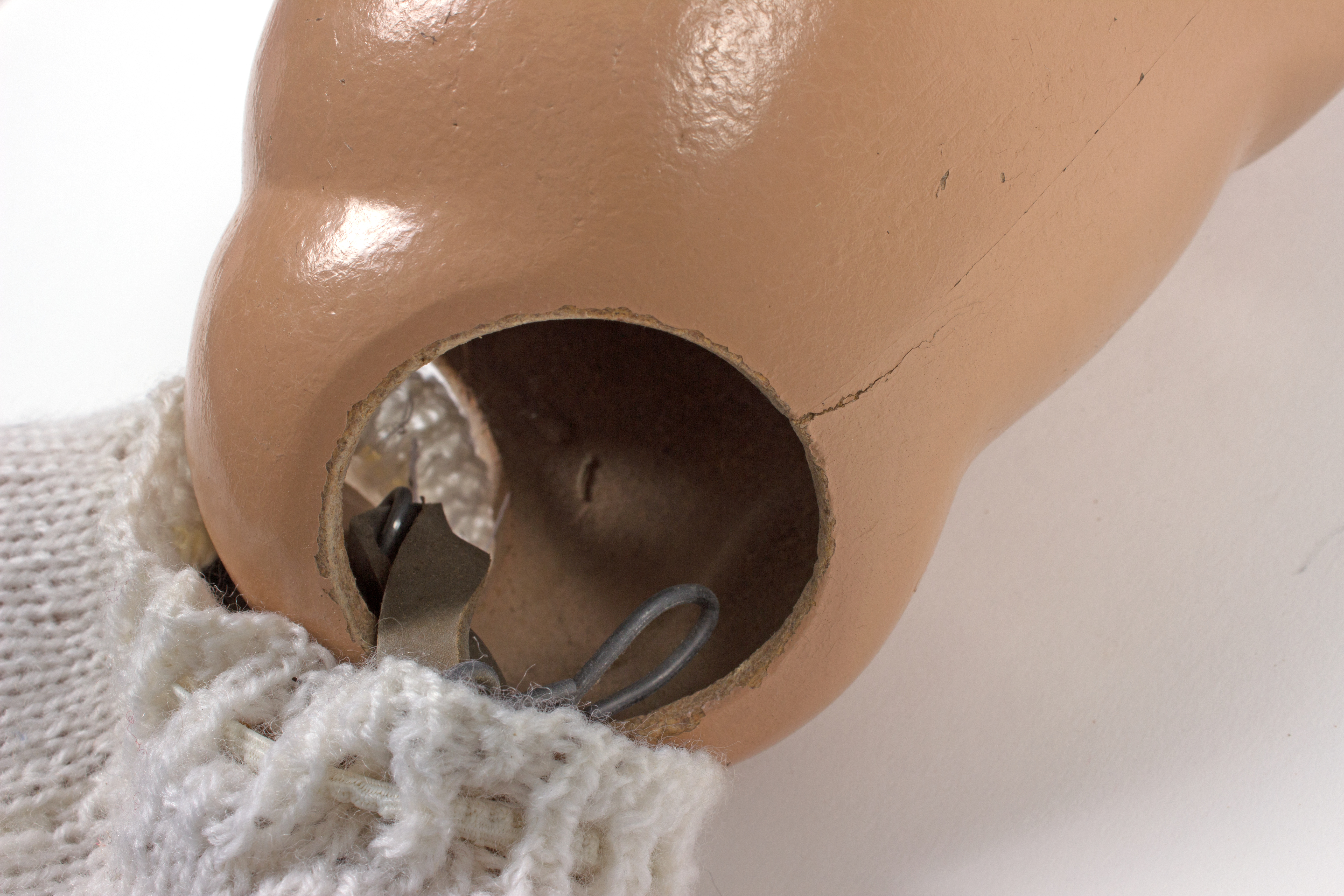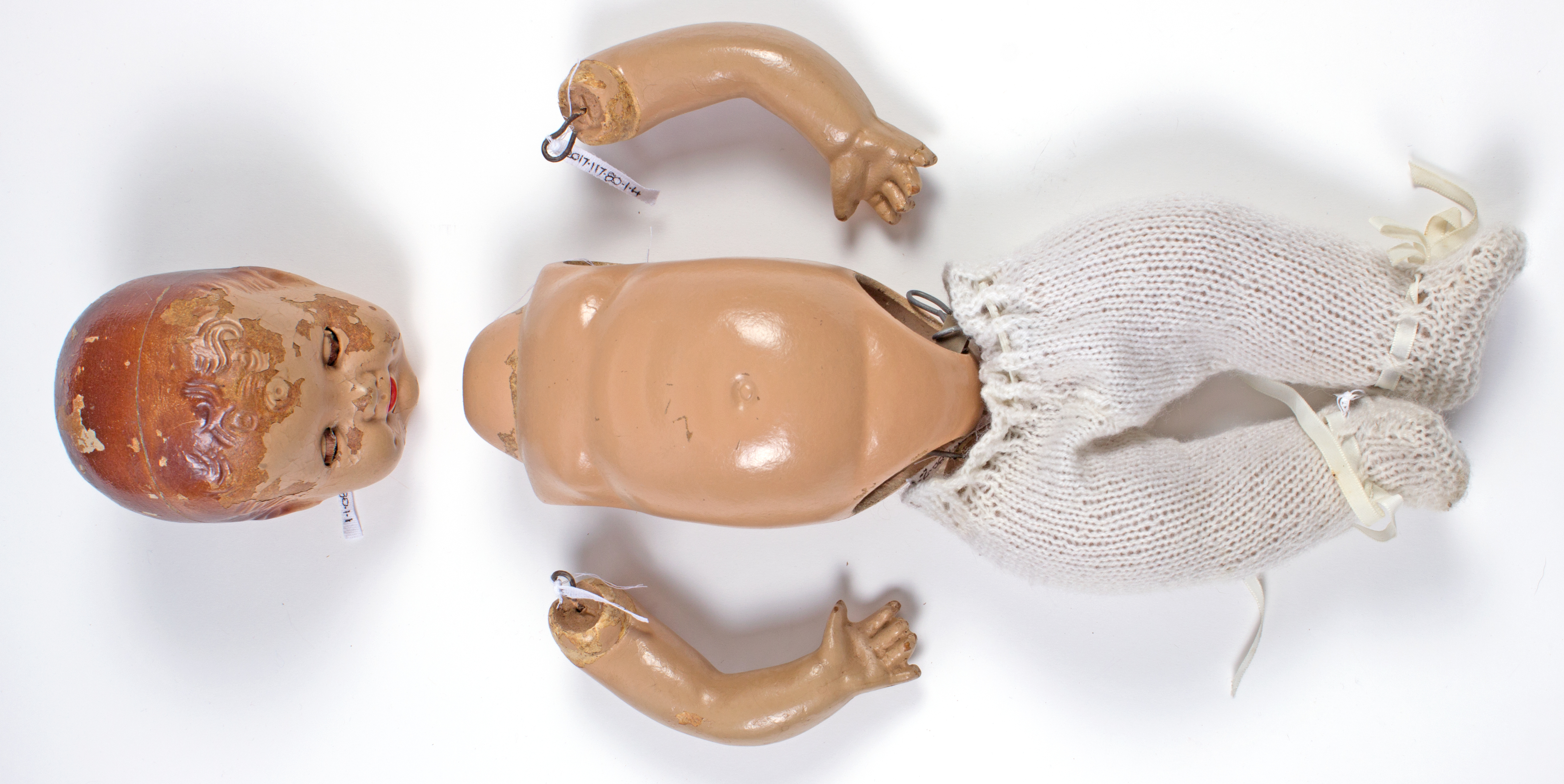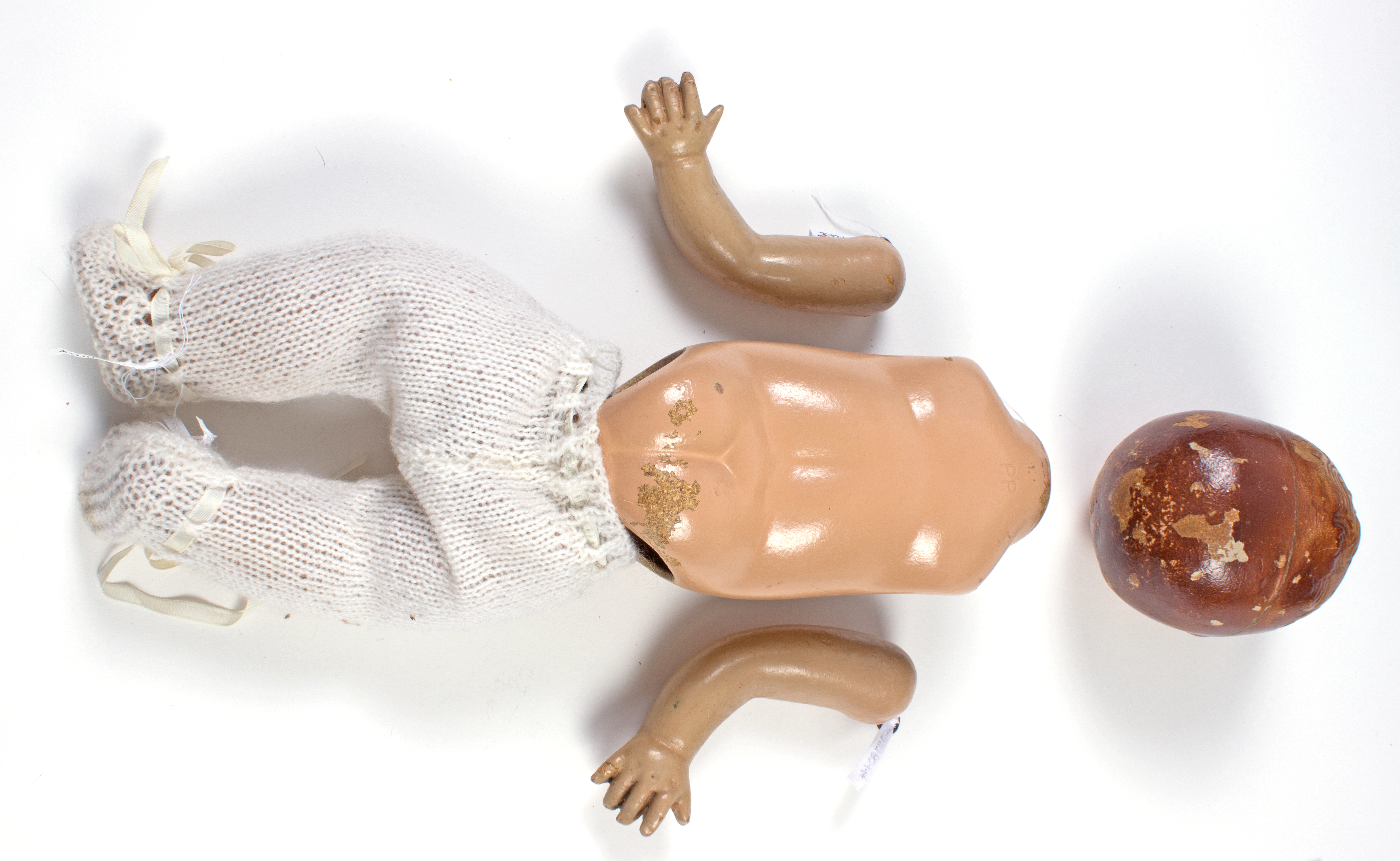 description composite head and body; lashed sleeping eyes; remnants of painted hair, mouth; currently in four pieces (head, body plus legs, arm 1, arm 2); knitted footed leggings