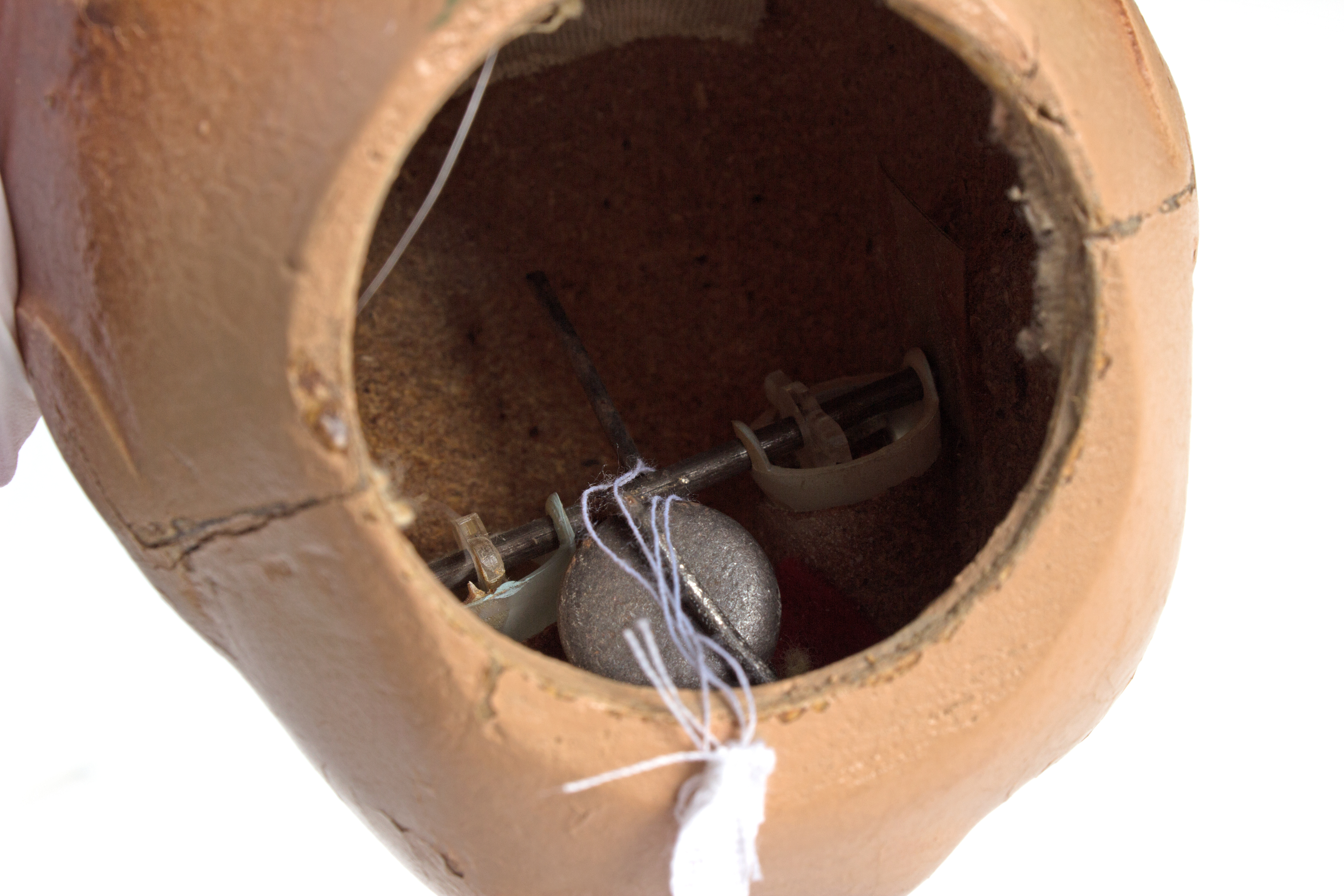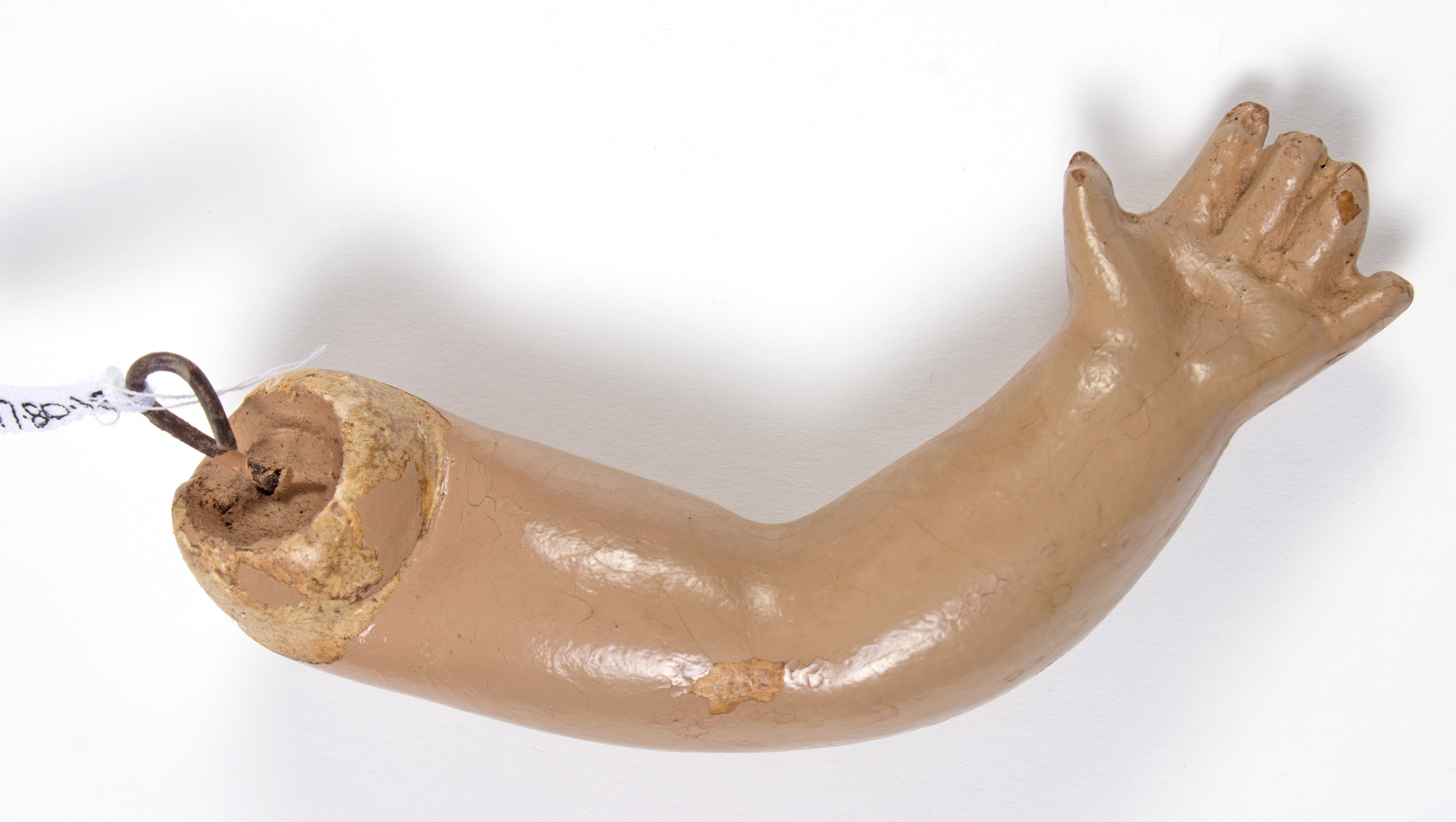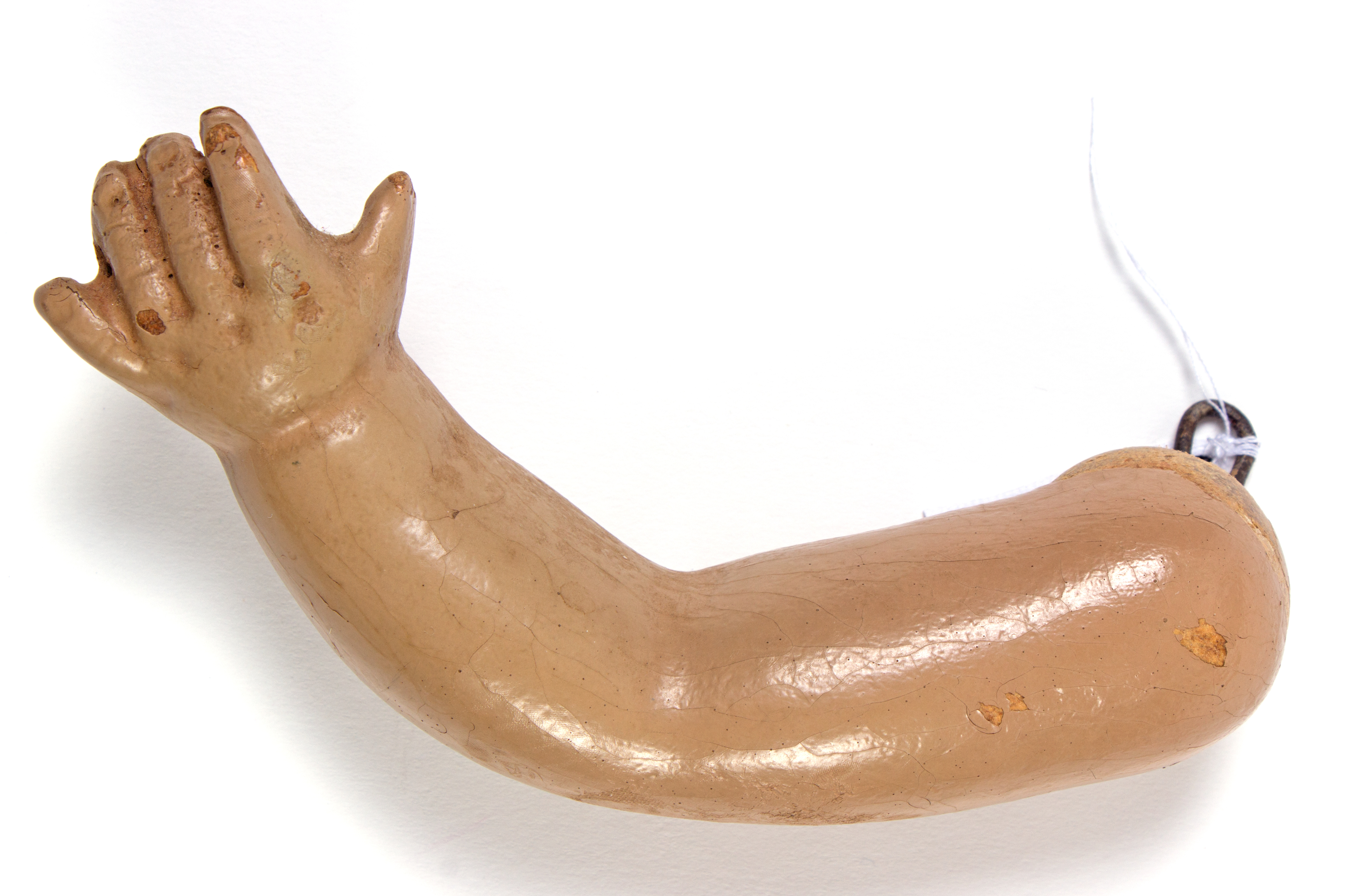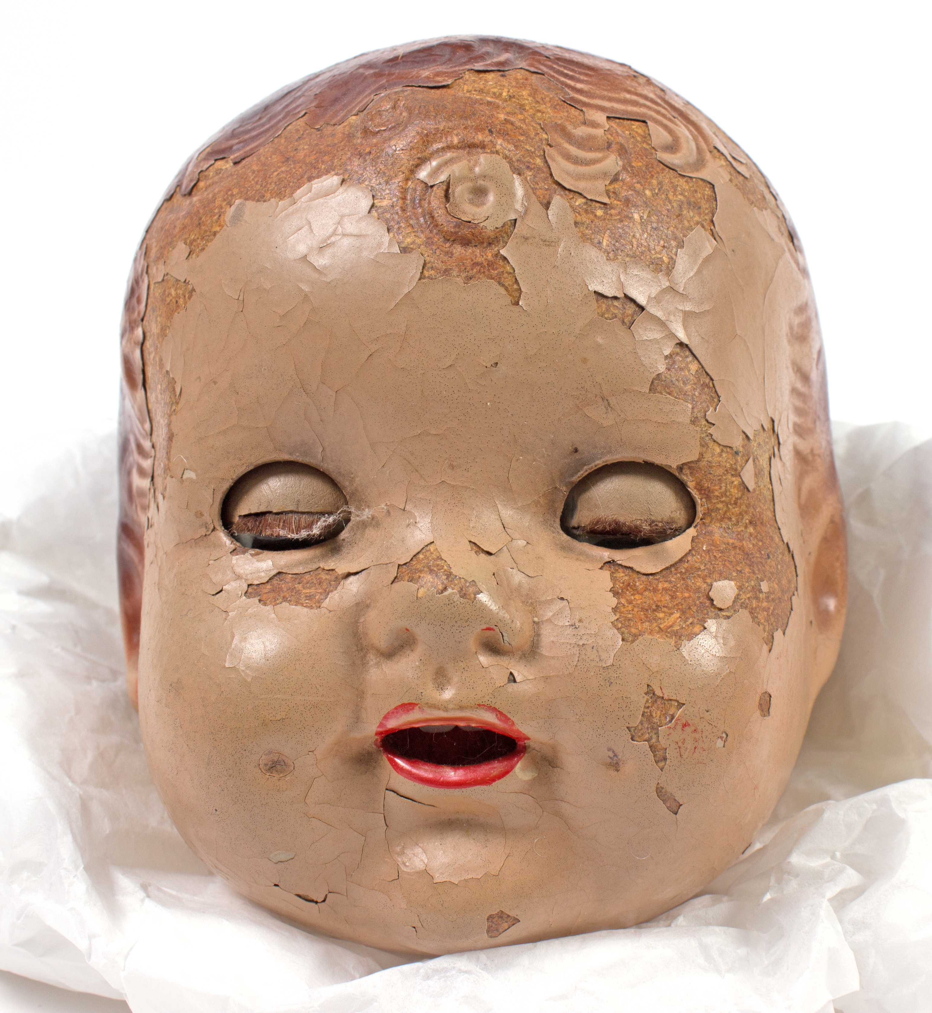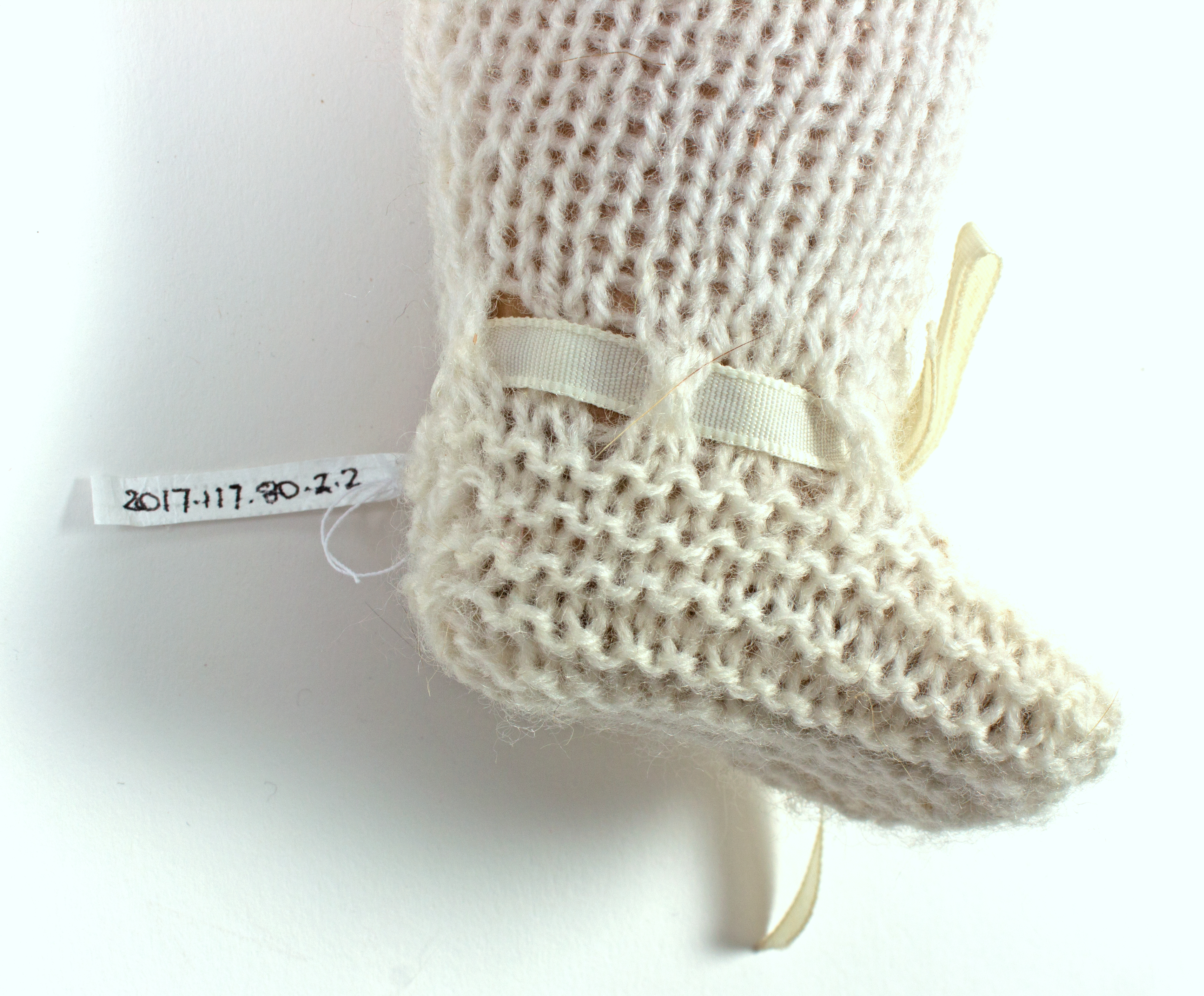 description composite head and body; lashed sleeping eyes; remnants of painted hair, mouth; currently in four pieces (head, body plus legs, arm 1, arm 2); knitted footed leggings