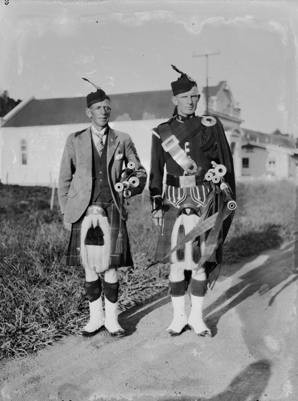 Full length portrait of two men dressed in traditional Scottish costume. They also each holding bagpipes. There is grass, and buildings, in the background.