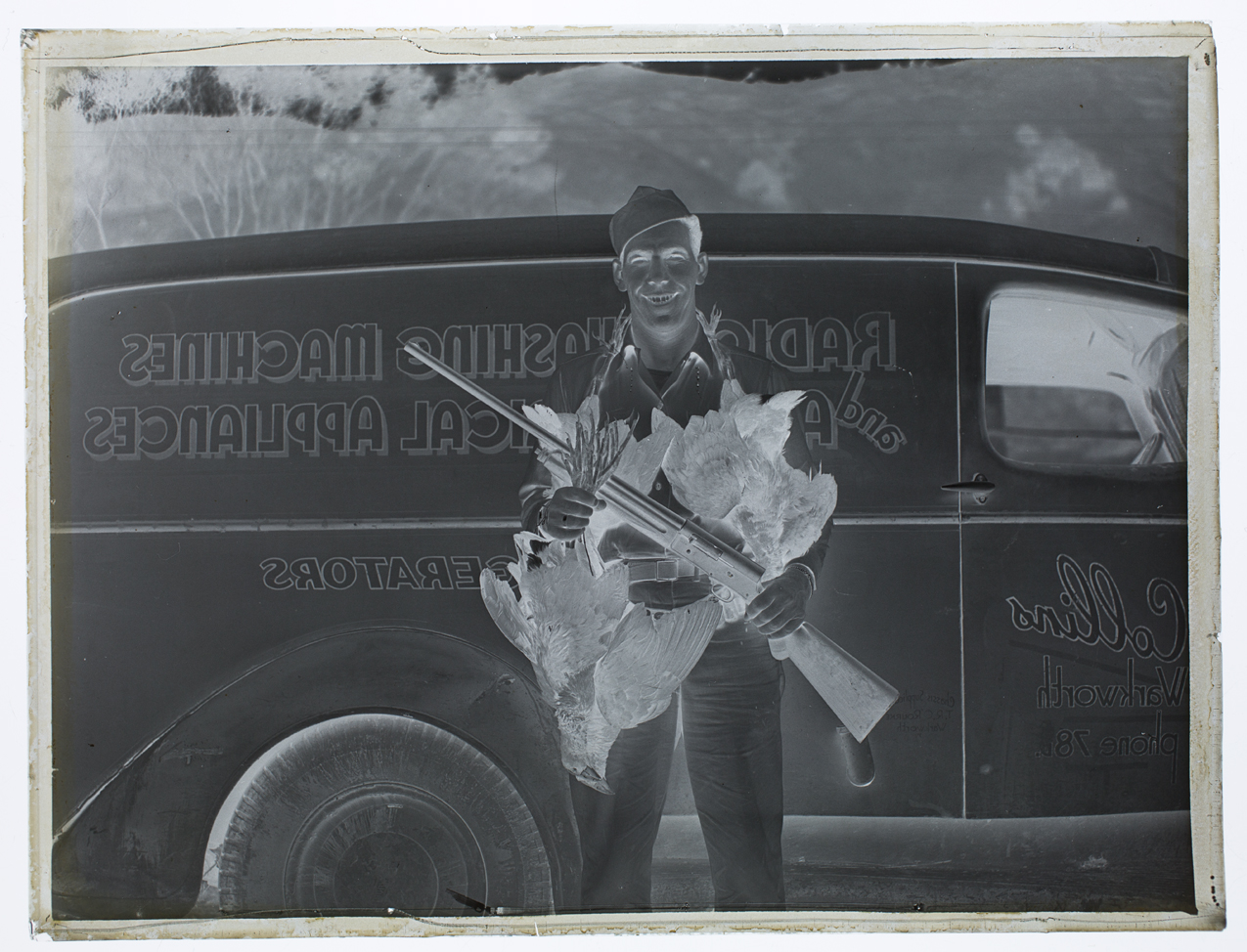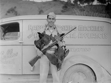 Portrait of a military serviceman standing in front of a vehicle. He is possibly of the U.S. Army. He is holding a rifle, or shotgun, and has dead pukeko (game), hanging around hs neck. "COLLINS WARKWORTH phone 78D. RADIO WASHING MACHINES and A[LL] [ELECTR]ICAL APPLIANCES [REFRI]GERATORS" is written on the vehicle. Hills and trees, are visible in the far background.